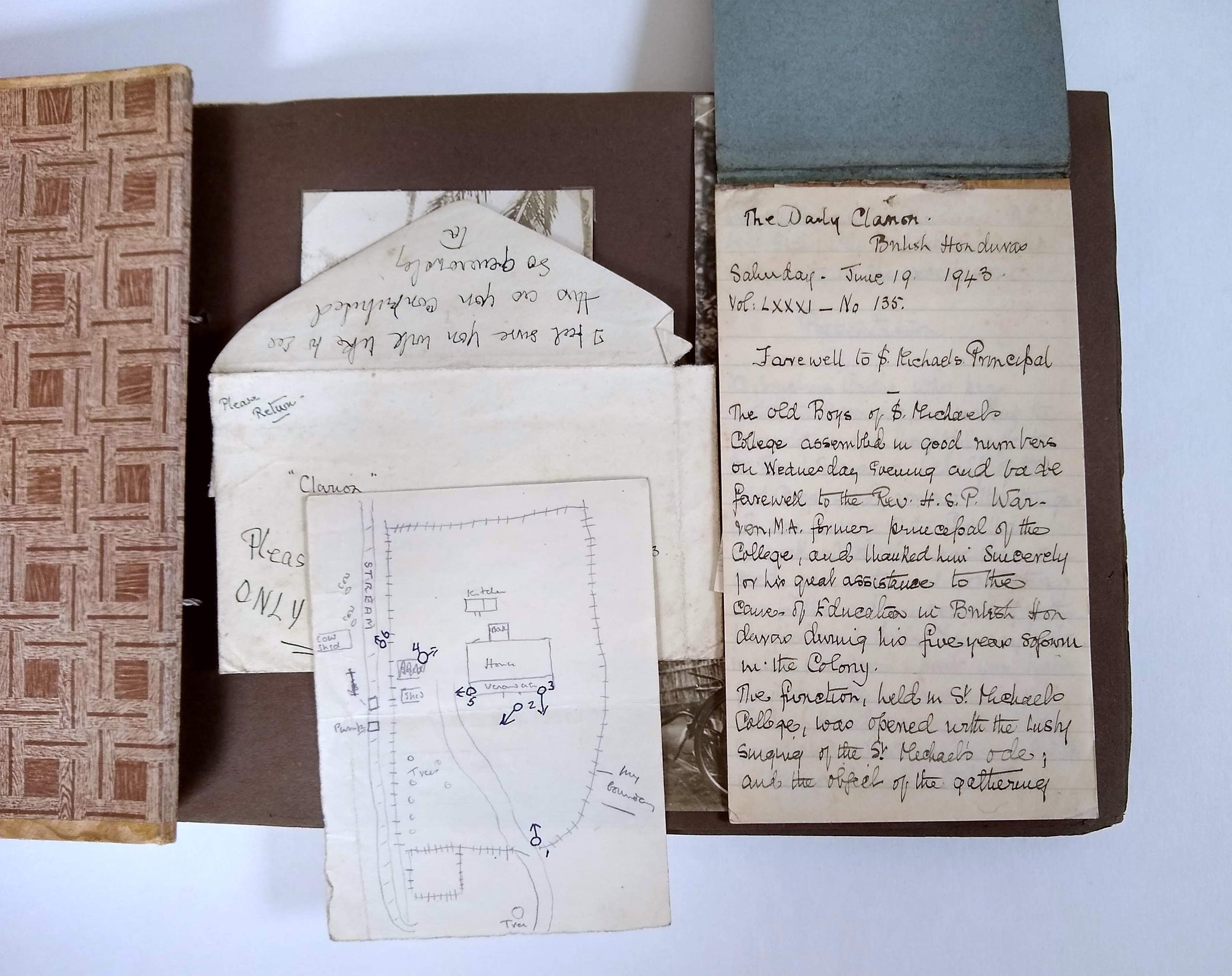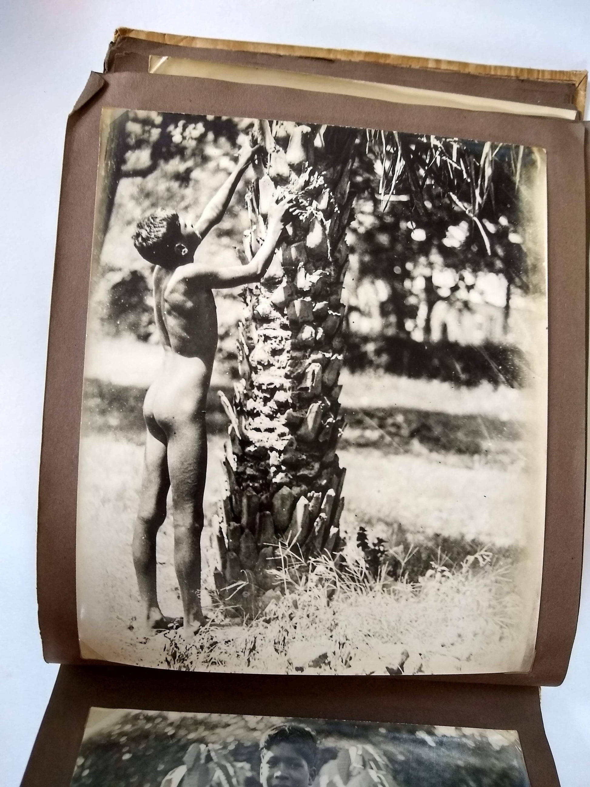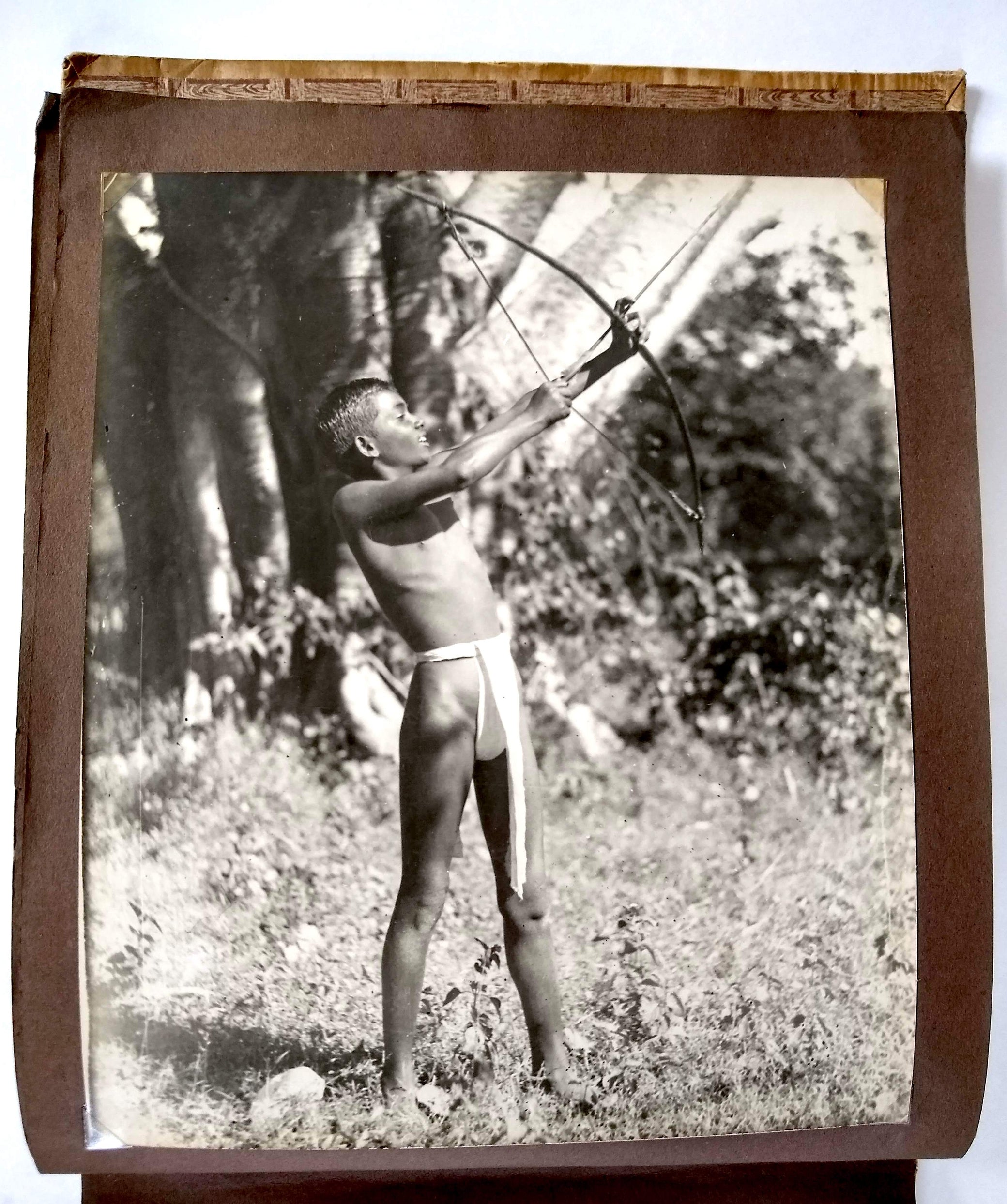 [Warren, Rev. H.S.P.]. Photograph Album, British Honduras [Belize], ca. 1938-1943? Oblong photo album with 43 photographs: 40 larger prints (22.6 x 18.8 cm) and 3 real photo postcards (approx. 14 x 19 cm). The former originally secured one per page via contemporary plastic photo corners which are now fragile or unusable, some images therefore partially or totally loose. Prints VG+. Three items laid-in: 1) a manuscript copy of an extract from Belize Town's The Daily Clarion, Vol. LXXI, No. 135, June 19, 1943, “Farewell to St. Michael's Principal”; 2) an envelope inscribed in the same hand to an unknown reader: “I feel sure you will like to see this as you contributed so generously to St. Michaels”; and 3) a greeting card with a hand-drawn map showing topography of a home as photographed (these photographs not present?). Two pages with empty corners. Remarkable and sometimes unsettling collection of portraits presumed to be taken by Father H.S.P. Warren, an Anglican priest in British Honduras (Belize). From 1938-1943, Warren was the principal of St. Michael's College, a boys’secondary school in Belize Town.* A skilled amateur photographer, Warren produced images with rich tones and self-conscious compositions in a quasi-Pictorialist style. The intimate scenes speak to a familiarity with his subjects, possibly encountered through church-sanctioned camps or other extracurricular activities related to his position at St. Michael's. Although some of the photographs depict children at play, laughing and making eye contact with the camera in European-style clothing, many are posed and profoundly exoticized andor eroticized. These scenes reproduce a troubling, colonial vision of Central American people, and use certain props—a bow and arrow, textiles and loincloths—to represent a generalized “Indian” ethnicity. Warren's imagined indigenous subject was particularly tenuous in the territories of British Honduras. Largely abandoned by the Maya before the European encounter, its self-described mestizo and Creole populations descend from Afro-Caribbean, Garifuna, Maya, East Indian, Spanish, and British ancestry. The vague “otherness” of the pictures reveal how fictive Central American racial identities were created within the European imagination, replacing real, lived hierarchies of economic and political repression. The album is an important example for the evolving study of the relationship between colonial photographers and their subjects, demonstrating both the exploitative potential of the lens and its more nuanced history as a “medium of interaction between white settlers and indigenous peoples, shaping the social processes of identity formation and cultural exchange.” Despite the obvious problems of objectification, photographic archives such as this one have become critically important forms of memory in the context of colonial dispossession and loss. Photographic documentation from Belize in this period is scarce and underrepresented in relevant area studies collections in North America. SOLD*Now part of the coeducational Anglican Cathedral College in Belize City.
