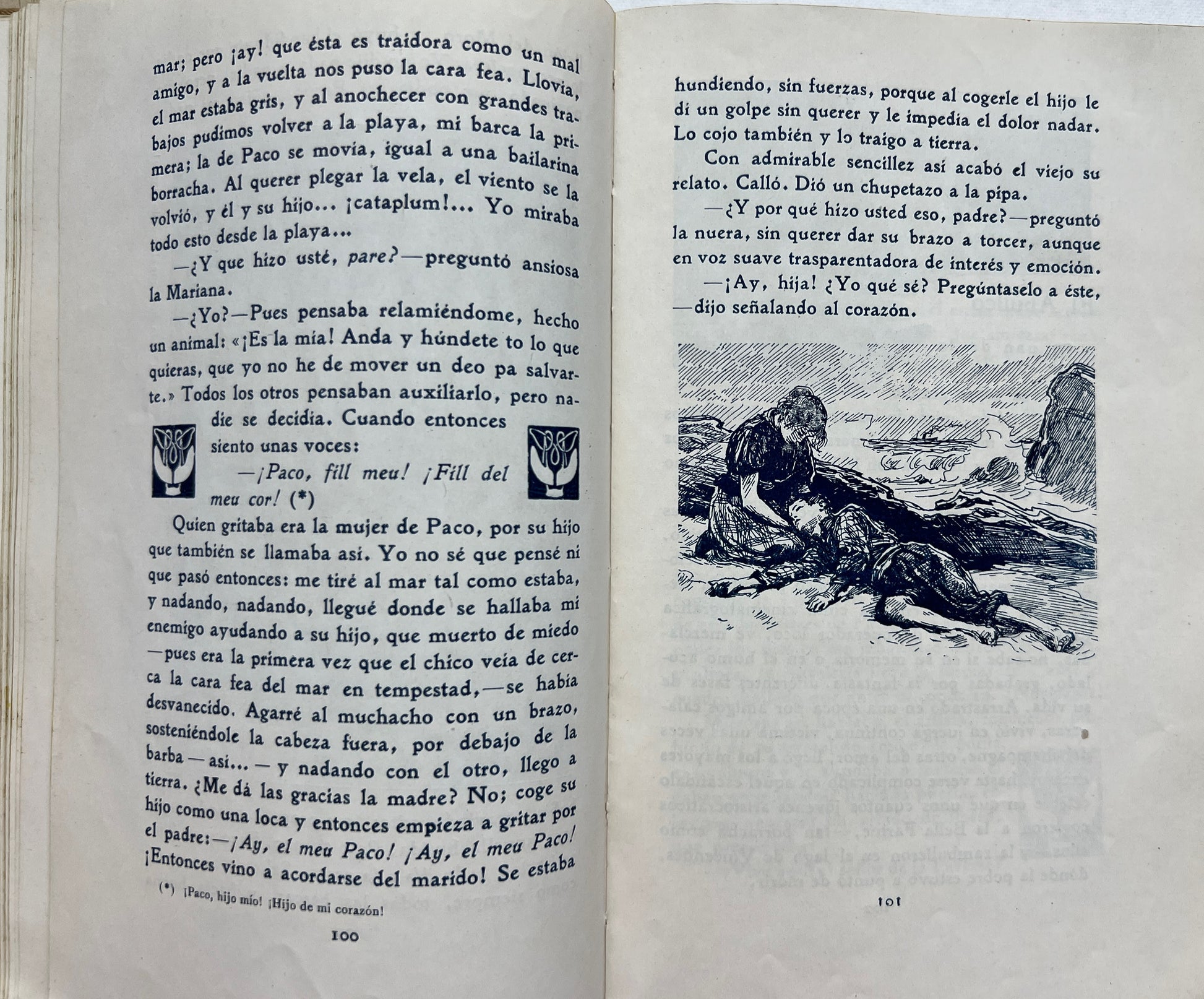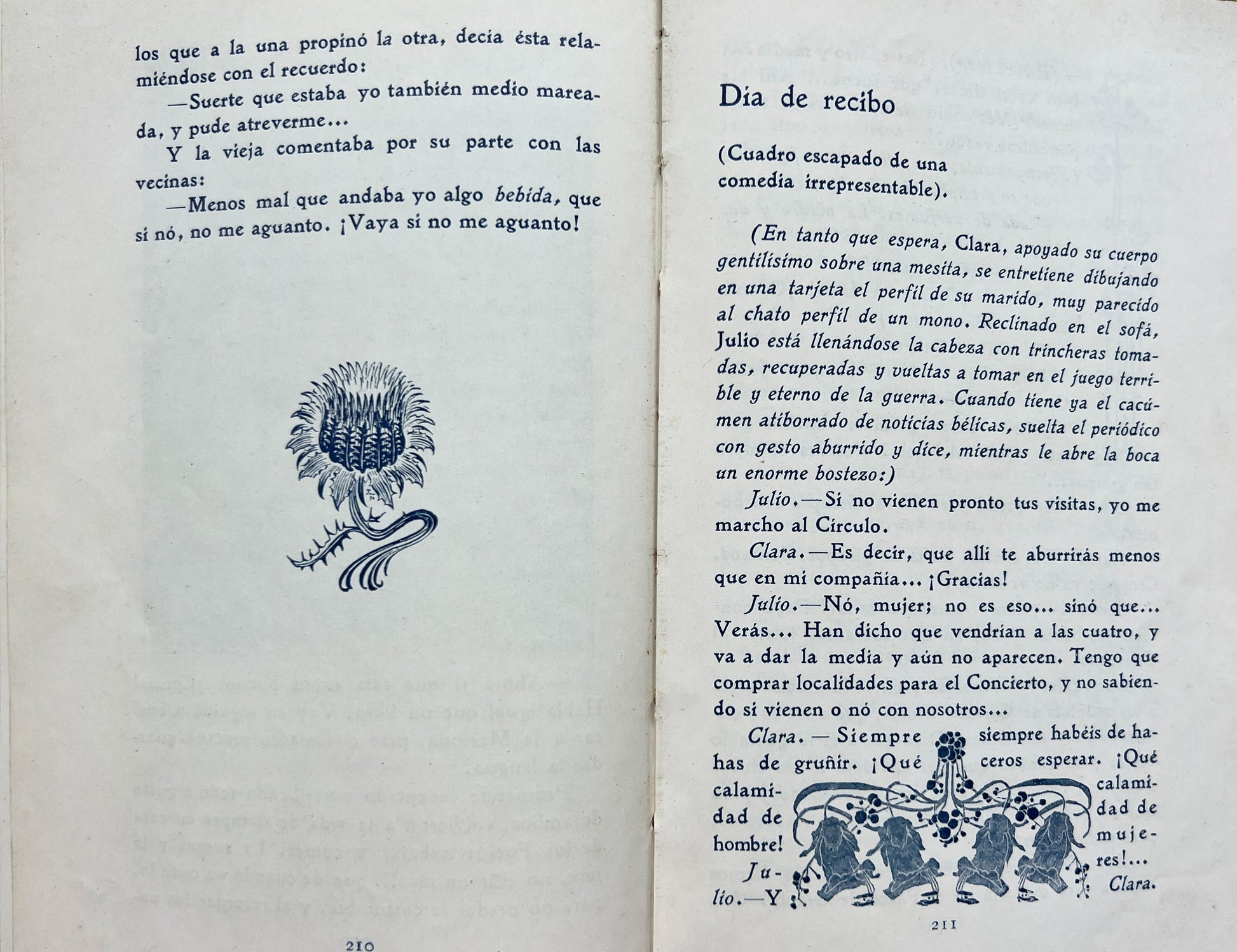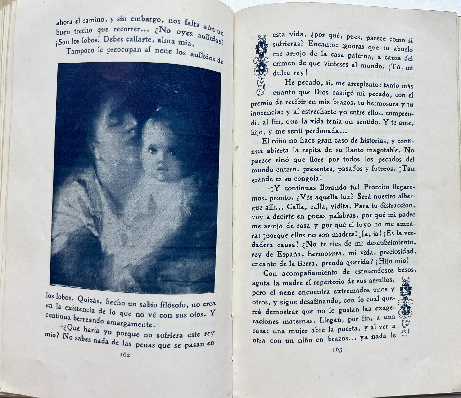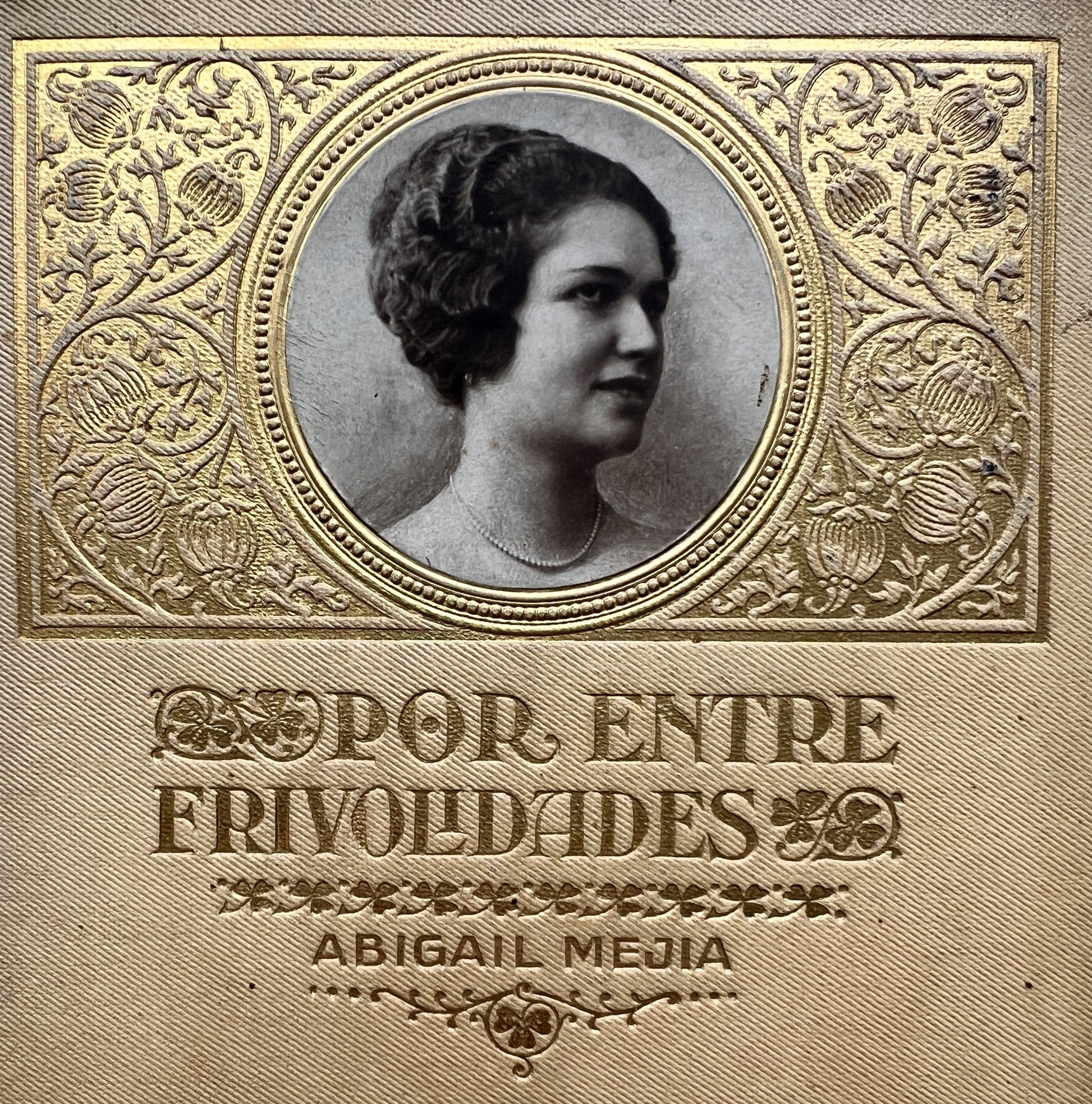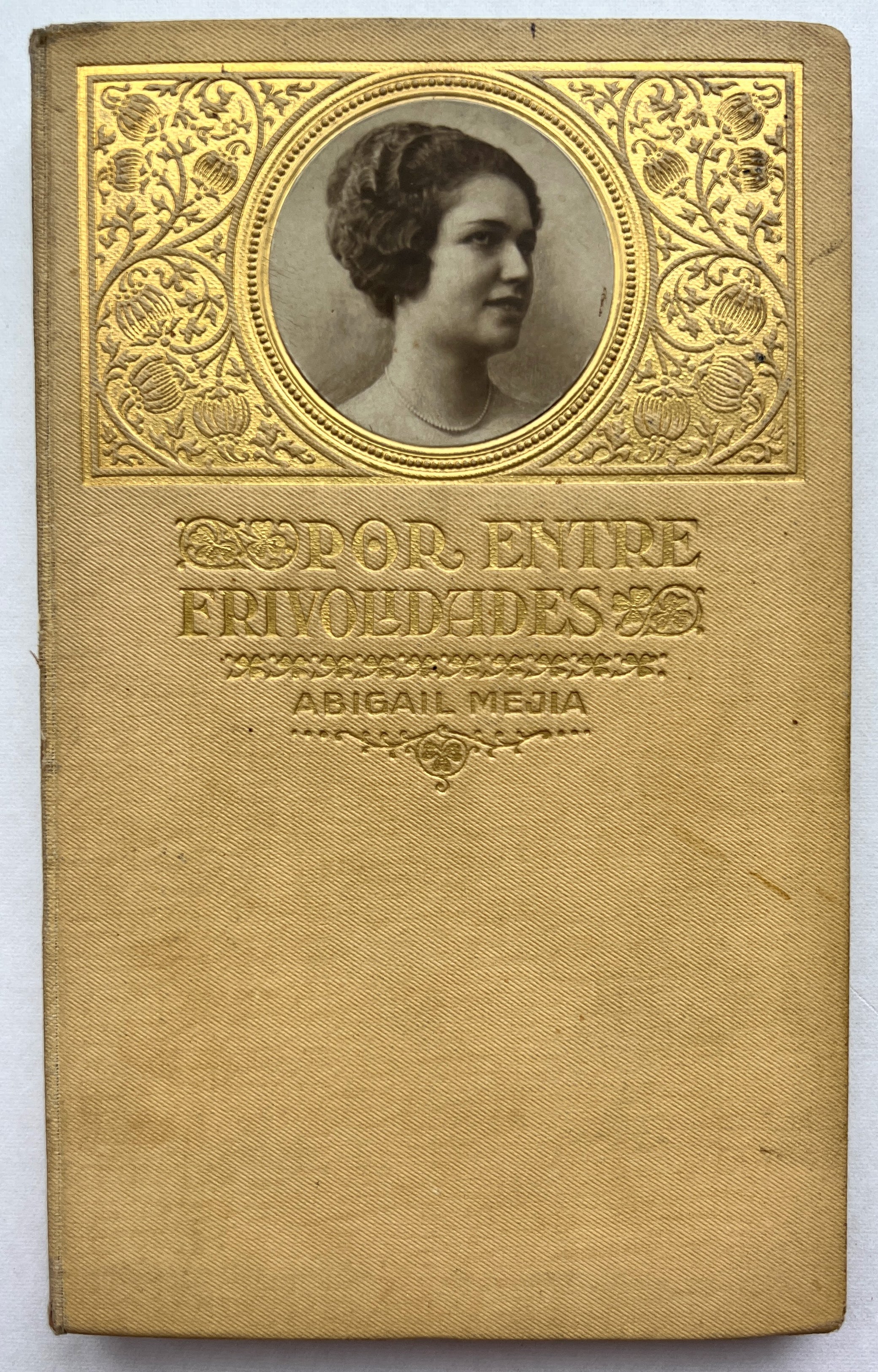 Mejía, Abigail. Por Entre Frivolidades. Barcelona: Hermenegildo Miralles, 1922. 19.2 cm, 232, [6] pp.; color half-title, numerous printer's ornaments, and illus. reproducing artwork and images from other sources; in embossed pictorial cloth with Mejia's portrait laid-in recto, marbled fore edges, decorative endpapers, rear FEP with small chip, hinges weakened, final signature tightly sewn but beginning to separate.