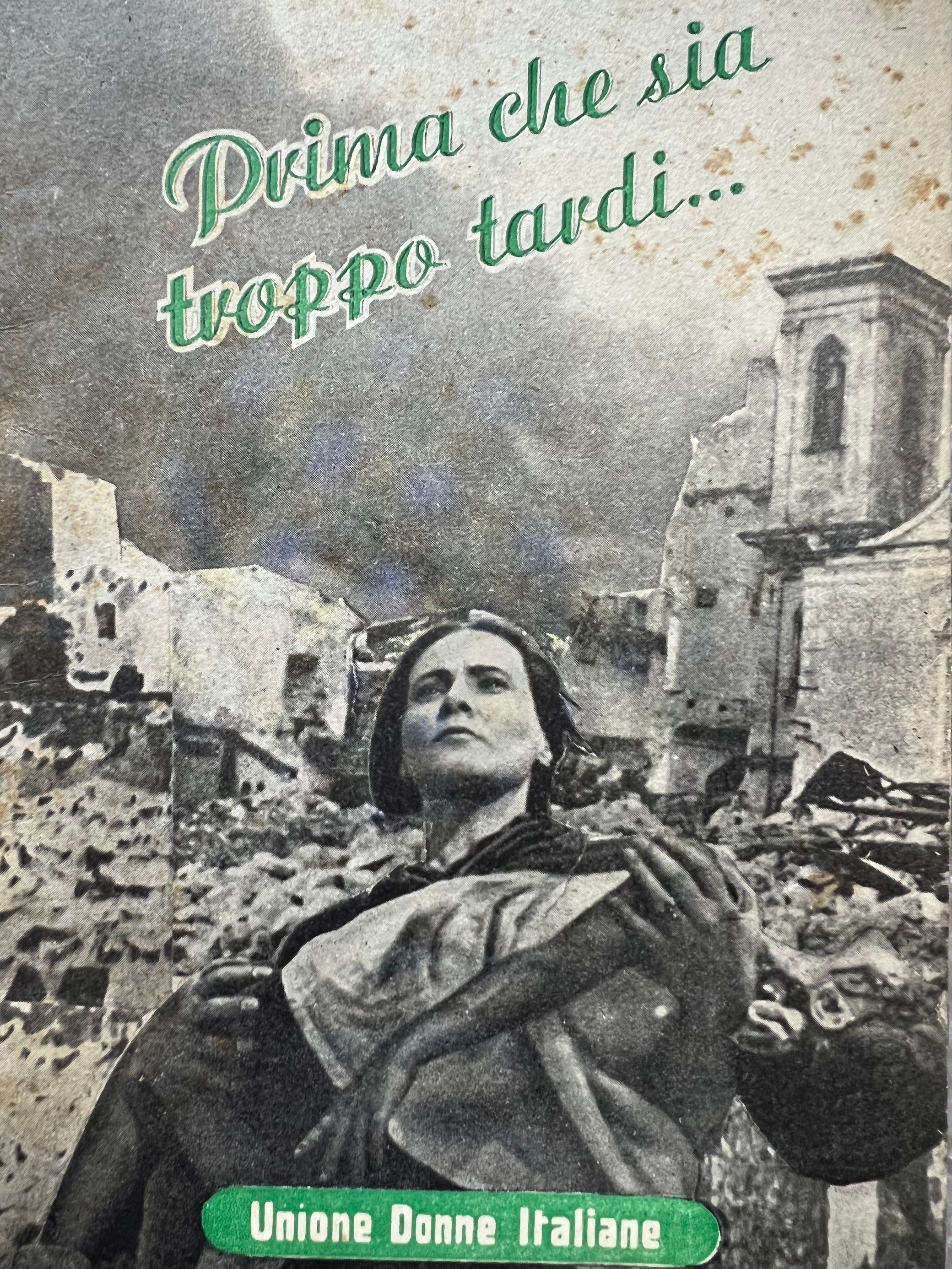 Unione Donne Italiane. Prima che sia troppo tardi ... Florence: A.G.A.F., n.d. [ca. 1950]. 16.8 x 12.2 cm, 19 pp.; three bw full-page illus., one half-page, newsprint toned; in stapled stiff card pictorial wrappers, sl. foxed, cover illus. with photomontage, rear wrapper with advertisement for the UDI's weekly Noi Donne. Otherwise unrecorded anti-nuclear, anti-war booklet by the national Italian feminist union, Unione Donne Italiane. UDI emerged from the women's resistance movement during WWII; the text enumerates the enormous losses suffered across the world during the war focusing particularly on wounded and orphaned children, whom they organized to support in the late 1940s. The rest of the text is dedicated to the atrocities at Hiroshima and Nagasaki and advocates against nuclear arms. Rare documentation of the early solidarity platform of the UDI. SOLD
