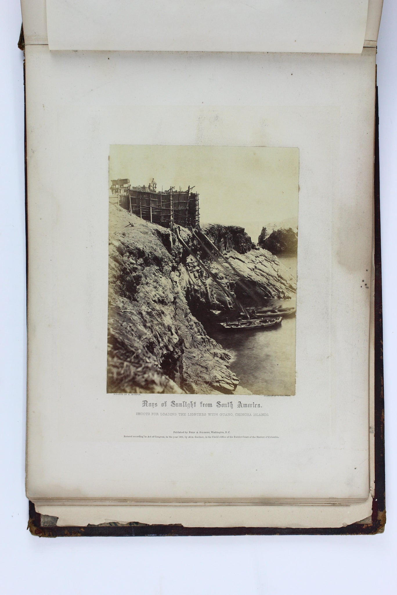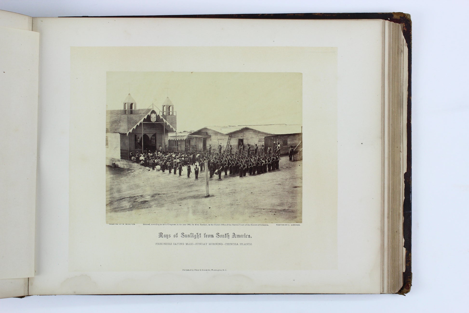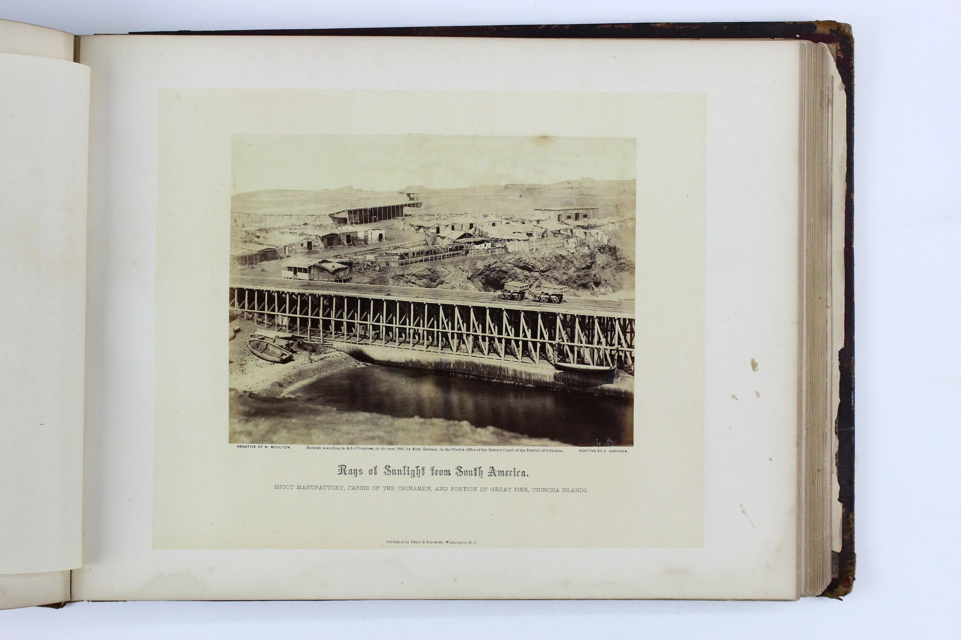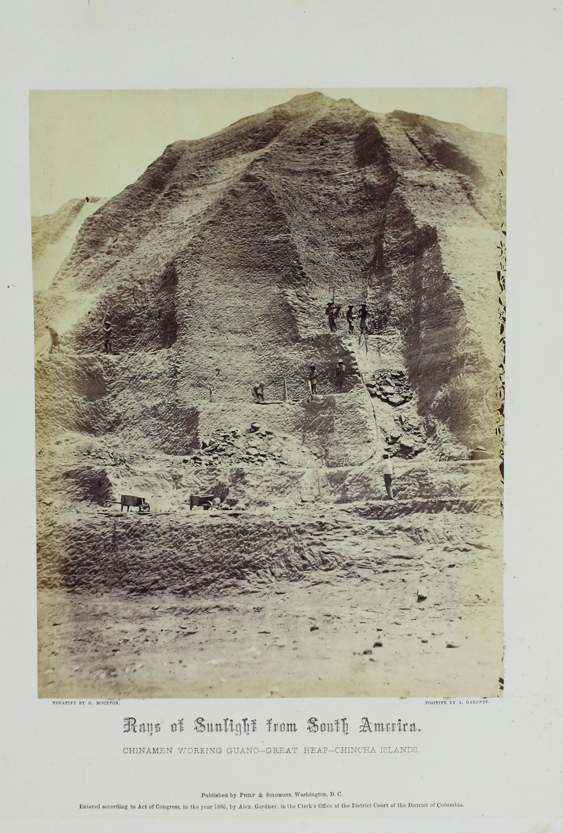 Gardner, Alexander [and Henry De Witt Moulton]. Rays of Sunlight from South America. Washington, D.C.: Philp and Solomons, 1865. Oblong folio with 68 of the 70 original plates. Each with albumen print mounted recto, image approx. 17.2 x 22.5 cm, with letterpress caption and credits (Gardener for the “positive”; Moulton for the “negative”) on mount. Some mounts with minor soiling or damp stain to edges, not affecting images. Lacking front album cover, title page, preface and 2 plates (nos. [1] and [2]). Monumental photographic album printed by famed Civil War photographer Alexander Gardner from negatives by an itinerant American photographer, Henry De Witt Moulton. Moulton's photos of Lima and the Chincha Islands were taken while he was living in Peru, sometime between 1860 and mid-1863, when he returned to the US. The size of the edition is unknown, though it was printed around the same time as Gardner's Photographic Sketch Book of the War (and advertised with it in early 1866), copies are exceedingly rare. The album's significance has been chronically underestimated. It provides fascinating transnational and bibliographic context for the better known Photographic Sketch Book, and comprises the most comprehensive photographic evidence of the historic guano deposits and the laborers who worked them. Gardener's selection of 38 (36 in the present copy) views of Lima and Callao for the opening section of Rays of Sunlight largely follow other contemporary images of the capital's major monuments. The extraordinary nature of the album lies instead in Gardner's addition of 32 of Moulton's unique “views of those celebrated Islands situated within the rainless region of the Peruvian Coast, and which furnish the richest fertilizing material known to agriculture.”* In the early 1860s the Chincha Islands’guano heaps were the world's most important source of fertilizer. Revenues from the nationalized deposits paid for much of Peru's public works from 1840-1870, including construction of the railways that crossed the Andes. Even more importantly, guano income was used by the state to free its black slaves and to abolish poll taxes on indigenous citizens. Despite these progressive measures, the Chincha Islands’guano piles were worked by prisoners and indentured Chinese laborers who were brought to Peru in large numbers under a policy known as Ley China to replace freed slaves in all aspects of industry and agriculture. Nearly half died from ill-treatment and overwork in one of the lesser-known and grim episodes of British Imperial human trafficking. Moulton's “most interesting images concerned the soon to be depleted guano itself and the process used to exploit it.” His dramatic photos are the primary source for nearly all the existing photographic evidence of the Islands and the people who worked there, including scenes of the “Great Heap” with workmen loading rail cars, others of craft transporting the cargo to ships and piers, and poignant images of the laborers who Moulton seems to have seen as victims of exploitation. A small church for the workers appears three times; in one the prisoner-laborers are surrounded by armed soldiers while they kneel outside during Sunday services. Gardner's rich contact prints preserve these minute details and the subtle value transitions captured in Moulton's negatives. In April 1864, just before Gardner assembled the album, the Chincha Islands became an object of great concern for the US when Spain seized them “as part of European efforts to re-establish colonial rule in South America while the United States was preoccupied with its Civil War.” He foresaw the historical value of the work when he wrote in his preface “In after times, these sketches of the Chincha Islands will have a peculiar interest [...] The original estimate of the length of time—one thousand years—that this deposit of the Chincha Islands would suffice for the wants of the world, is destined to prove fallacious. So great has become the demand for it that half the deposit of the largest island has been removed already; and the probabilities are, that in twenty years the supply will be exhausted.” Four copies are recorded in three public collections: the Library of Congress, the New York Public Library, and the Public Library of Cincinnati. Two other copies have come to auction in the last 30 years. The most recent, a complete copy offered at Swann, sold for $35,000 in 2012. $18,000 Isabelle Lausent-Herrera (2009). Tusans (tusheng) and the Changing Chinese Community in Peru. Journal of Chinese Overseas 5: 116. Keith McElroy (1984). Henry De Witt Moulton: Rays of sunlight from South America. History of Photography, 8:1, 7-21.