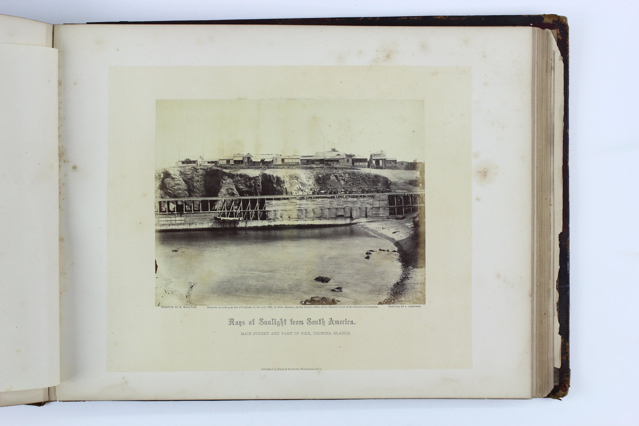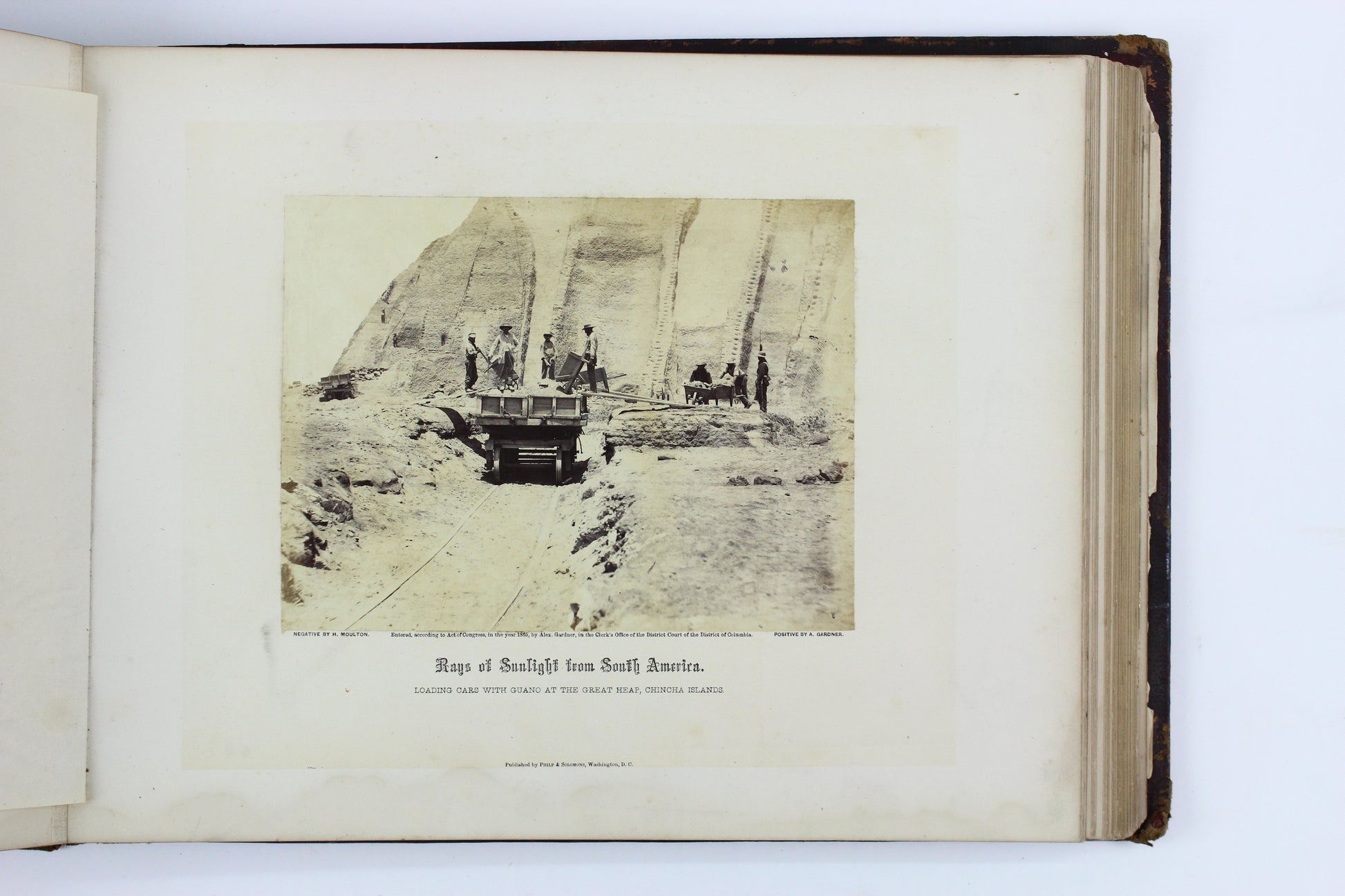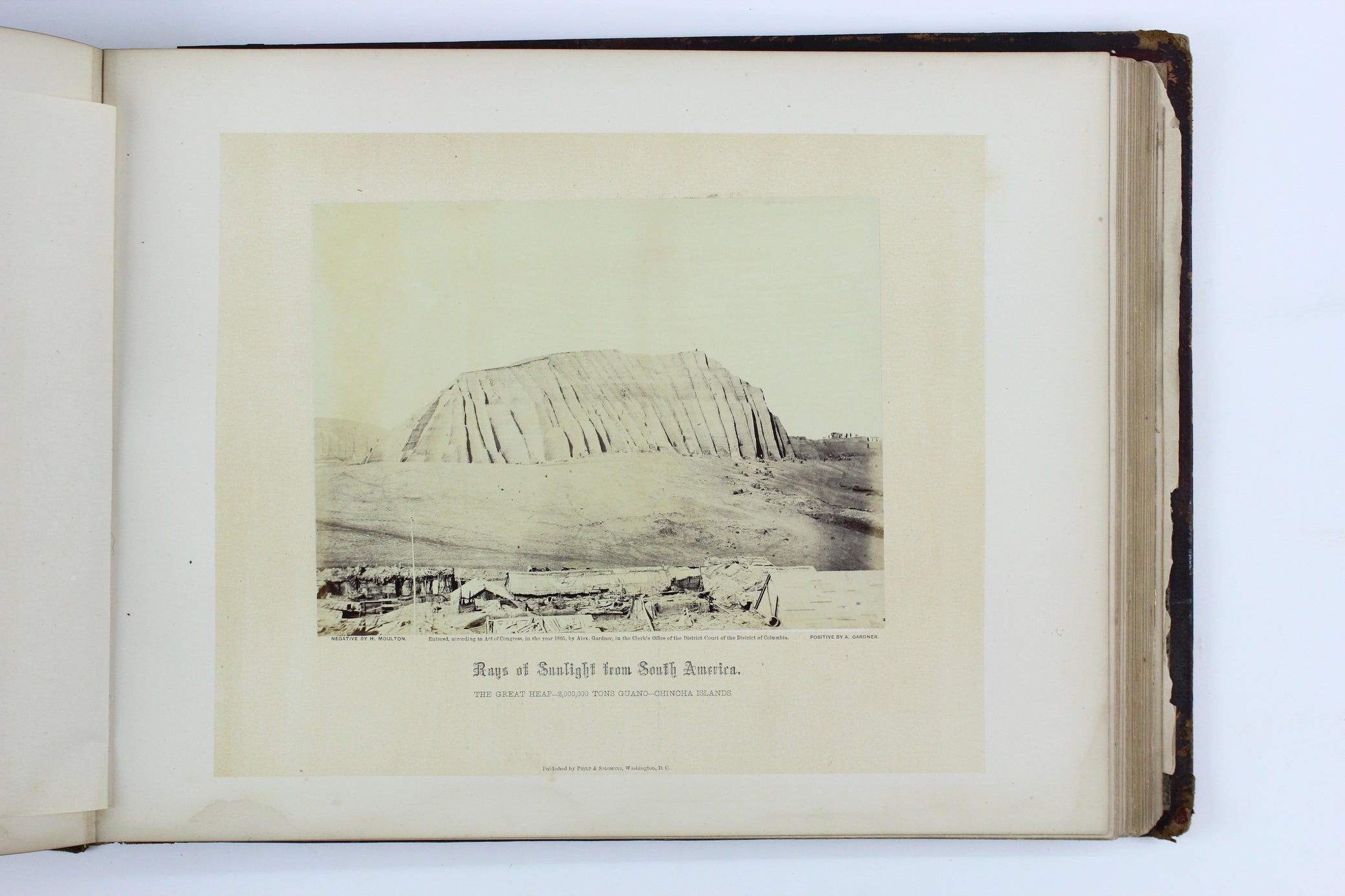 Gardner, Alexander [and Henry De Witt Moulton]. Rays of Sunlight from South America. Washington, D.C.: Philp and Solomons, 1865. Oblong folio with 68 of the 70 original plates. Each with albumen print mounted recto, image approx. 17.2 x 22.5 cm, with letterpress caption and credits (Gardener for the “positive”; Moulton for the “negative”) on mount. Some mounts with minor soiling or damp stain to edges, not affecting images. Lacking front album cover, title page, preface and 2 plates (nos. [1] and [2]). Monumental photographic album printed by famed Civil War photographer Alexander Gardner from negatives by an itinerant American photographer, Henry De Witt Moulton. Moulton's photos of Lima and the Chincha Islands were taken while he was living in Peru, sometime between 1860 and mid-1863, when he returned to the US. The size of the edition is unknown, though it was printed around the same time as Gardner's Photographic Sketch Book of the War (and advertised with it in early 1866), copies are exceedingly rare. The album's significance has been chronically underestimated. It provides fascinating transnational and bibliographic context for the better known Photographic Sketch Book, and comprises the most comprehensive photographic evidence of the historic guano deposits and the laborers who worked them. Gardener's selection of 38 (36 in the present copy) views of Lima and Callao for the opening section of Rays of Sunlight largely follow other contemporary images of the capital's major monuments. The extraordinary nature of the album lies instead in Gardner's addition of 32 of Moulton's unique “views of those celebrated Islands situated within the rainless region of the Peruvian Coast, and which furnish the richest fertilizing material known to agriculture.”* In the early 1860s the Chincha Islands’guano heaps were the world's most important source of fertilizer. Revenues from the nationalized deposits paid for much of Peru's public works from 1840-1870, including construction of the railways that crossed the Andes. Even more importantly, guano income was used by the state to free its black slaves and to abolish poll taxes on indigenous citizens. Despite these progressive measures, the Chincha Islands’guano piles were worked by prisoners and indentured Chinese laborers who were brought to Peru in large numbers under a policy known as Ley China to replace freed slaves in all aspects of industry and agriculture. Nearly half died from ill-treatment and overwork in one of the lesser-known and grim episodes of British Imperial human trafficking. Moulton's “most interesting images concerned the soon to be depleted guano itself and the process used to exploit it.” His dramatic photos are the primary source for nearly all the existing photographic evidence of the Islands and the people who worked there, including scenes of the “Great Heap” with workmen loading rail cars, others of craft transporting the cargo to ships and piers, and poignant images of the laborers who Moulton seems to have seen as victims of exploitation. A small church for the workers appears three times; in one the prisoner-laborers are surrounded by armed soldiers while they kneel outside during Sunday services. Gardner's rich contact prints preserve these minute details and the subtle value transitions captured in Moulton's negatives. In April 1864, just before Gardner assembled the album, the Chincha Islands became an object of great concern for the US when Spain seized them “as part of European efforts to re-establish colonial rule in South America while the United States was preoccupied with its Civil War.” He foresaw the historical value of the work when he wrote in his preface “In after times, these sketches of the Chincha Islands will have a peculiar interest [...] The original estimate of the length of time—one thousand years—that this deposit of the Chincha Islands would suffice for the wants of the world, is destined to prove fallacious. So great has become the demand for it that half the deposit of the largest island has been removed already; and the probabilities are, that in twenty years the supply will be exhausted.” Four copies are recorded in three public collections: the Library of Congress, the New York Public Library, and the Public Library of Cincinnati. Two other copies have come to auction in the last 30 years. The most recent, a complete copy offered at Swann, sold for $35,000 in 2012. $18,000 Isabelle Lausent-Herrera (2009). Tusans (tusheng) and the Changing Chinese Community in Peru. Journal of Chinese Overseas 5: 116. Keith McElroy (1984). Henry De Witt Moulton: Rays of sunlight from South America. History of Photography, 8:1, 7-21.