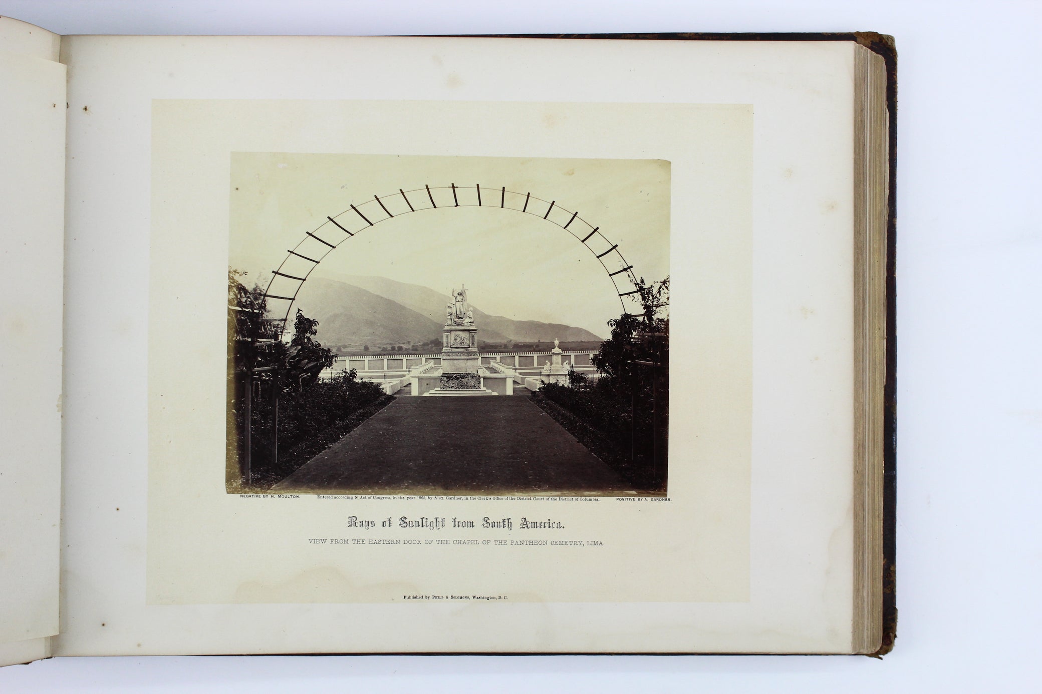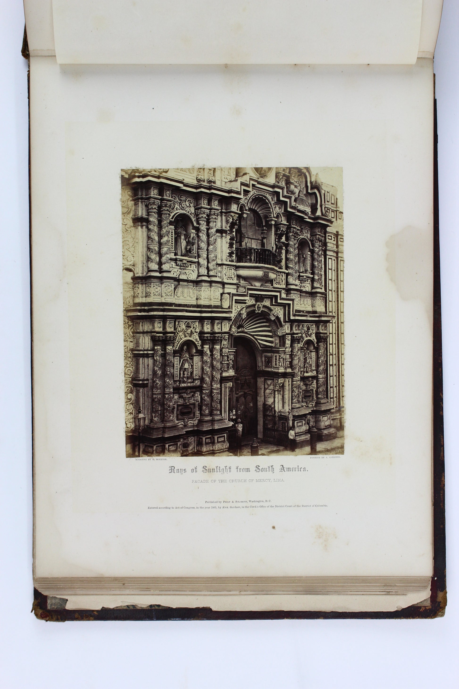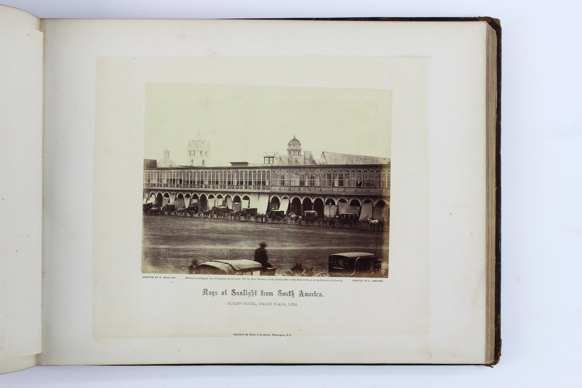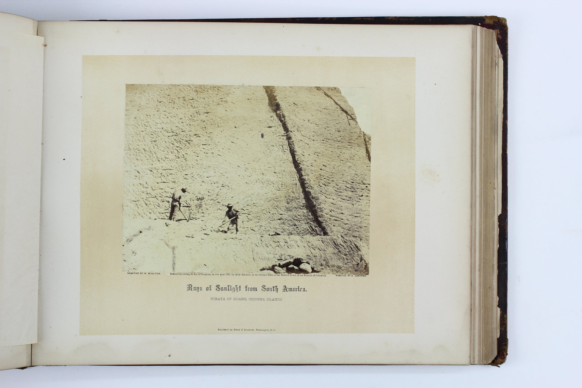 Gardner, Alexander [and Henry De Witt Moulton]. Rays of Sunlight from South America. Washington, D.C.: Philp and Solomons, 1865. Oblong folio with 68 of the 70 original plates. Each with albumen print mounted recto, image approx. 17.2 x 22.5 cm, with letterpress caption and credits (Gardener for the “positive”; Moulton for the “negative”) on mount. Some mounts with minor soiling or damp stain to edges, not affecting images. Lacking front album cover, title page, preface and 2 plates (nos. [1] and [2]). Monumental photographic album printed by famed Civil War photographer Alexander Gardner from negatives by an itinerant American photographer, Henry De Witt Moulton. Moulton's photos of Lima and the Chincha Islands were taken while he was living in Peru, sometime between 1860 and mid-1863, when he returned to the US. The size of the edition is unknown, though it was printed around the same time as Gardner's Photographic Sketch Book of the War (and advertised with it in early 1866), copies are exceedingly rare. The album's significance has been chronically underestimated. It provides fascinating transnational and bibliographic context for the better known Photographic Sketch Book, and comprises the most comprehensive photographic evidence of the historic guano deposits and the laborers who worked them. Gardener's selection of 38 (36 in the present copy) views of Lima and Callao for the opening section of Rays of Sunlight largely follow other contemporary images of the capital's major monuments. The extraordinary nature of the album lies instead in Gardner's addition of 32 of Moulton's unique “views of those celebrated Islands situated within the rainless region of the Peruvian Coast, and which furnish the richest fertilizing material known to agriculture.”* In the early 1860s the Chincha Islands’guano heaps were the world's most important source of fertilizer. Revenues from the nationalized deposits paid for much of Peru's public works from 1840-1870, including construction of the railways that crossed the Andes. Even more importantly, guano income was used by the state to free its black slaves and to abolish poll taxes on indigenous citizens. Despite these progressive measures, the Chincha Islands’guano piles were worked by prisoners and indentured Chinese laborers who were brought to Peru in large numbers under a policy known as Ley China to replace freed slaves in all aspects of industry and agriculture. Nearly half died from ill-treatment and overwork in one of the lesser-known and grim episodes of British Imperial human trafficking. Moulton's “most interesting images concerned the soon to be depleted guano itself and the process used to exploit it.” His dramatic photos are the primary source for nearly all the existing photographic evidence of the Islands and the people who worked there, including scenes of the “Great Heap” with workmen loading rail cars, others of craft transporting the cargo to ships and piers, and poignant images of the laborers who Moulton seems to have seen as victims of exploitation. A small church for the workers appears three times; in one the prisoner-laborers are surrounded by armed soldiers while they kneel outside during Sunday services. Gardner's rich contact prints preserve these minute details and the subtle value transitions captured in Moulton's negatives. In April 1864, just before Gardner assembled the album, the Chincha Islands became an object of great concern for the US when Spain seized them “as part of European efforts to re-establish colonial rule in South America while the United States was preoccupied with its Civil War.” He foresaw the historical value of the work when he wrote in his preface “In after times, these sketches of the Chincha Islands will have a peculiar interest [...] The original estimate of the length of time—one thousand years—that this deposit of the Chincha Islands would suffice for the wants of the world, is destined to prove fallacious. So great has become the demand for it that half the deposit of the largest island has been removed already; and the probabilities are, that in twenty years the supply will be exhausted.” Four copies are recorded in three public collections: the Library of Congress, the New York Public Library, and the Public Library of Cincinnati. Two other copies have come to auction in the last 30 years. The most recent, a complete copy offered at Swann, sold for $35,000 in 2012. $18,000 Isabelle Lausent-Herrera (2009). Tusans (tusheng) and the Changing Chinese Community in Peru. Journal of Chinese Overseas 5: 116. Keith McElroy (1984). Henry De Witt Moulton: Rays of sunlight from South America. History of Photography, 8:1, 7-21.