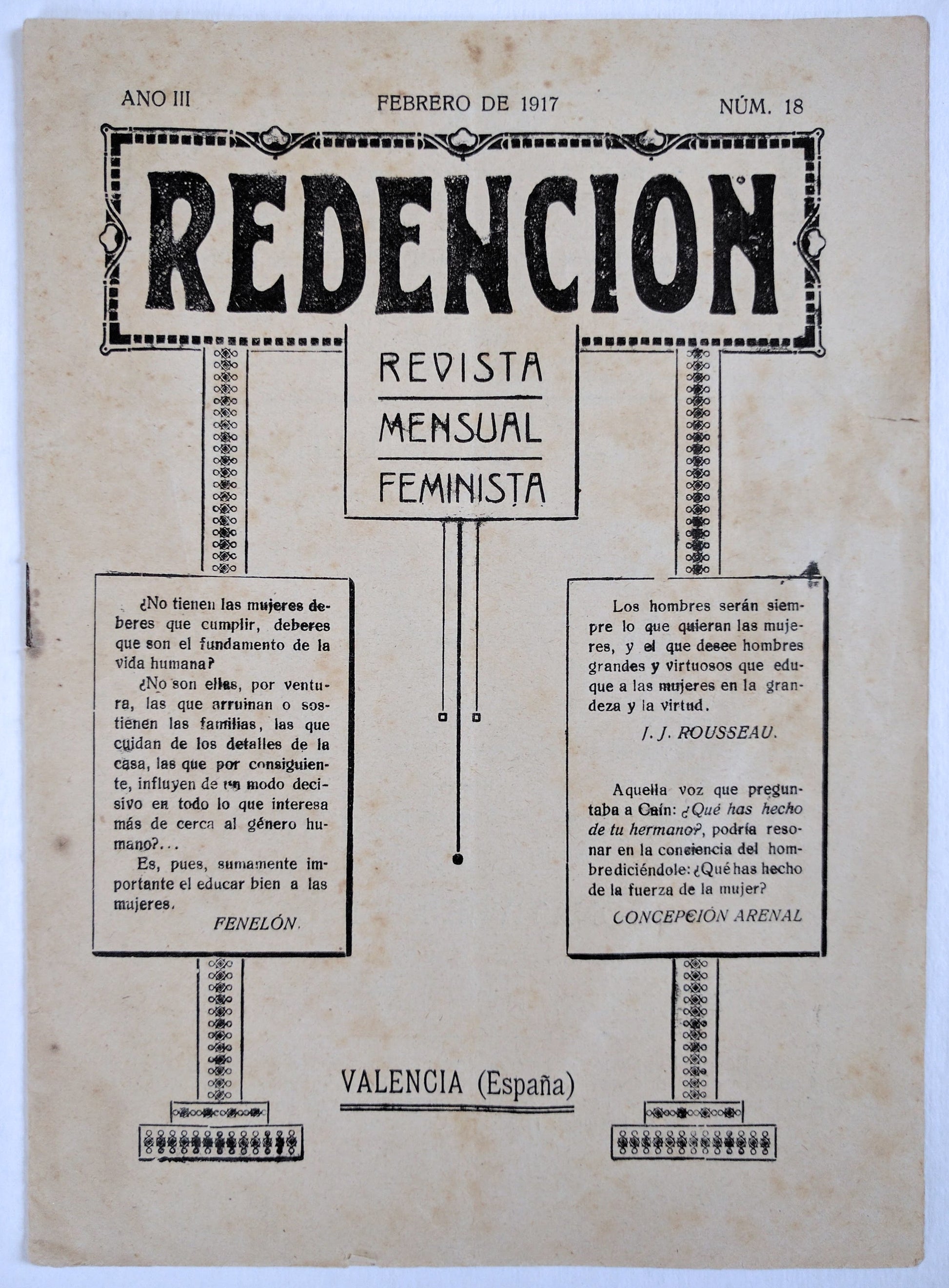 Bernal, Ana, Ed. Redención: Revista Mensual Feminista. Año III, Núm. 18 (Febrero 1917). Valencia, Spain: N.p., 1917. 8vo, 12 pp., in center of gathering one unrelated leaf bound in out of sequence, numbered 41-44; stapled self-wrapper, pages creased, small closed tear to fore edge of front wrapper. Single issue of the suffragist periodical with letters to the editor and short articles discussing cultural and political issues related to women's rights. Although the publication ran from at least 1915-1922 and is known to scholars (and discussed in The Woman Citizen, Vol. IV, No. 33 [Mar. 6, 1920]), it is seemingly unrecorded in OCLC. A private library, Biblioteca de Mujeres de Madrid, claims to have the single copy. SOLD