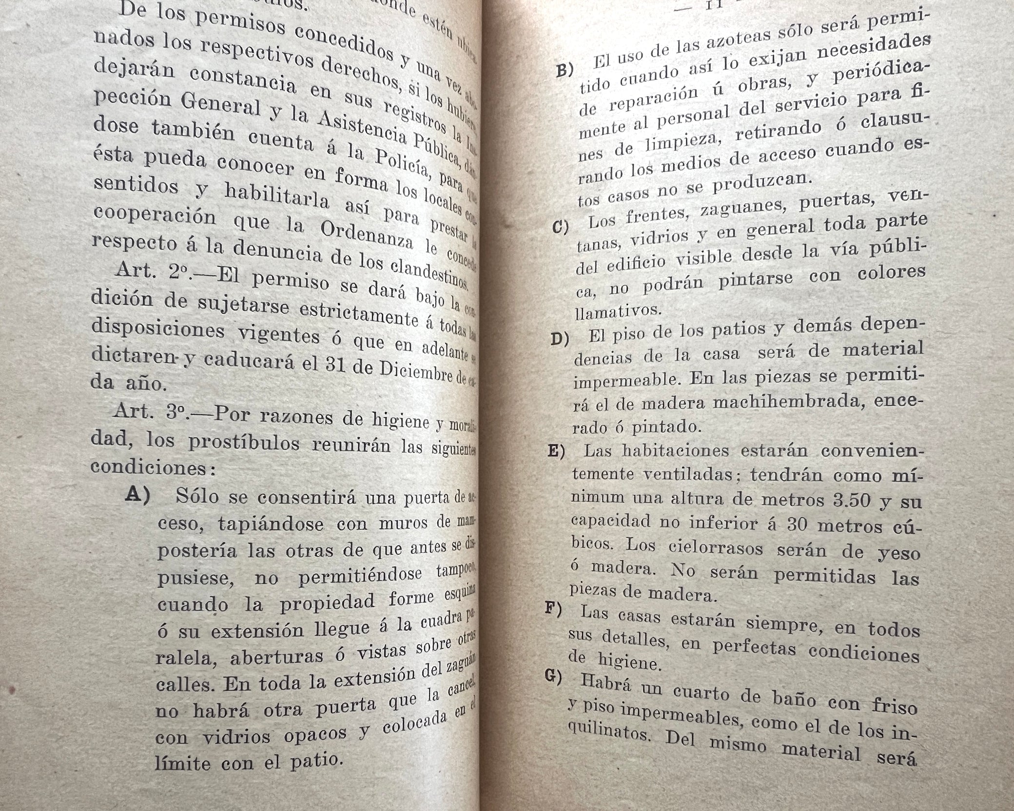 Two early and substantial titles of prostitution are of additional interest and currently not located (separately) in OCLC records (along with most of the other titles). The first is a list of the regulations applying to the operation of prostitutes and brothels in the city, including architectural requirements (e.g. specific kinds of ventilation; the prohibition of exteriors with "colores llamativos"), health registration, and minimum ages. The second is a lengthy report on the implementation and impacts of the regulations, one year later, with research and opinion.