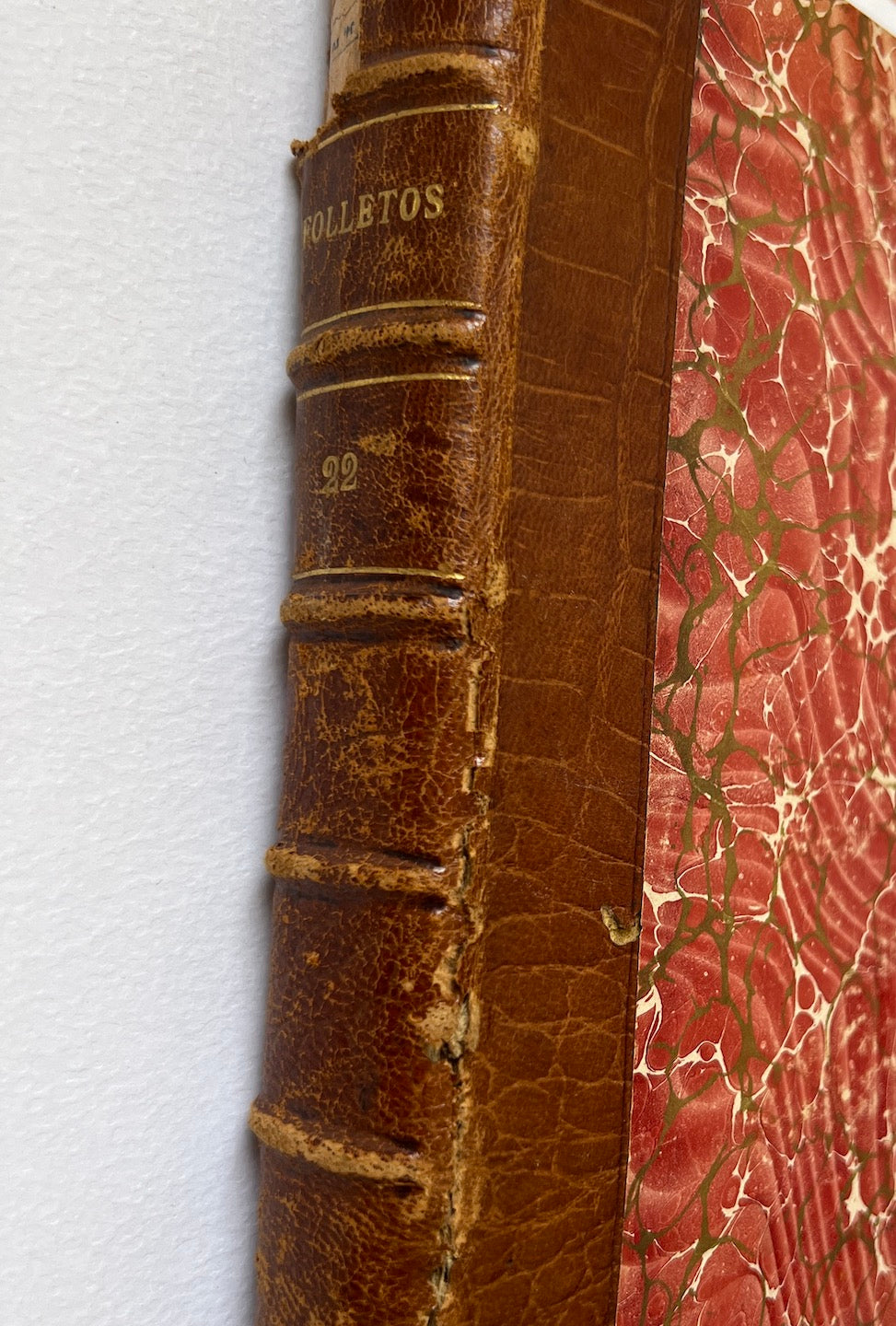 21.5 cm, pamphlets various sizes, ranging from 15-75 pp. each, most 40+, one large oblong folded plate, approx. 108 x 26 cm. Some of the pamphlets foxed, darkened, or fragile. Half-calf with marbled boards, gilt title “Folletos” and number “22” to spine. Condition: fair. Losses to spine revealing binding waste of French origin, blank free endpapers foxed, one ffep with small tear where creased against first pamphlet.
