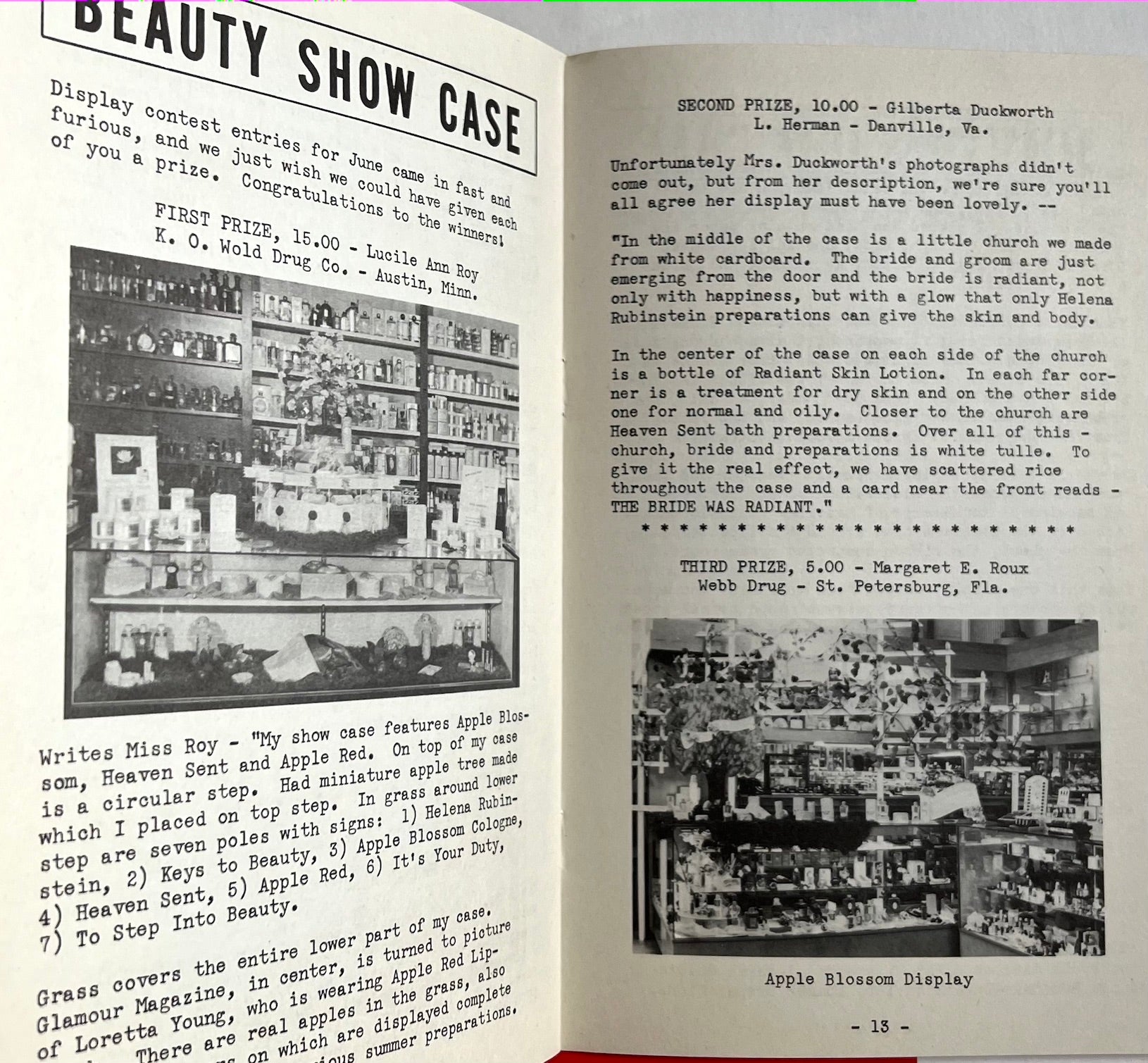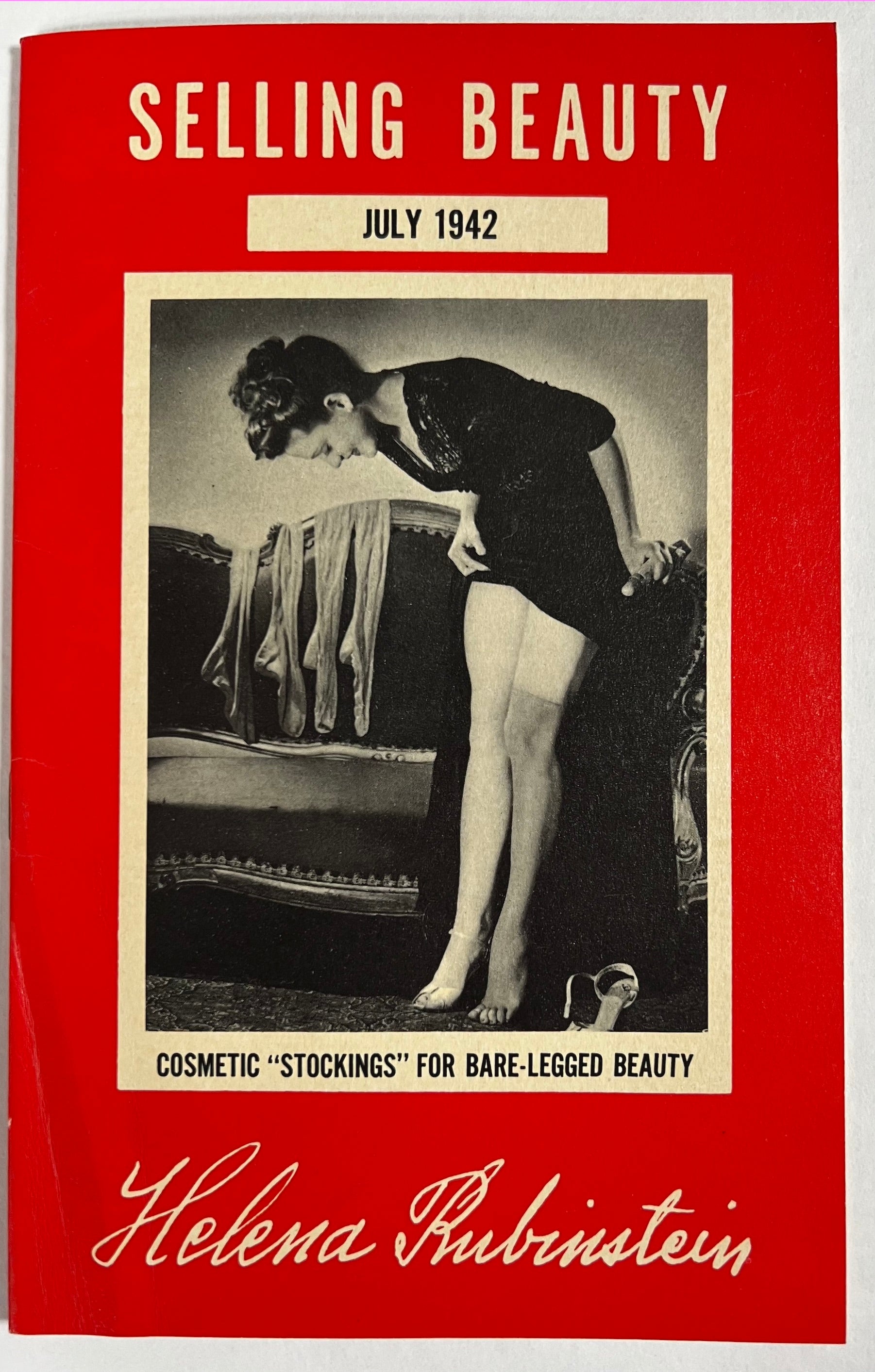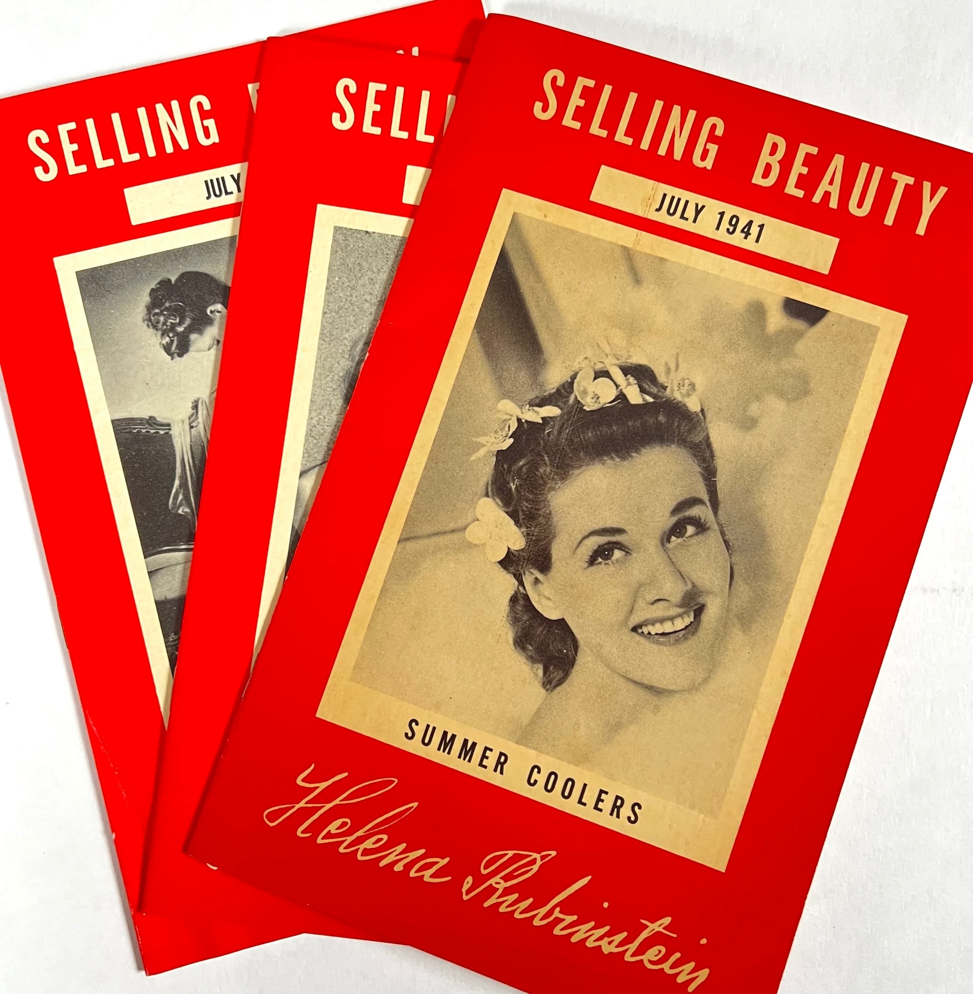 Rubinstein, Helena. Selling Beauty. [New York]: 1941-1942. 3 issues: each 22 cm; 16, 20, and 16 pp.; bw illustrations from orig. publicity artwork, reproductions of newspaper articles, and photographs; in red pictorial stapled wrappers, a few creases, VG.