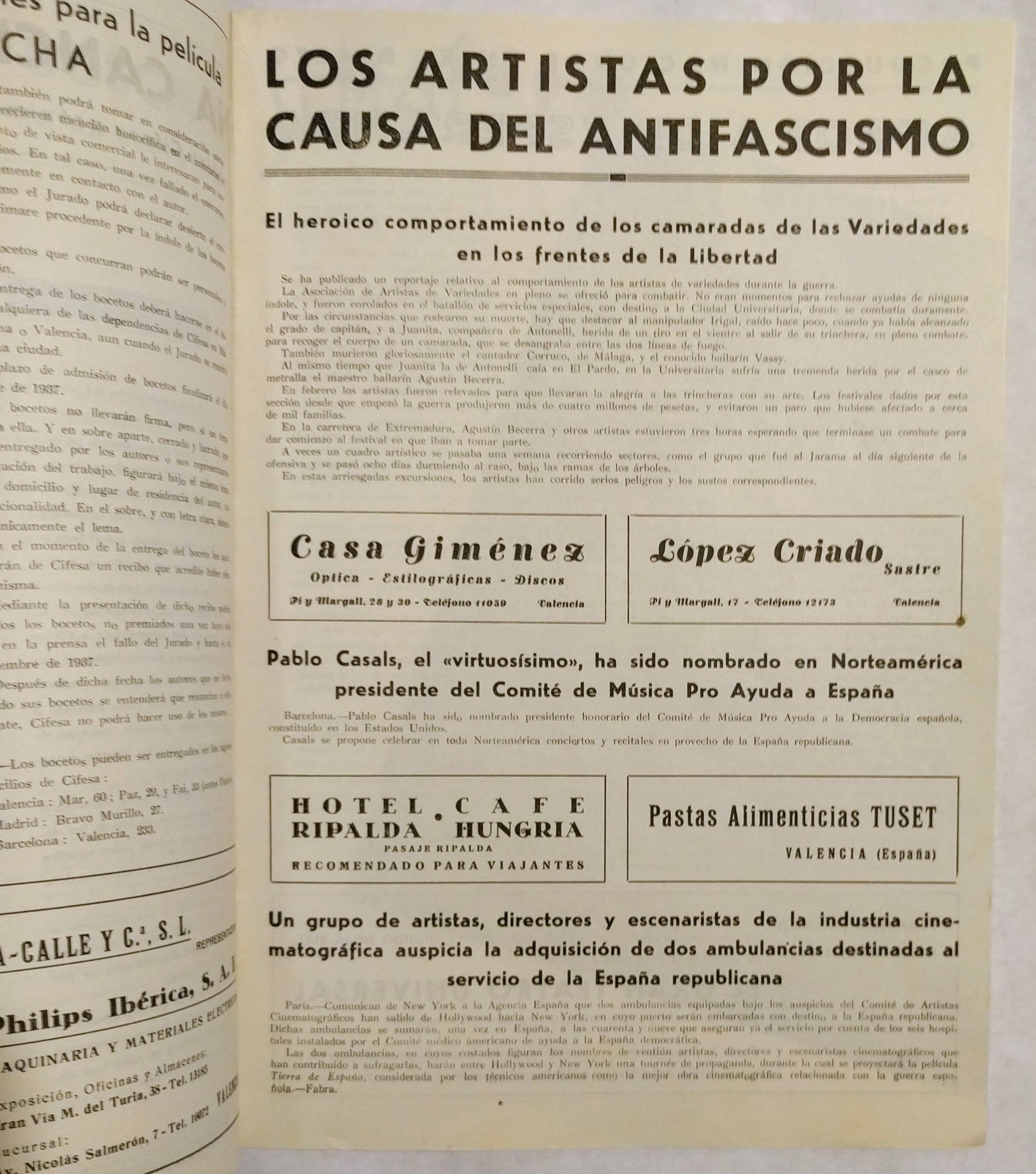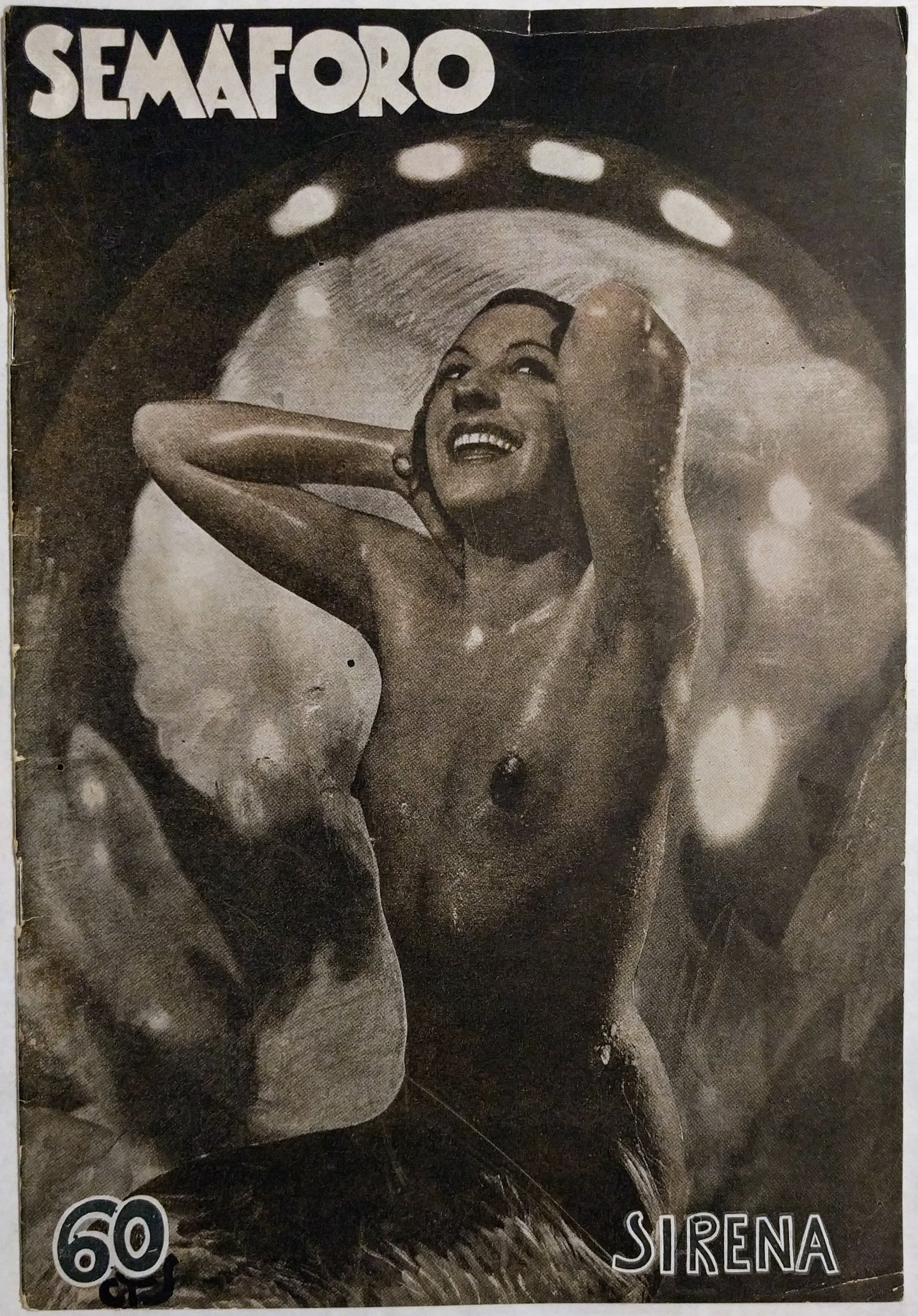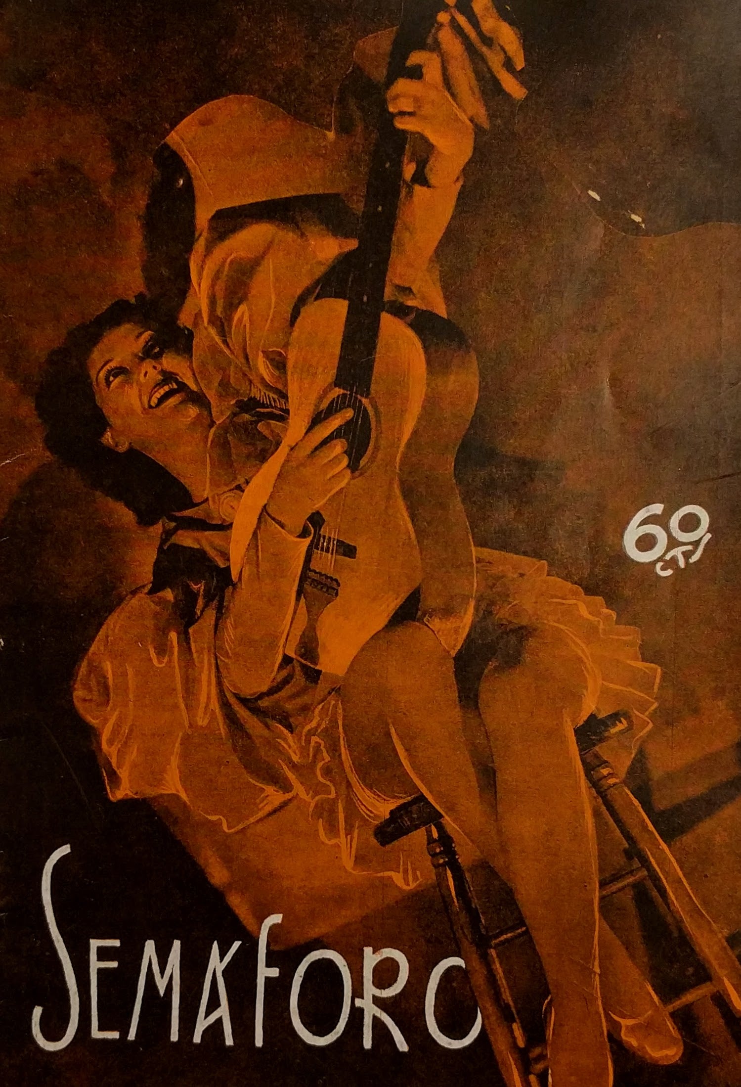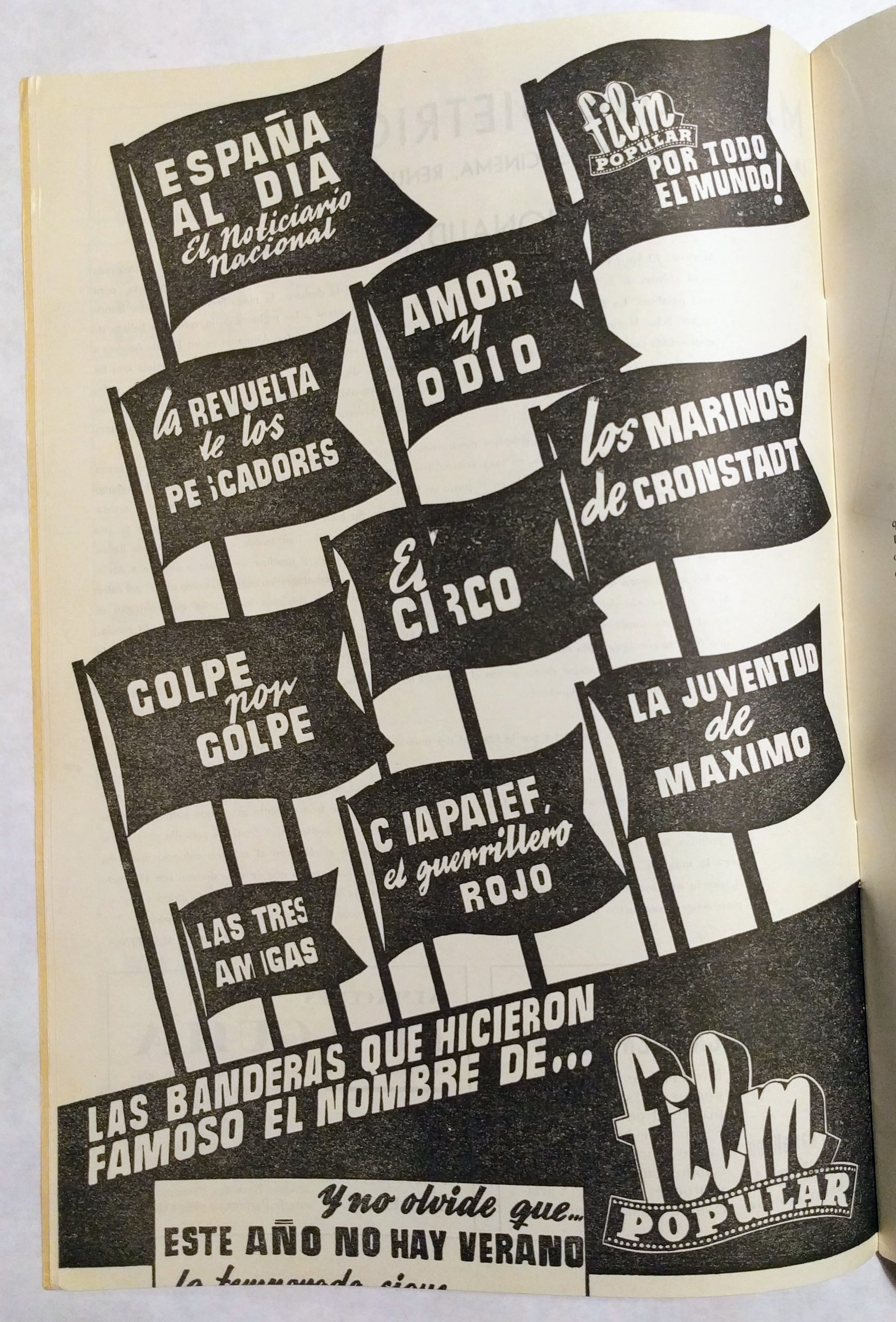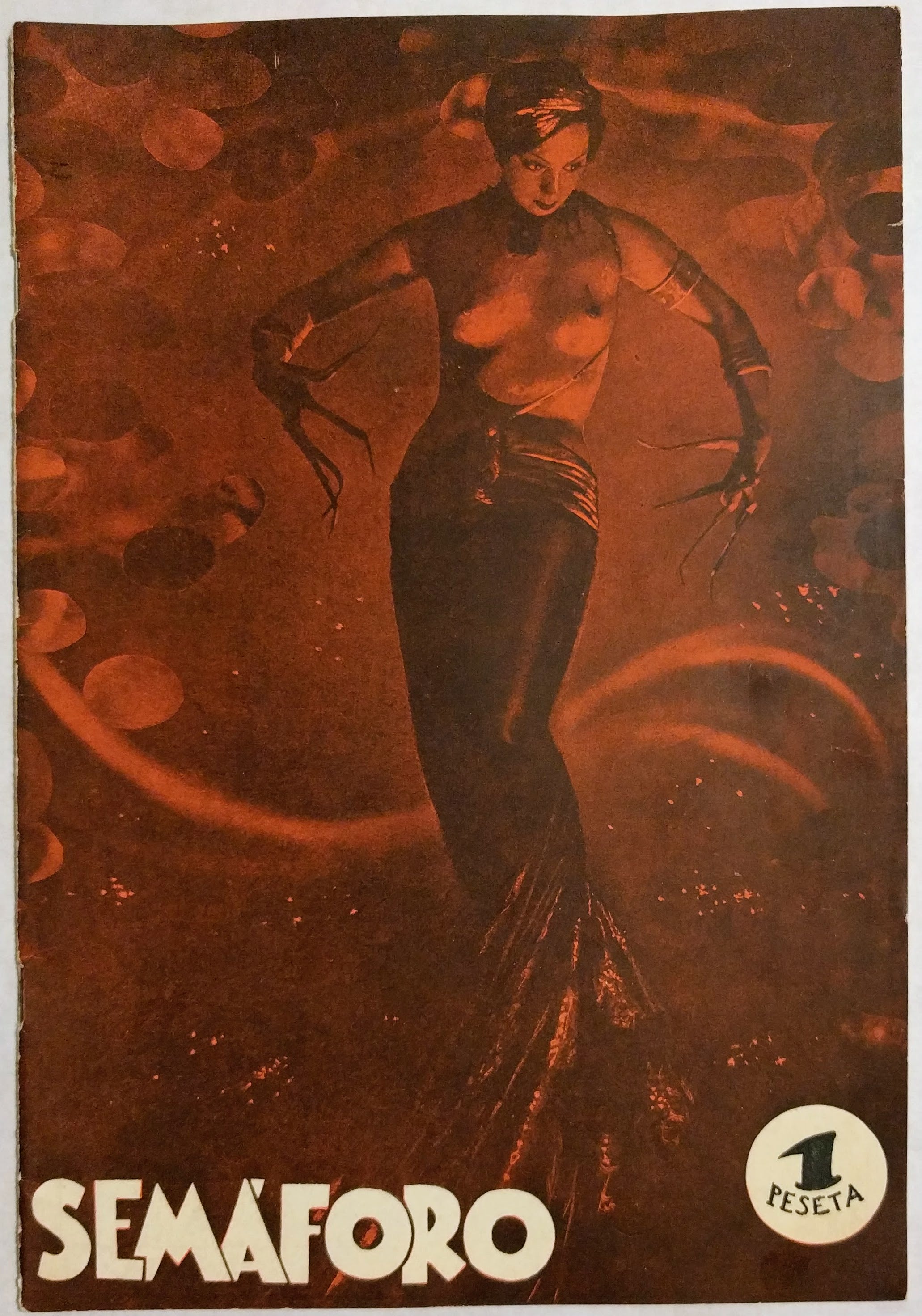 [Spanish Civil War] [Film] Comite´ Ejecutivo de Especta´culos Pu´blicos de Valencia y Provincia, Confederacio´n Nacional del Trabajo (CNT), and Unio´n General de Trabajadores de España (UGT). Semáforo: Revista del Comité Ejecutivo de Espectáculos Públicos de Valencia y Provincia. Año II, No. 11 (Apr. 15, 1937)-No.16 (Oct. 15, 1937). Valencia, Spain: UGT-CNT, 1937. 4to, six issues, each [36] pp.; illus. throughout in bw; color illus. wrappers rubbed with a few small creases and one 12 in. closed tear. Sizable run of the short-lived film journal (1936-37) irregularly published during the Spanish Civil War by a committee of socialist and anarchist propagandists from the UGT and the CNT-FAI. Each issue begins with an editorial promoting the Republican cause and antifascism in arts and culture. These essays address different aspects of art's role in a socialist society and describe a new, emancipatory path for Spanish film and theater—a necessary corrective for the “poison” administered by the bourgeois film industry before the Republican victory in 1931. Much of the design can be attributed to Mexican illustrator Juan Pérez del Muro, whose background in pop culture and satire is visible in the erotic covers, interior caricatures, and satirical photomontages of European dictators including Hitler and Mussolini. Under the direction of the anarchist journalist Higinio Noja Ruiz, Semáforo covered cinema, experimental theater, dance, and political philosophy, with features on Soviet films and those of the socialist Spanish production company Film Popular. Essays address scenography, visual arts, music, and the committee-based structure and economics of anarcho-syndicalist film and theater industries. Some advertisements and reviews refer to lost films, destroyed by the government during Franco's dictatorship. Three of the six issues have rear cover illustrations advertising the Nuestra Natacha, which went missing at the end of the war. OCLC finds a single incomplete run located in North America (UC San Diego) and two other partial holdings worldwide (University of Barcelona and IISH, Amsterdam). SOLD
