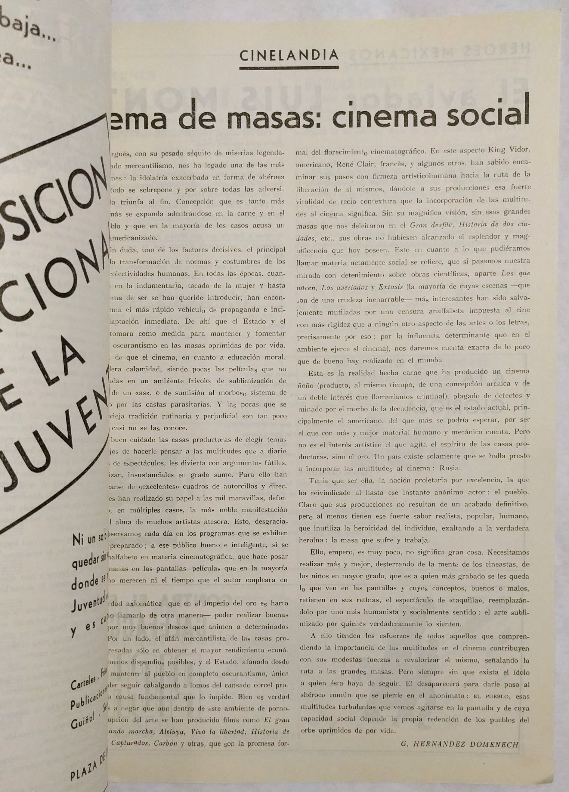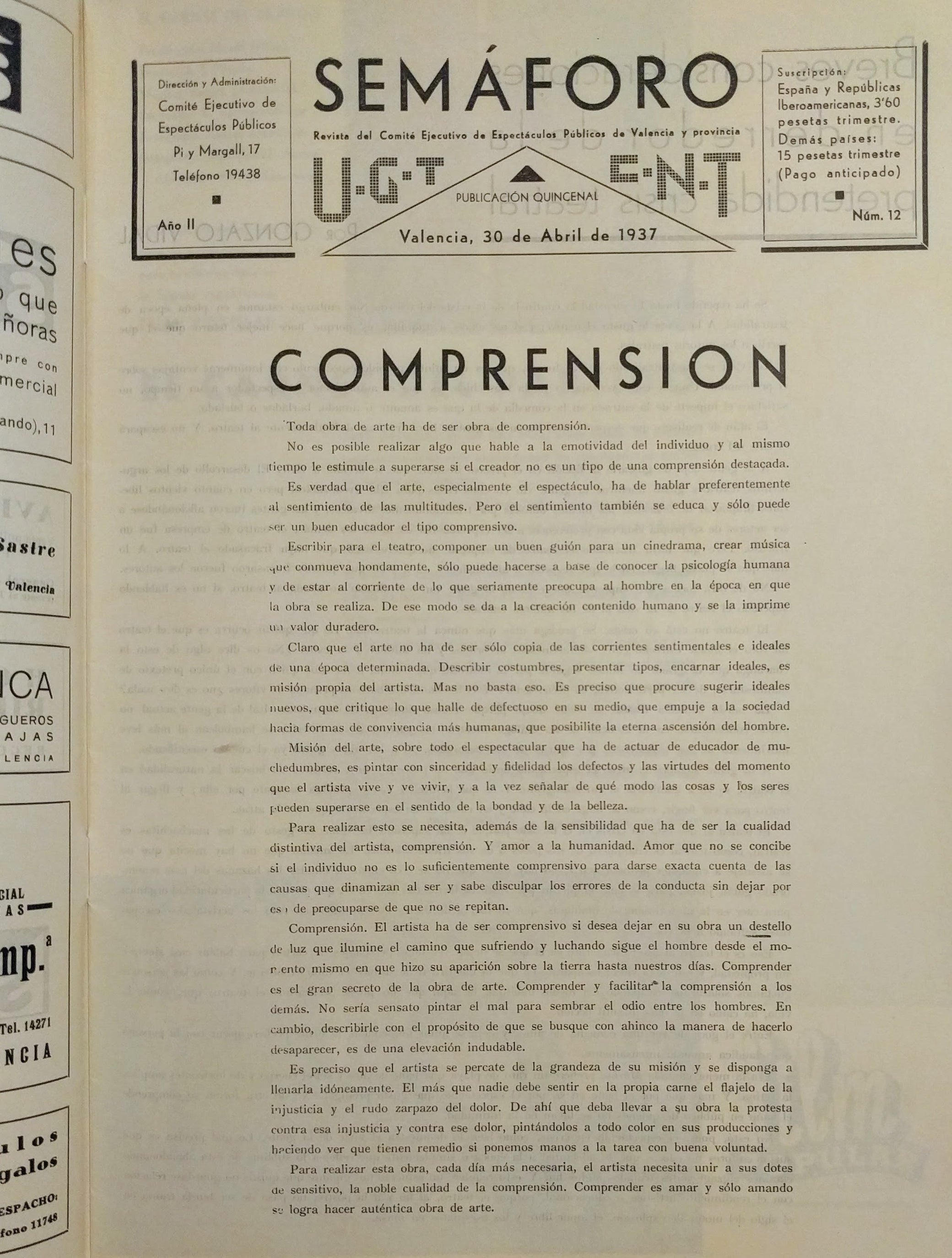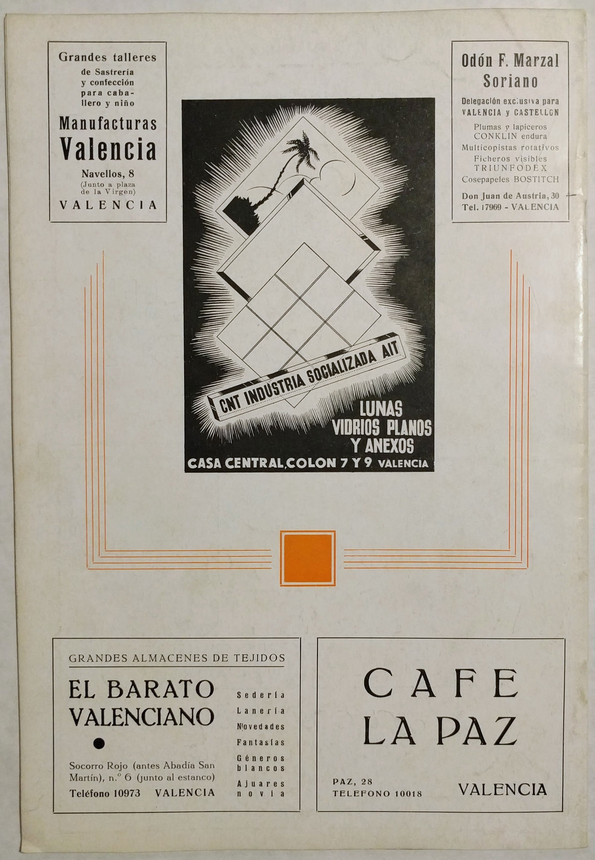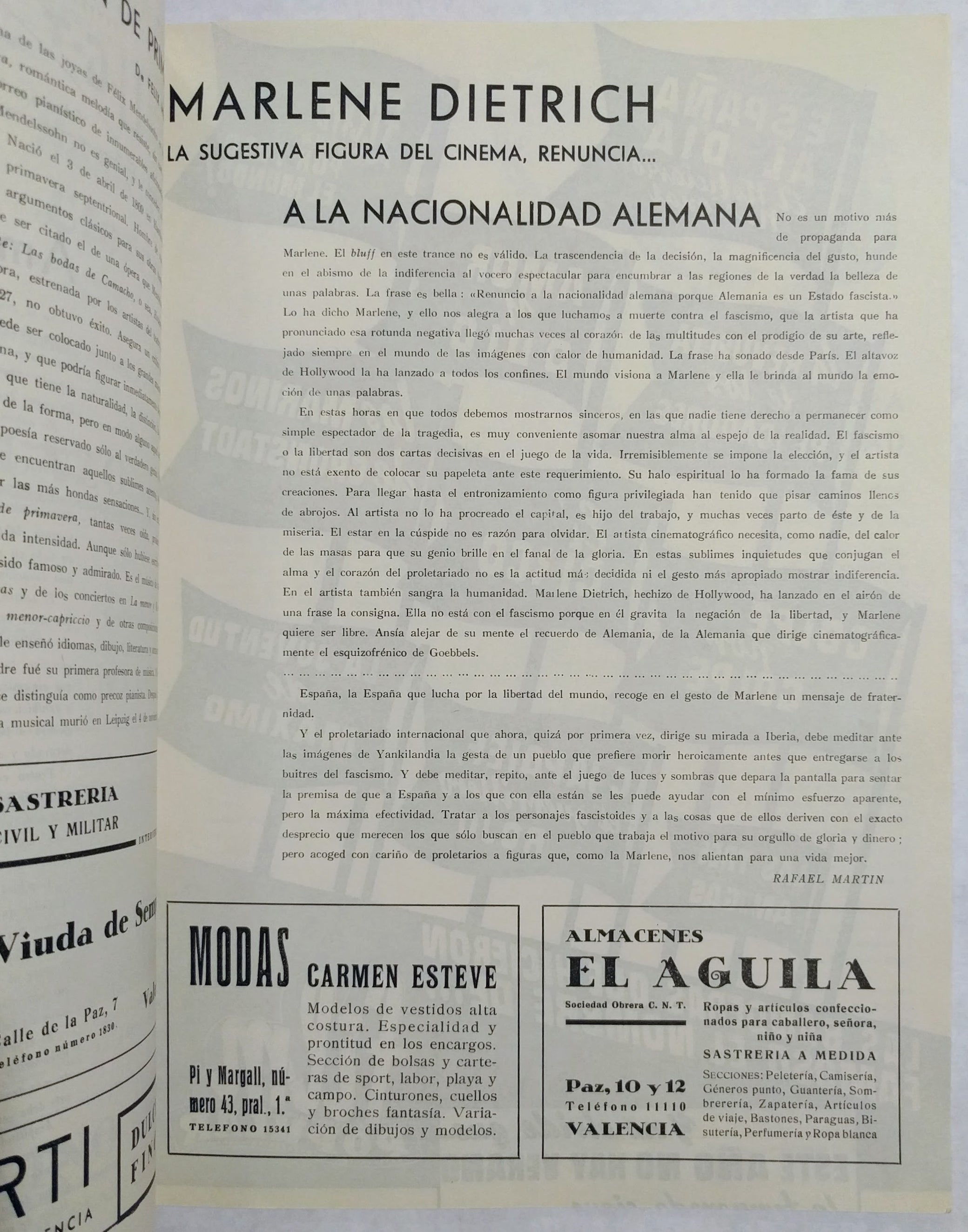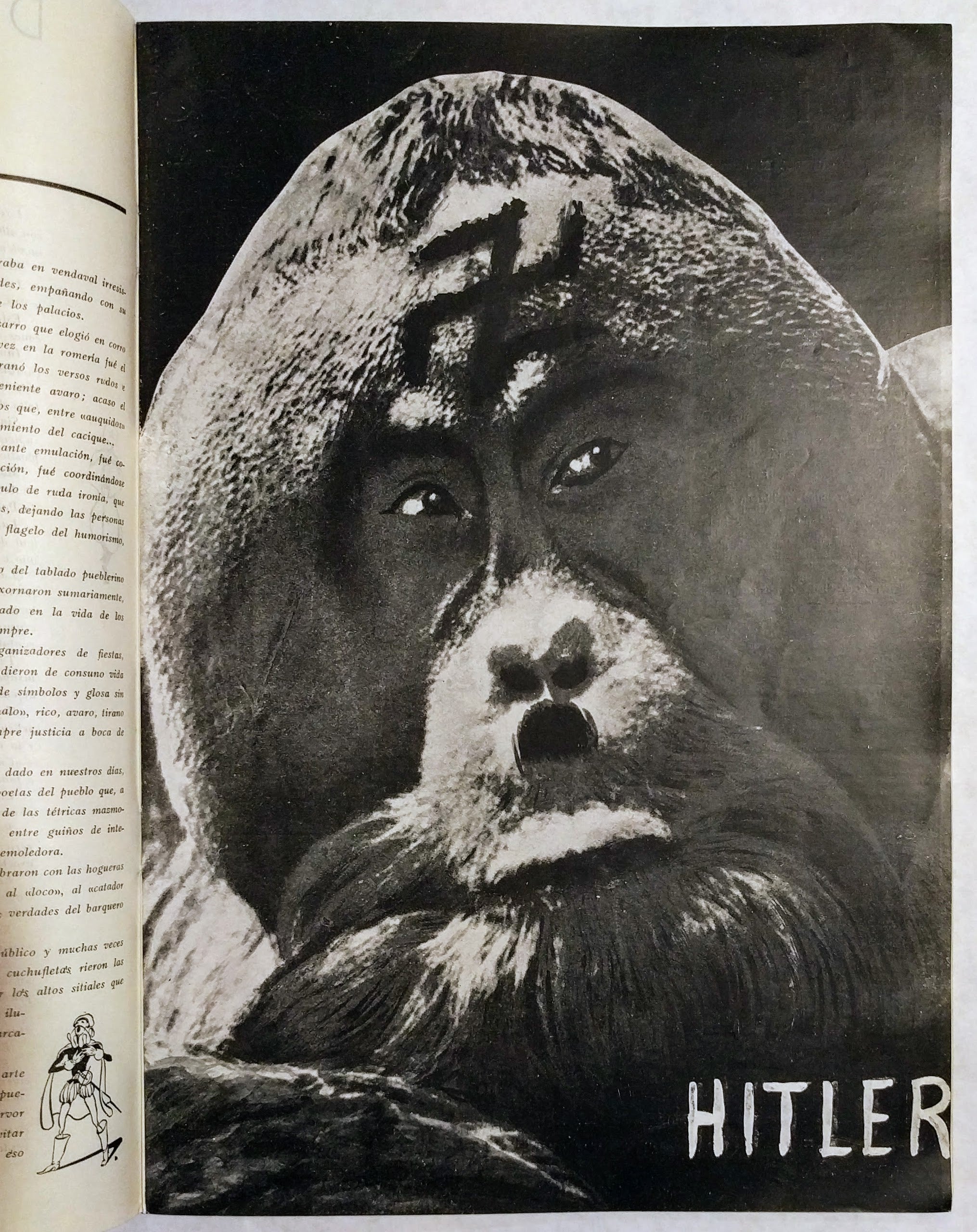 [Spanish Civil War] [Film] Comite´ Ejecutivo de Especta´culos Pu´blicos de Valencia y Provincia, Confederacio´n Nacional del Trabajo (CNT), and Unio´n General de Trabajadores de España (UGT). Semáforo: Revista del Comité Ejecutivo de Espectáculos Públicos de Valencia y Provincia. Año II, No. 11 (Apr. 15, 1937)-No.16 (Oct. 15, 1937). Valencia, Spain: UGT-CNT, 1937. 4to, six issues, each [36] pp.; illus. throughout in bw; color illus. wrappers rubbed with a few small creases and one 12 in. closed tear. Sizable run of the short-lived film journal (1936-37) irregularly published during the Spanish Civil War by a committee of socialist and anarchist propagandists from the UGT and the CNT-FAI. Each issue begins with an editorial promoting the Republican cause and antifascism in arts and culture. These essays address different aspects of art's role in a socialist society and describe a new, emancipatory path for Spanish film and theater—a necessary corrective for the “poison” administered by the bourgeois film industry before the Republican victory in 1931. Much of the design can be attributed to Mexican illustrator Juan Pérez del Muro, whose background in pop culture and satire is visible in the erotic covers, interior caricatures, and satirical photomontages of European dictators including Hitler and Mussolini. Under the direction of the anarchist journalist Higinio Noja Ruiz, Semáforo covered cinema, experimental theater, dance, and political philosophy, with features on Soviet films and those of the socialist Spanish production company Film Popular. Essays address scenography, visual arts, music, and the committee-based structure and economics of anarcho-syndicalist film and theater industries. Some advertisements and reviews refer to lost films, destroyed by the government during Franco's dictatorship. Three of the six issues have rear cover illustrations advertising the Nuestra Natacha, which went missing at the end of the war. OCLC finds a single incomplete run located in North America (UC San Diego) and two other partial holdings worldwide (University of Barcelona and IISH, Amsterdam). SOLD