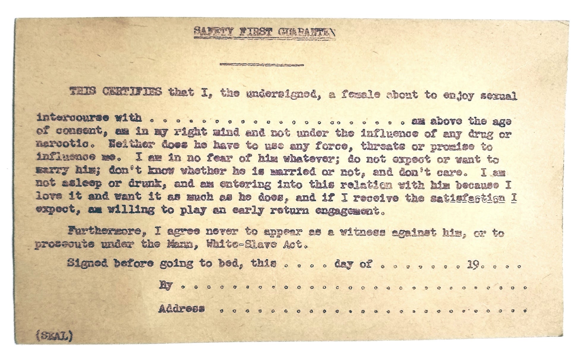 A semi-serious sexual consent card, intended to indemnify a male against a Mann Act claim and a compelling early 20th-century precursor to the language of consent currently being considered in legal and institutional contexts. Enacted in 1910 at the height of “white slavery” hysteria, the Mann Act made interstate travel by a man and a women with the intent of committing sexual acts a crime. Its original ambiguous language, establishing a felony charge against the transport of “any woman or girl for the purpose of prostitution or debauchery, or for any other immoral purpose,” was infamously used to criminialize sexual behavior, even among consenting adults.