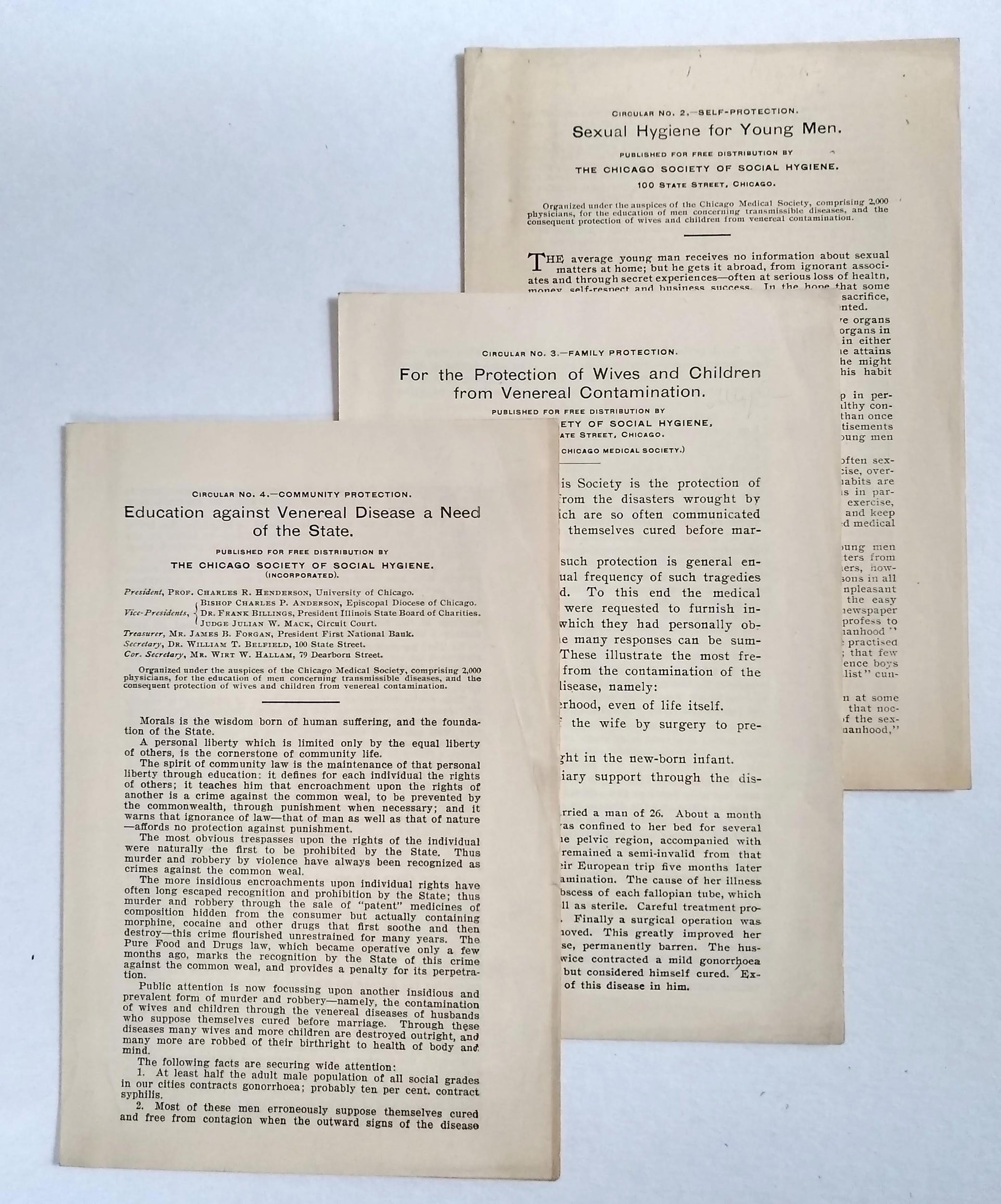(Sexual Health) (Education) (Illinois) Chicago Society of Social Hygiene. Circular No. 2. Self-Protection: Sexual Hygiene For Young Men; Circular No. 3. Family Protection: For the Protection of Wives and Children from Venereal Contamination; Circular No. 4. Community Protection: Education against Venereal Disease a Need of the State. Chicago, IL: Chicago Society of Social Hygiene, n.d. [ca. 1911-1920]. 8vo, each pamphlet [4] pp.; no. 2 somewhat toned, else good. Public health pamphlets issued by the Chicago member organization of the American Social Hygiene Association.