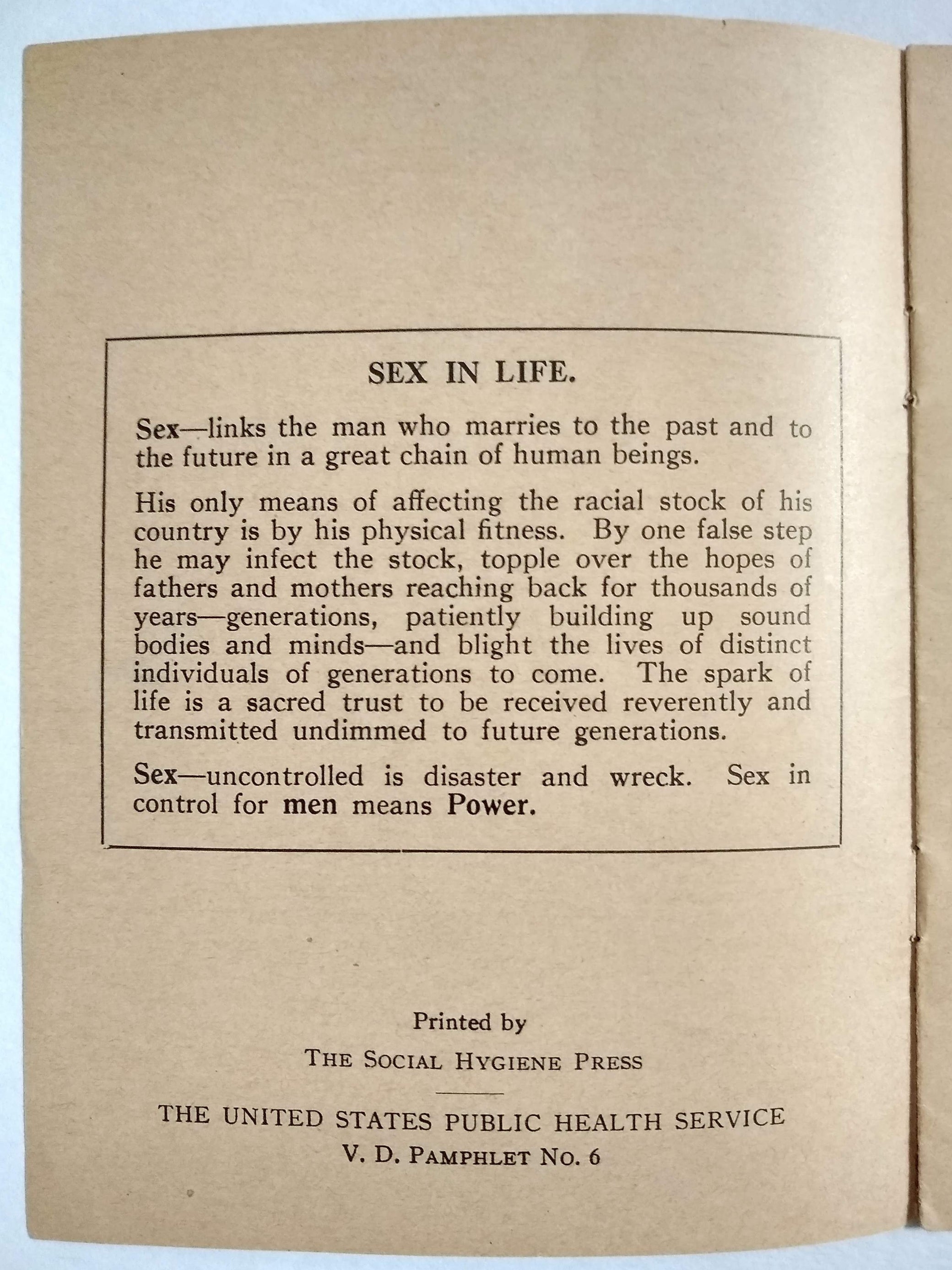 “Sex—uncontrolled is disaster and wreck. Sex in control for men means Power.” Original emphasis. A few pamphlets from this series held at Harvard and Oberlin, this one seemingly unrecorded in OCLC.