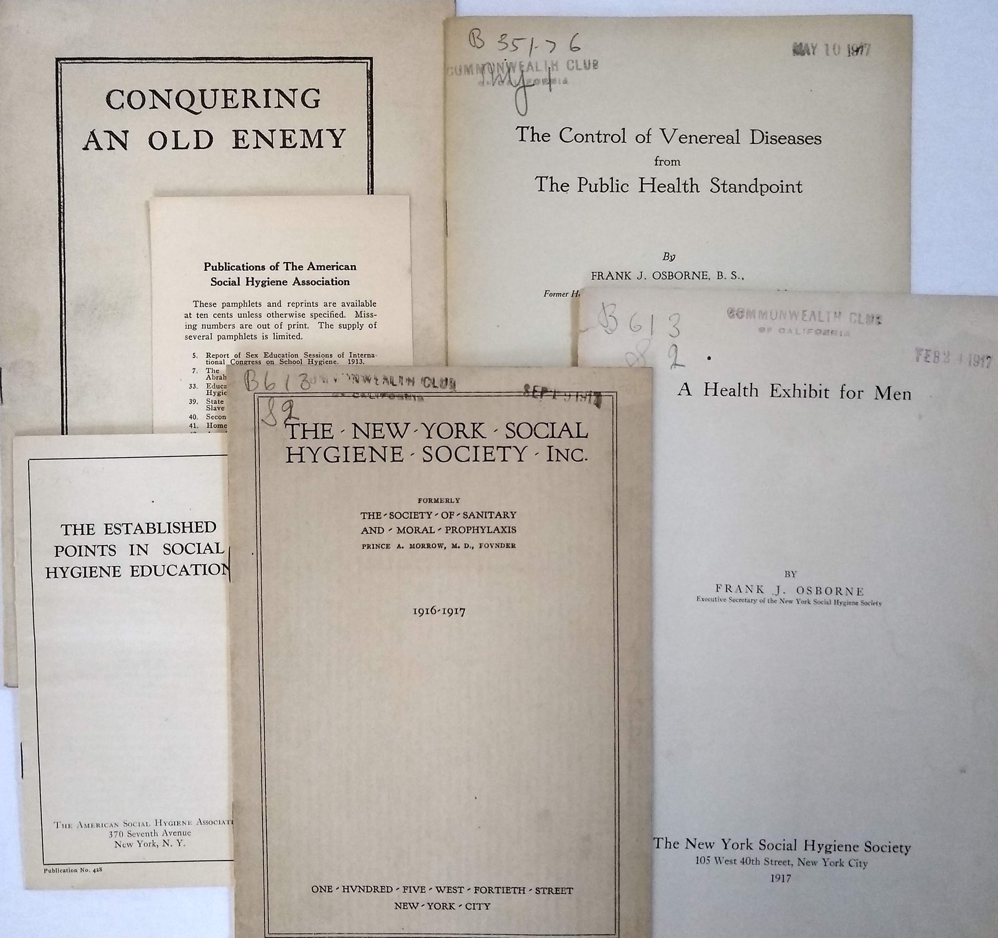 This group includes two well-illustrated examples: Frank J. Osborne. A Health Exhibit for Men. New York, NY: New York Social Hygiene Society, 1917, with a few closed tears; and The New York Social Hygiene Society, Inc., 1916-1917 [title from cover]. New York, NY. Both booklets document public exhibits and lectures given in the state of New York. Also: American Social Hygiene Association. First Annual Report, 1913-1914. New York, NY: The American Society Hygiene Association, 1914. Frank J. Osborne. The Control of Venereal Disease from the Public Health Standpoint. New York, NY: The New York Social Hygiene Society, 1917. Will Irwin. Conquering an Old Enemy. New York, NY: The American Society Hygiene Association, 1920. Publications of the American Social Hygiene Association, 1918. Bigelow, Maurice. The Established Points in Social Hygiene Education. New York, NY: American Social Hygiene Association, 1924.