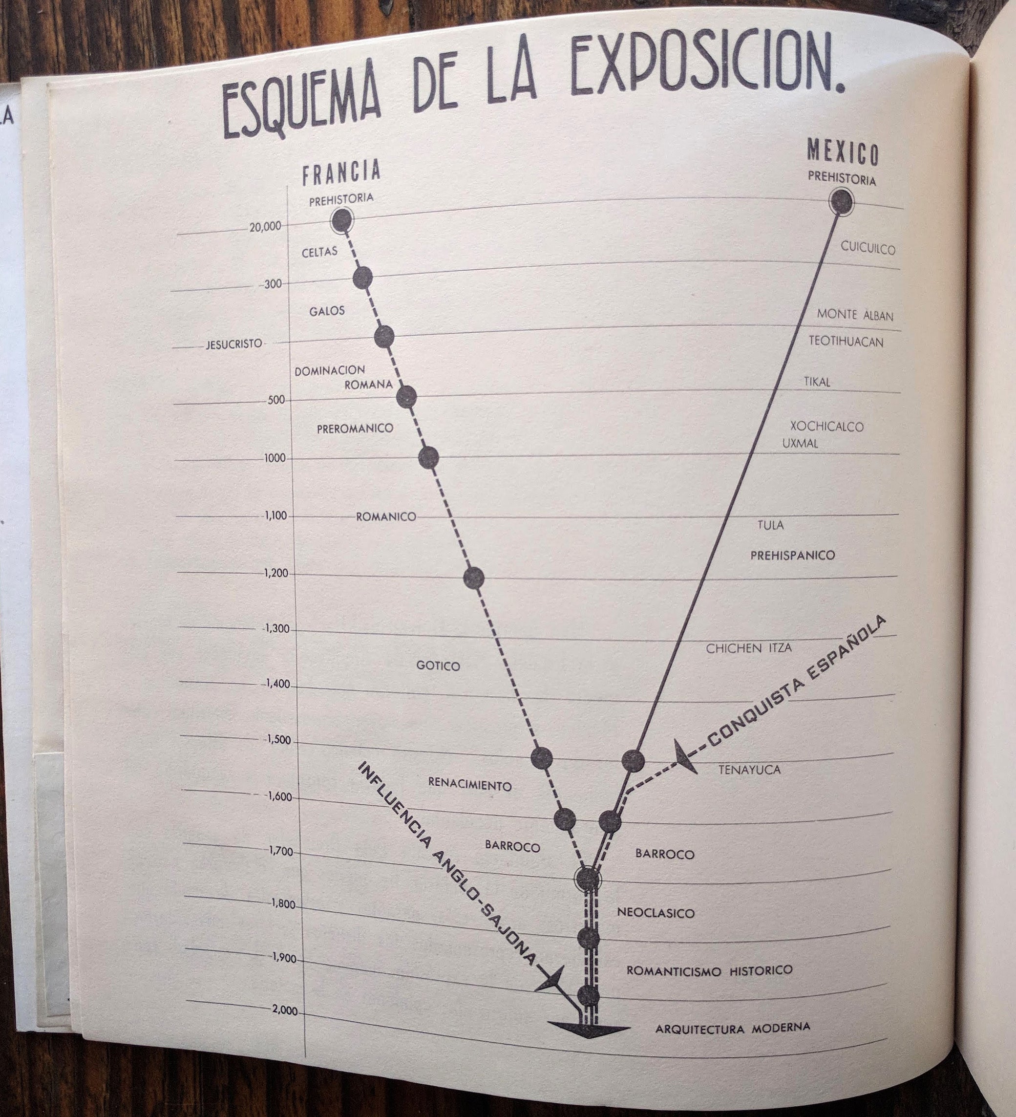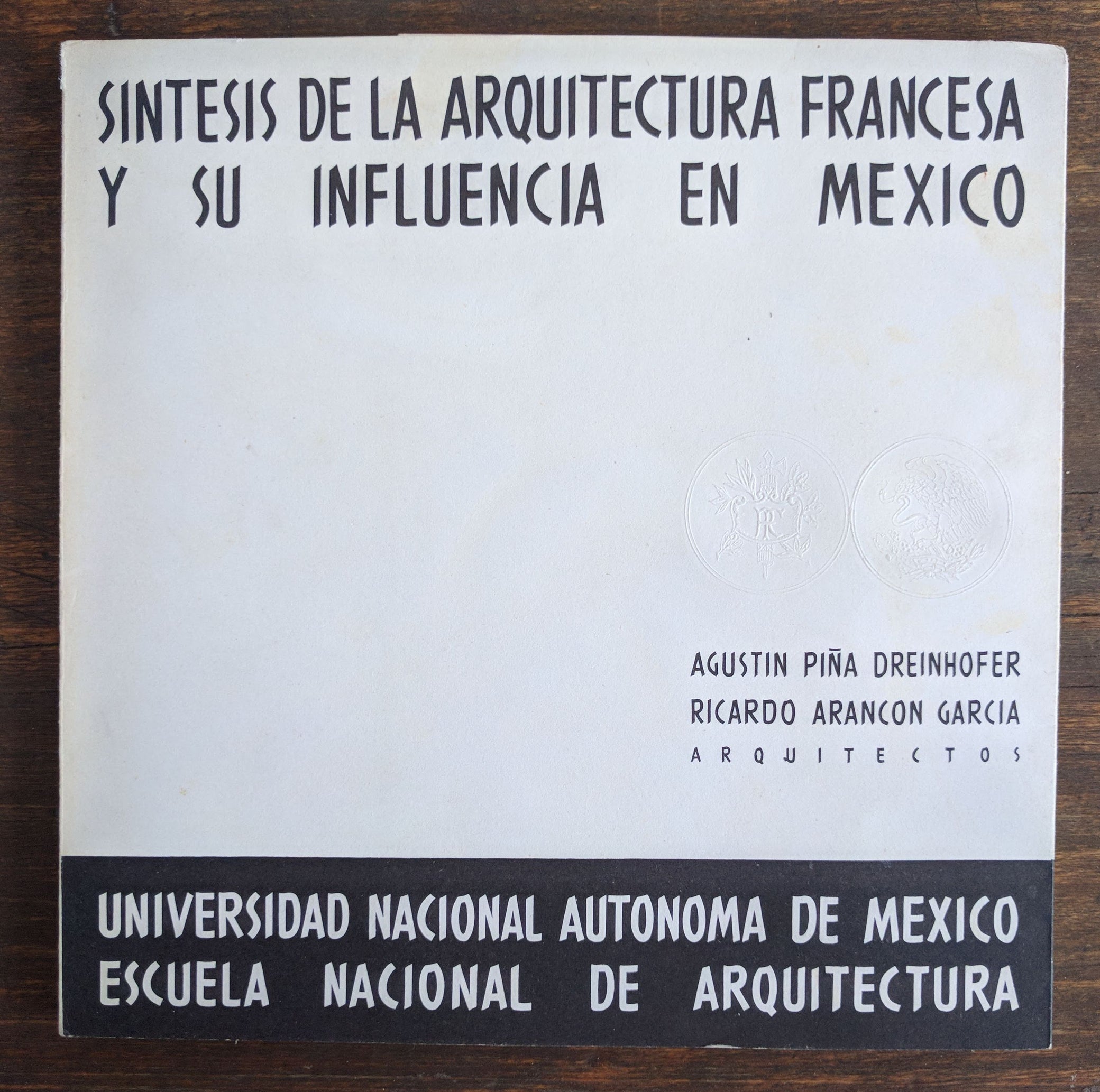 (Architecture) Piña Dreinhofer, Agusti´n and Ricardo Arancon Garci´a. Si´ntesis de la arquitectura francesa y su influencia en Me´xico. Me´xico, D.F.: Universidad Nacional Auto´noma de Me´xico, Escuela Nacional de Arquitectura, 1965. Square 8vo, [54] pp.; three large bw folding timelines of French and Mexican architecture, illustrated; orig. wrapper, light wear, very good. Exhibition catalogue celebrating influence of French architecture on Mexico, mainly in baroque and neoclassical styles. Only modest discussion of colonialism and the disastrous Second Empire. OCLC finds one US institutional holding, UC-Santa Barbara. SOLD