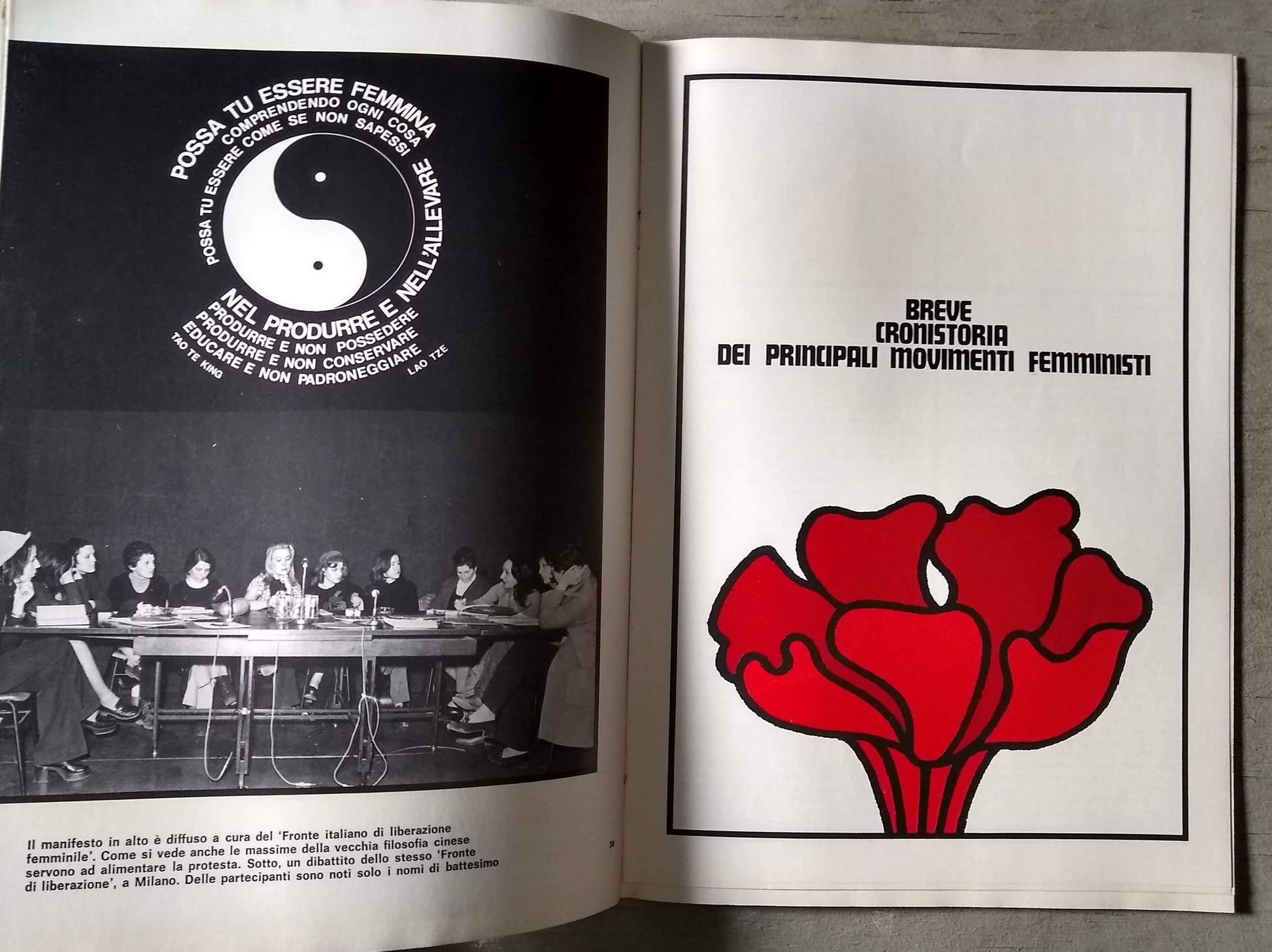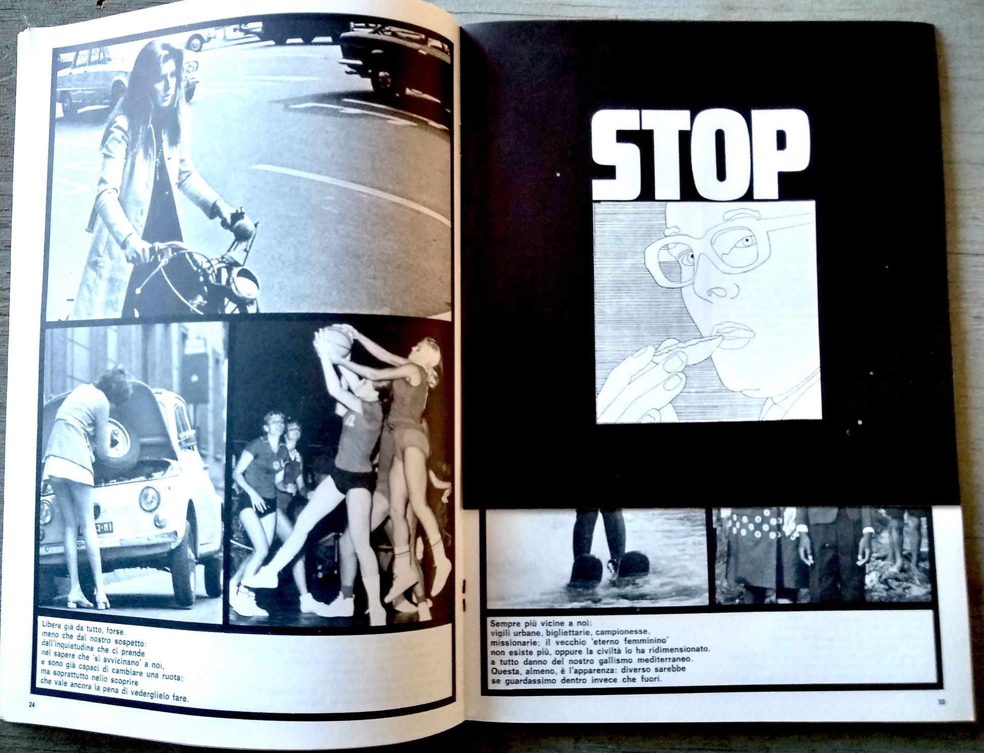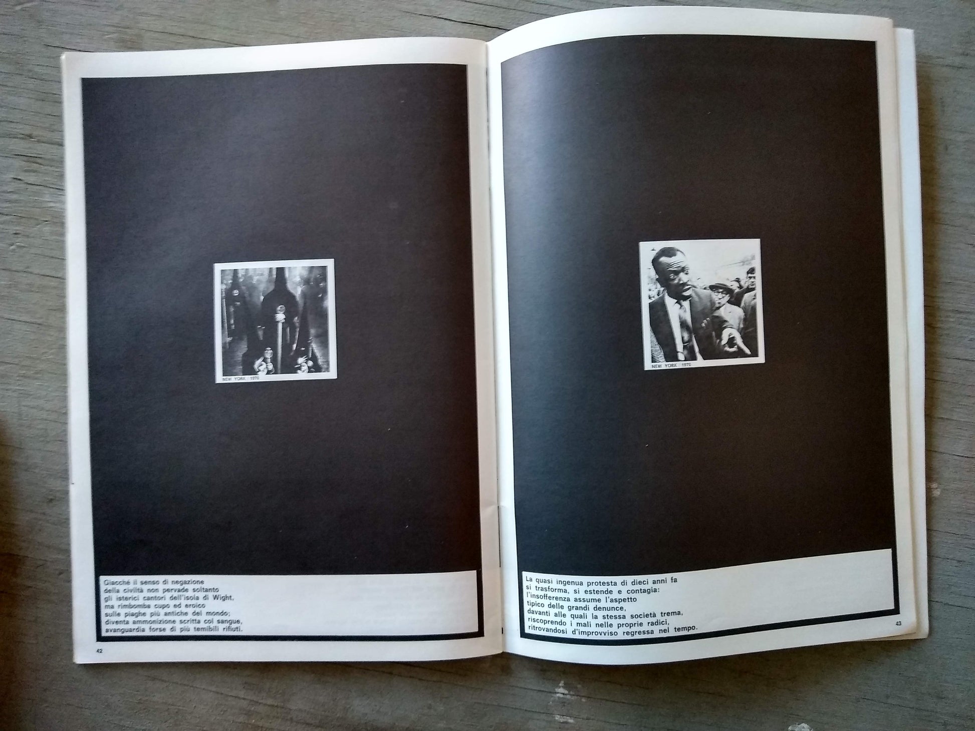 The eye-catching covers, unusual photographic spreads, and striking color inserts were the responsibility of designer Marco Caroli. Together with editor Franco Vanni, they created a unique visual language juxtaposing international photojournalism, modern infographics, and quotable short form essays in a section called “di parere.” Topical issues included protest movements, drugs, feminism, avantgarde theater, and Vietnam. But many were also dedicated to scientific and economic aspects of the difficult period that followed Italy's “economic miracle”: hunger, prisons, agriculture, space, housing, the elderly, divorce, computers, mafia, circus, ecology, China, Latin America, propaganda, anthropology, and a few on single artists or philosophers: Irinia Ionesco, Ghitta Carell, Pablo Picasso, Diderot, and Galileo; among the photojournalism are press photos of installation art, Pop, and assemblage by artists including Wolf Vostell, Andy Warhol, and Ed Kienholz.