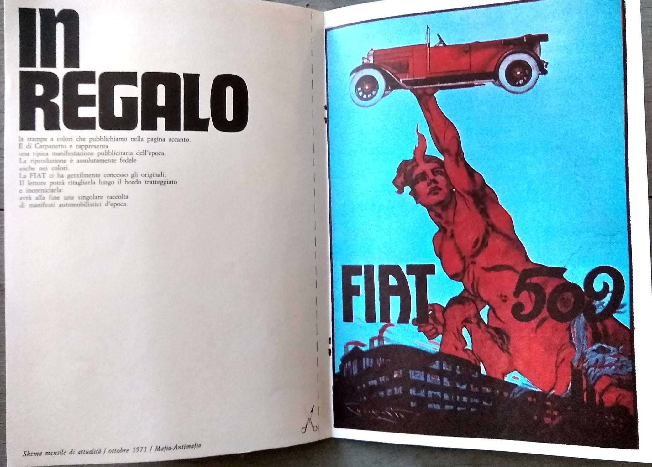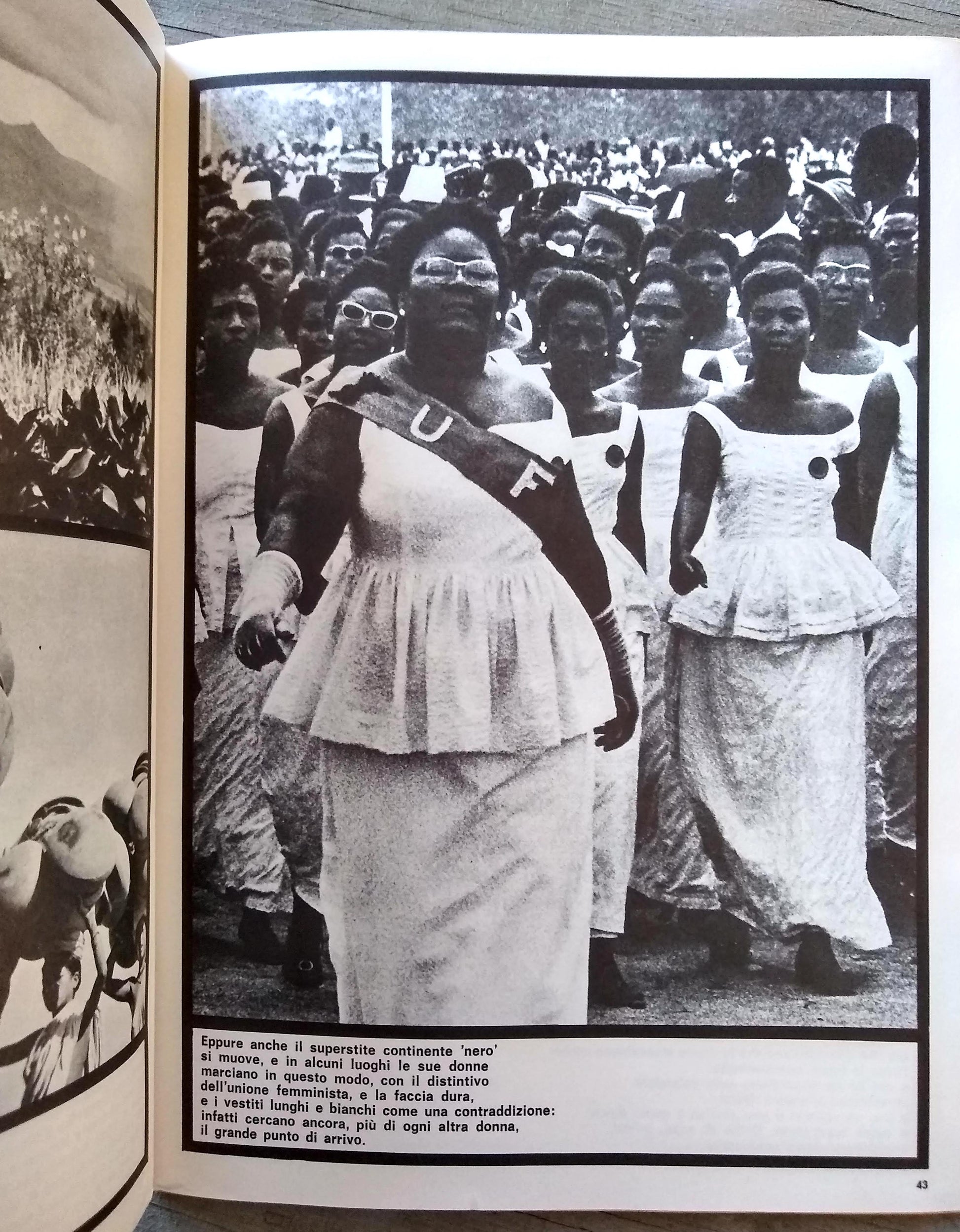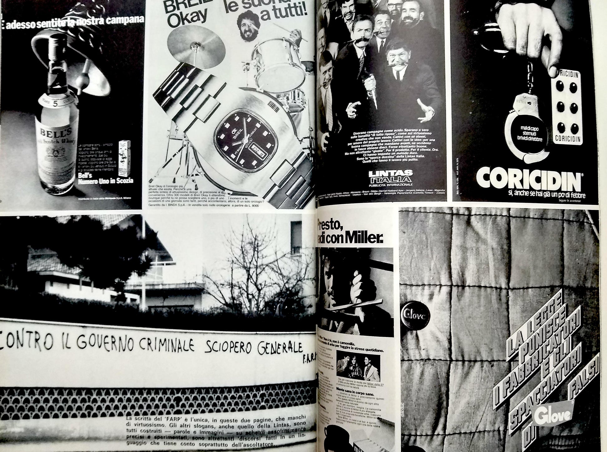The eye-catching covers, unusual photographic spreads, and striking color inserts were the responsibility of designer Marco Caroli. Together with editor Franco Vanni, they created a unique visual language juxtaposing international photojournalism, modern infographics, and quotable short form essays in a section called “di parere.” Topical issues included protest movements, drugs, feminism, avantgarde theater, and Vietnam. But many were also dedicated to scientific and economic aspects of the difficult period that followed Italy's “economic miracle”: hunger, prisons, agriculture, space, housing, the elderly, divorce, computers, mafia, circus, ecology, China, Latin America, propaganda, anthropology, and a few on single artists or philosophers: Irinia Ionesco, Ghitta Carell, Pablo Picasso, Diderot, and Galileo; among the photojournalism are press photos of installation art, Pop, and assemblage by artists including Wolf Vostell, Andy Warhol, and Ed Kienholz.