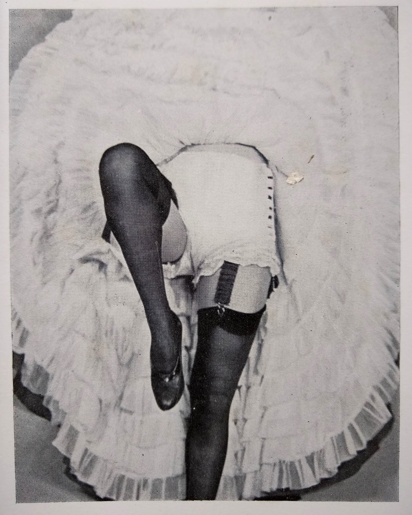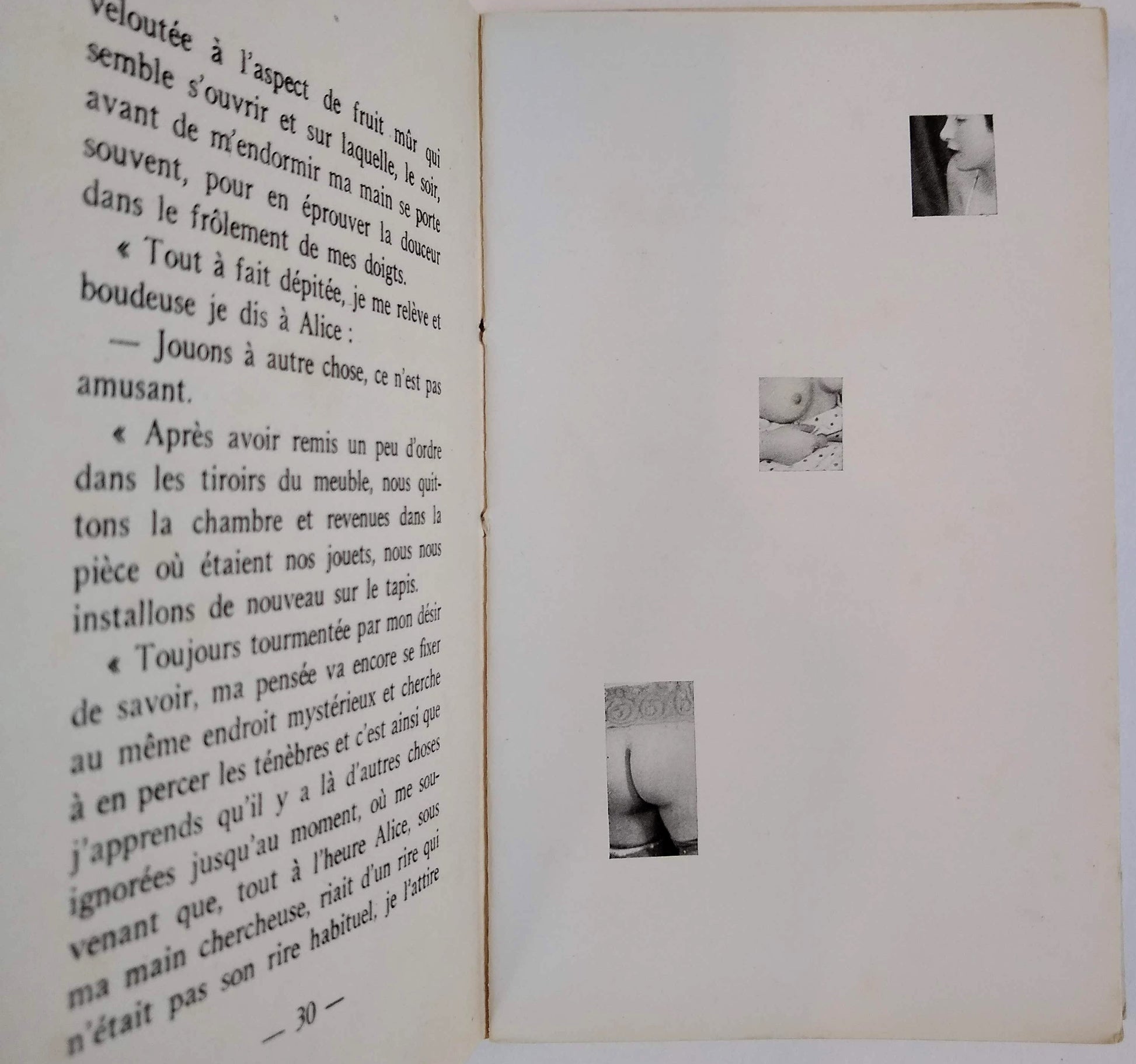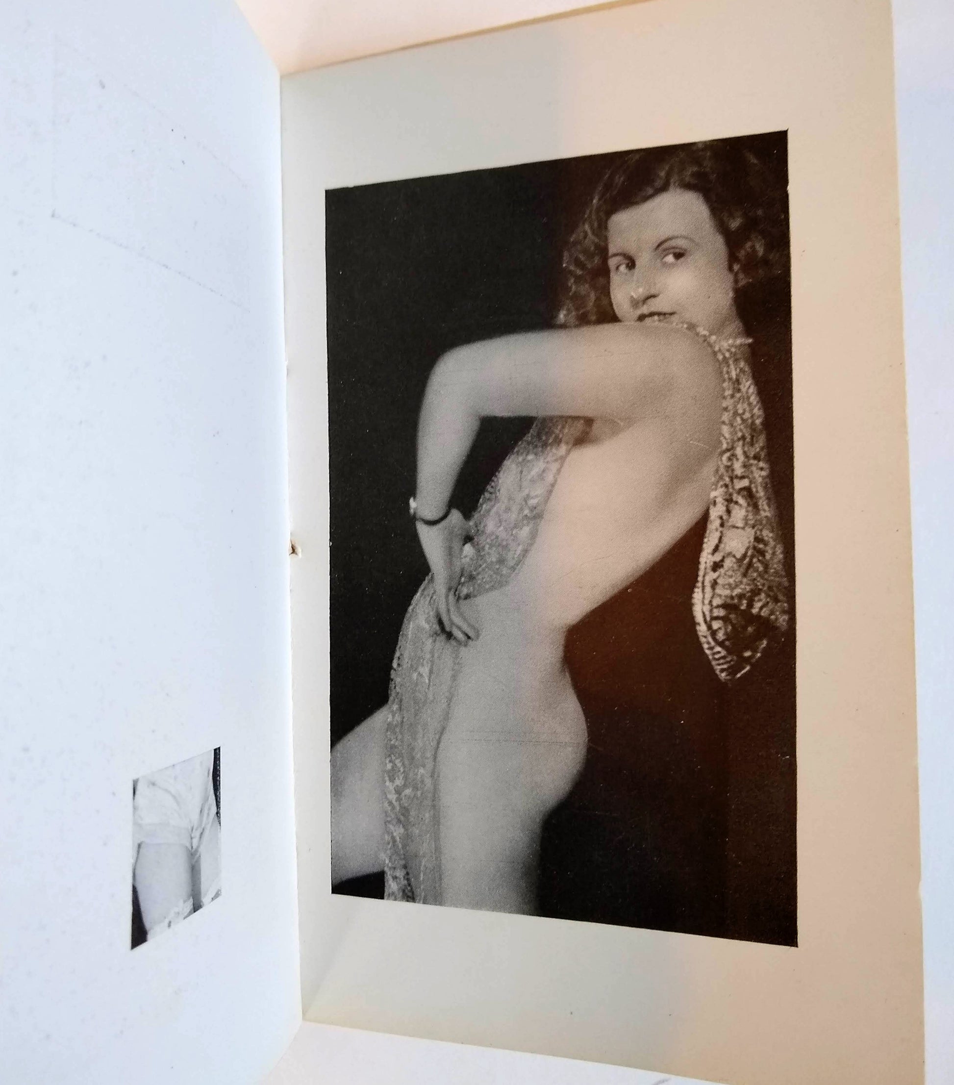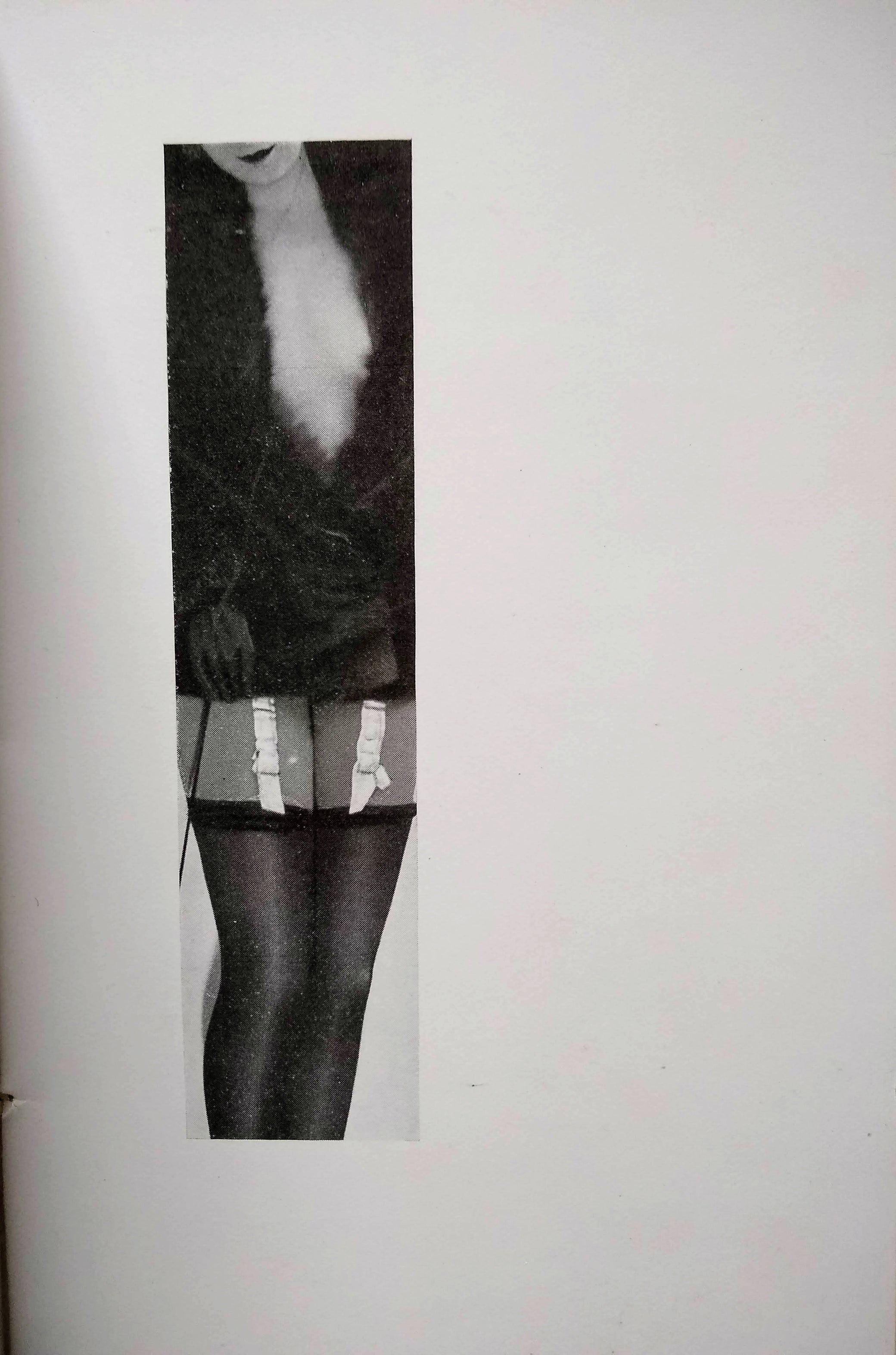 Several editions bearing the title “Sous la jupe” were issued by Couvre-Feu between 1933-1935. They differ considerably from this rather avant-garde example and priority has not been convincingly established: one was unillustrated, another included extracts of several erotic stories with only scattered illustrations, a third was a promotional list of erotic publications, and an English variation was issued by Éditions Richepanse in 1935. Nevertheless, it is possible to match some of the “detourned” images in this artistic edition to others by the Studio Biederer and from the Diana-Slip catalogues.