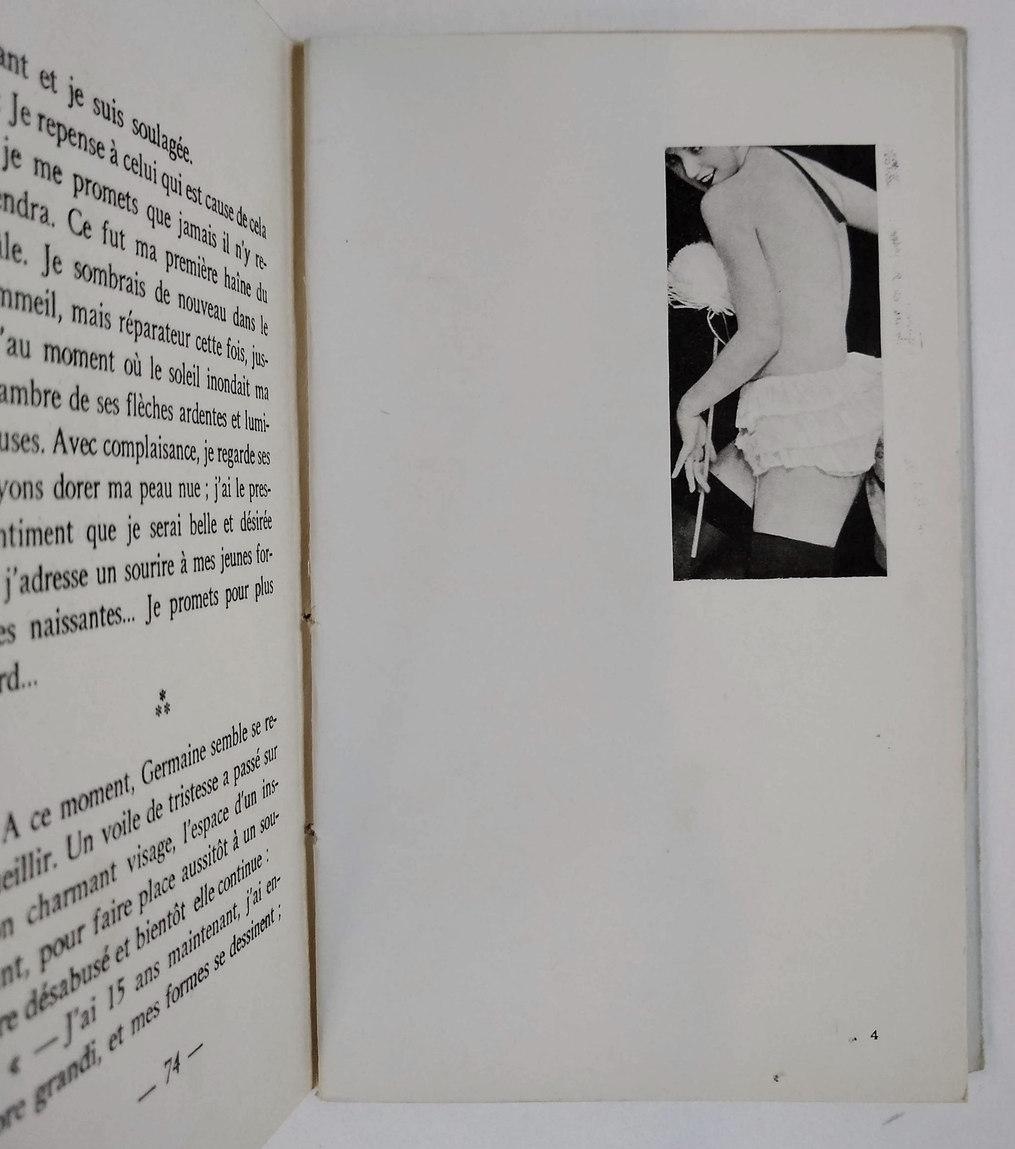 Erotic fiction illustrated with 28 bw pls., most printed recto, some also verso; in orig. wrapper with color d.j., d.j. beginning to split at spine, edges worn, else very good. D.j. with misprint “Nombreuses illustrations sujestives” [sic] described by Pia.