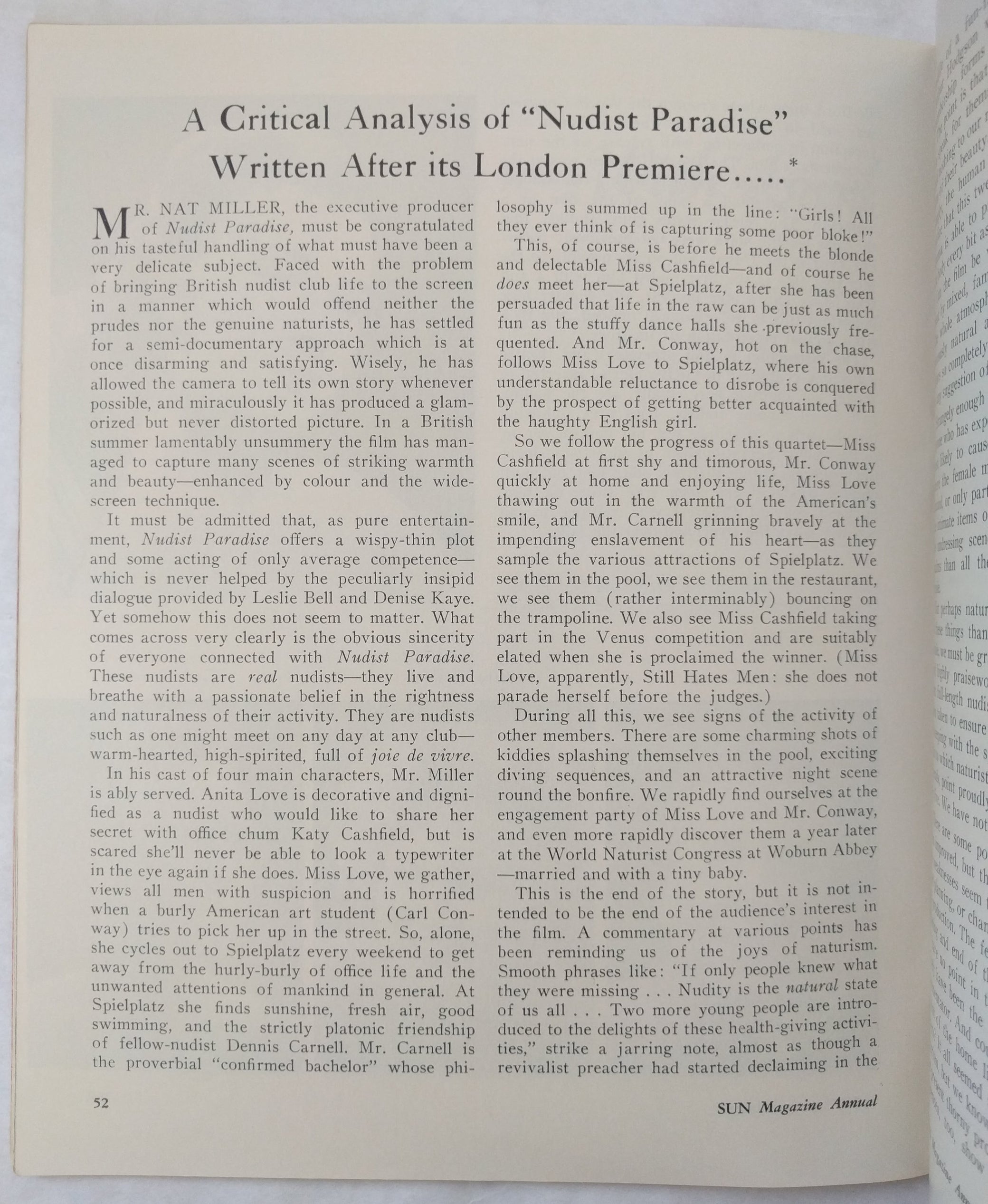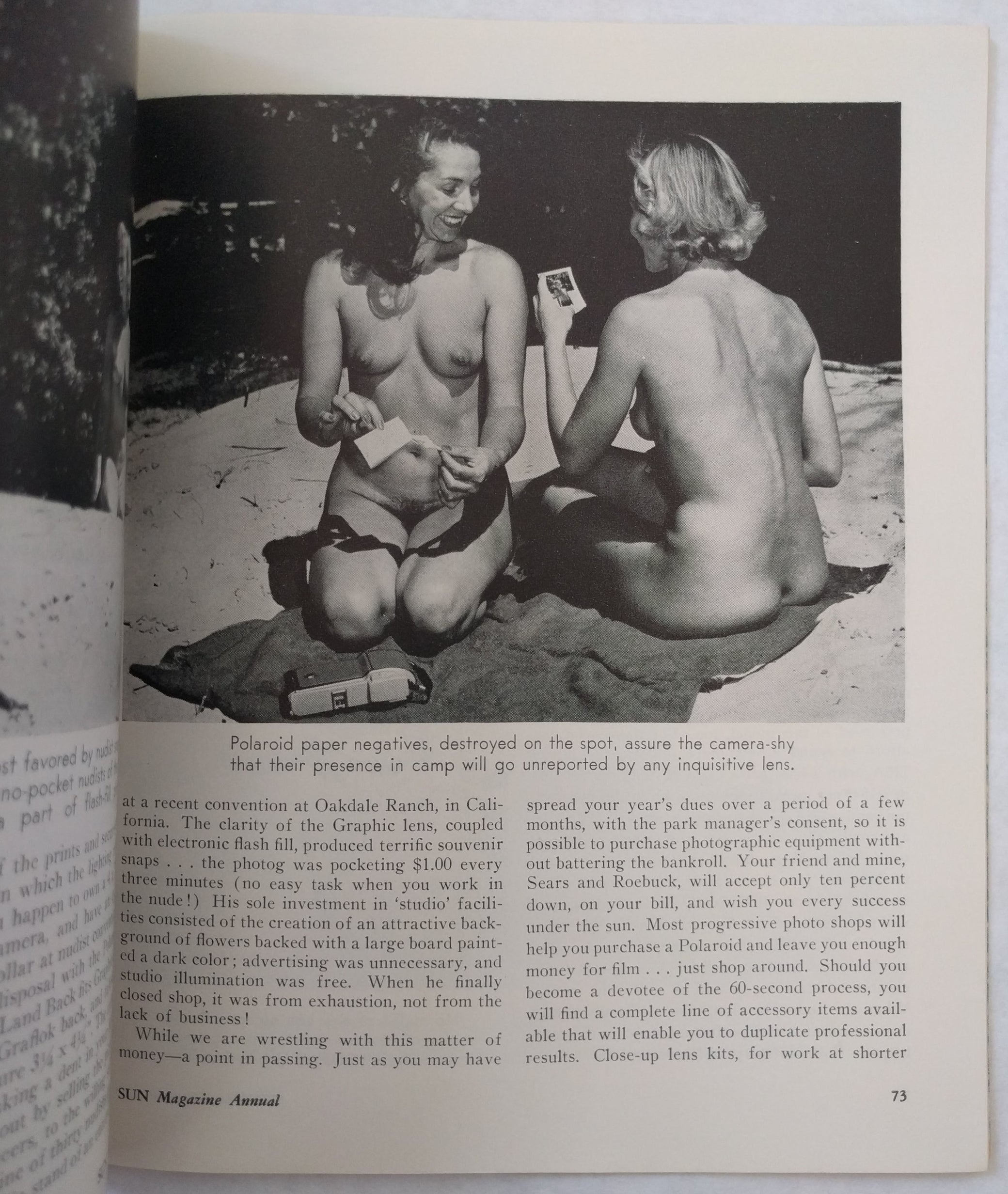 An annual roundup of international “social nudism” by the publishers of Sun Magazine. Photo essays and texts explore nudist vacations in the US and Europe, with topics relevant to foreign customs and campgrounds. A number of essays are of special interest: including the value of the Polaroid to the nudist community, a lengthy review of the “first” nudist movie, “Nature’s Paradise” (1959), and sociological commentary about the evolving nudist movements in Britain, Denmark, and France: “The Silent Revolution.”