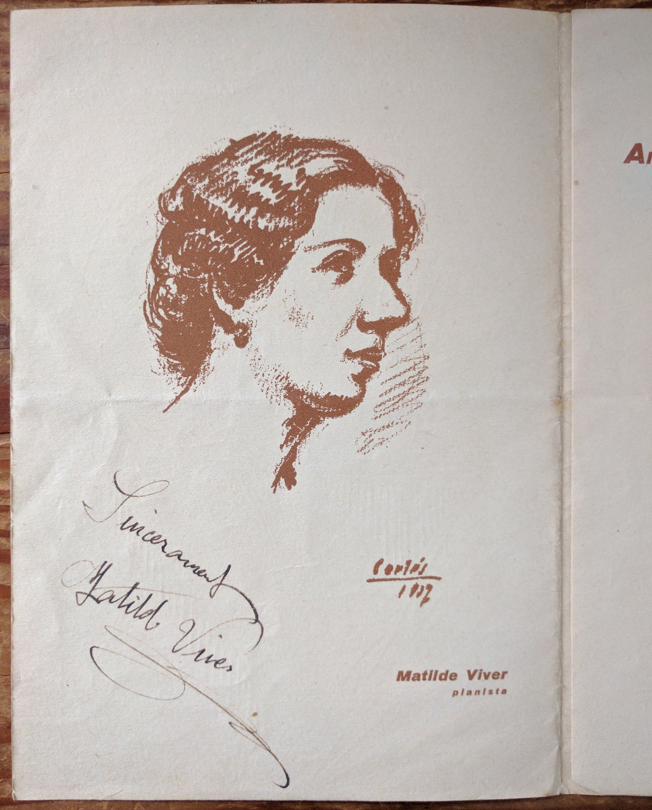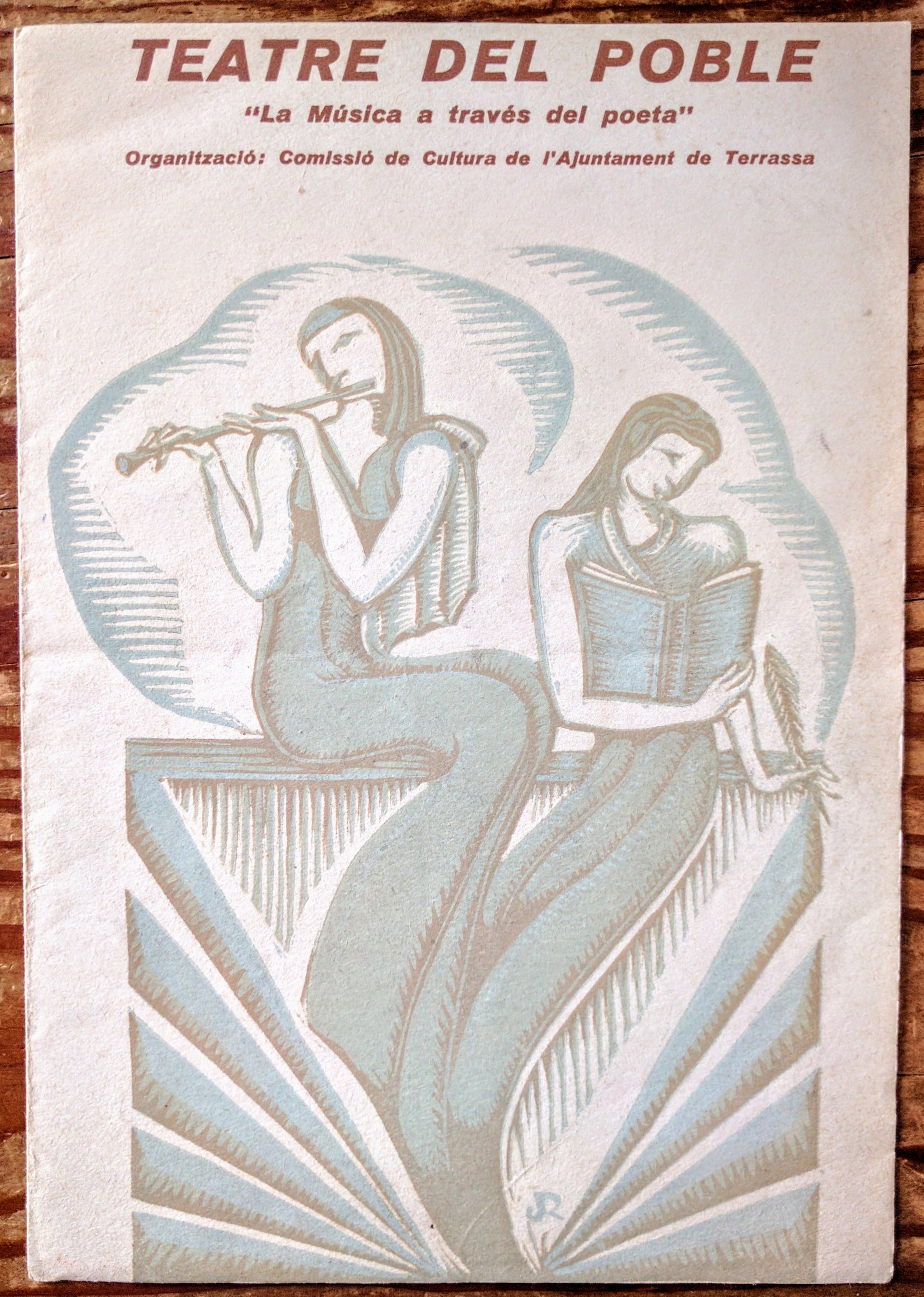 Comissió de Cultura de l’Ajuntament de Terrassa. Teatre del Poble: La Música a través del poeta. Terrassa, Spain: Salvatella, 1937. Tri-fold, single sheet program, folded: 8-1/2 x 6 in., [6] pp.; approx. 1/2 in. neat closed tear at bottom edge, else very good; signed in ink by soloists Matilde Viver and A. Pons I Guitart.
