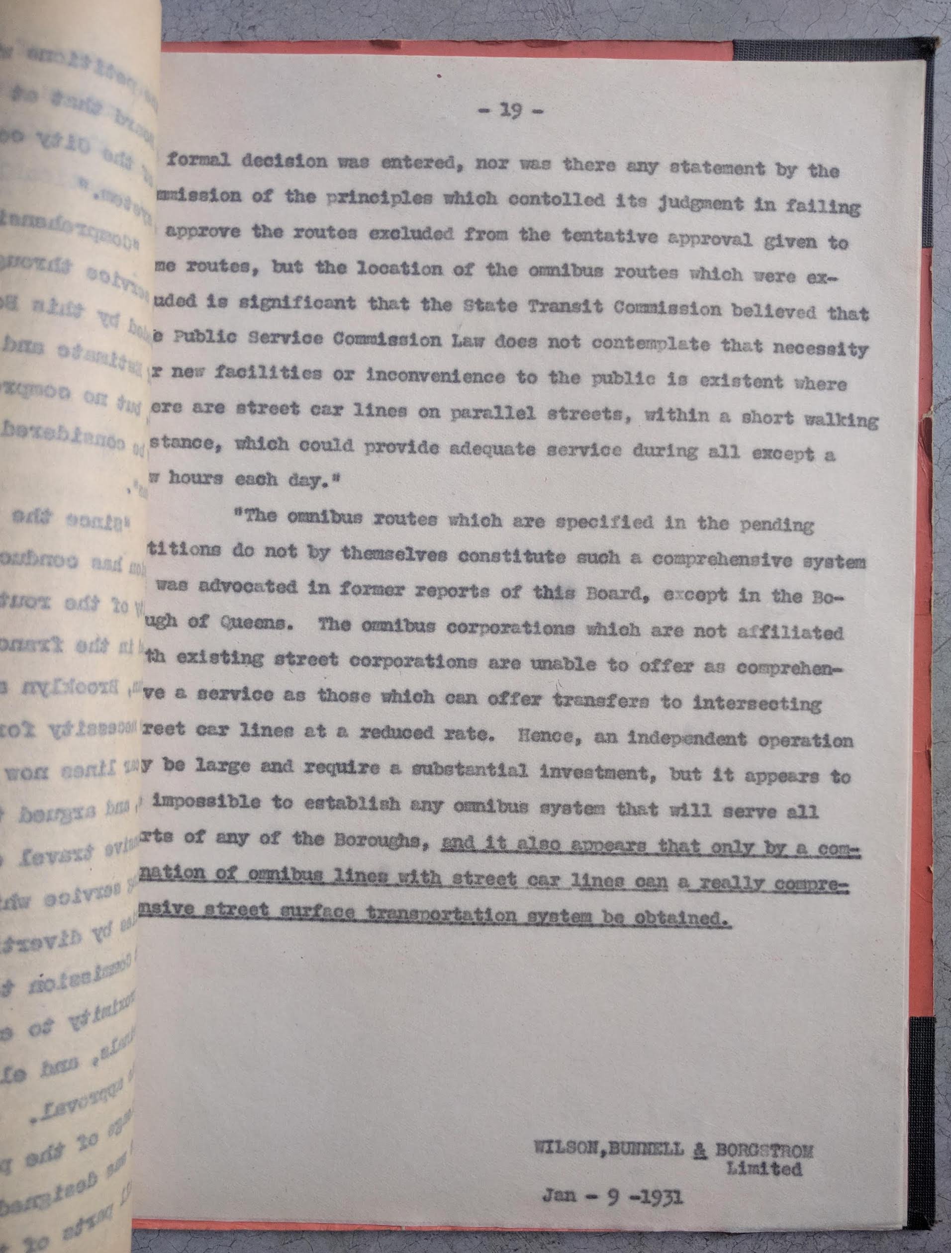 (Urban Planning) Wilson, Bunnell & Borgstrom, Ltd. The Re-organization of the Transport Services in Me´xico City [cover title]. [Toronto; Me´xico, D.F.?]: 1931. 4to, [74] typescript leaves; typed note from architect Jose´ Luis Cuevas laid in; stiff-paper folder with prong fastener, edge-worn with small closed tear, else very good. Unrecorded Canadian report advising the Mexican government about changes to public transportation in Me´xico City. Me´xico City's first electric trams went into service in January, 1900 and the Mexican Tramway Company, the largest operator, was largely Canadian owned. Fifteen years later motor-buses and jitneys appeared and competed with the tramways to provide increased mobility in the rapidly expanding capital. By 1930 there were 1.24 million people living in the city, and public transportation was reaching a crisis. This report by a Canadian landscape architecture firm was commissioned by Me´xico to look at the relationship between rail and buses during a period of intense competition in which fares had been driven lower than the cost of service. Following a review of North American transportation systems and existing Mexican demographics, the report concluded that buses could not supplant rail in Me´xico City and that a single co-ordinated system will best serve passengers. (Despite the city's history of decentralized and informal public transit.) Most devastatingly, the report inaccurately estimates the city's future growth and rejects the idea of a rapid transit system. This copy presumably that of commission member Jose´ Luis Cuevas (1881-1952), a pioneer of urbanism and urban planning in Me´xico City. In the 1920s he designed two of the city's greenest neighborhoods: Condesa-Hipodromo and Loma Chapultepec. In his note he writes that the report has changed his mind about the continuation of the tramway system. Not found in OCLC. SOLD