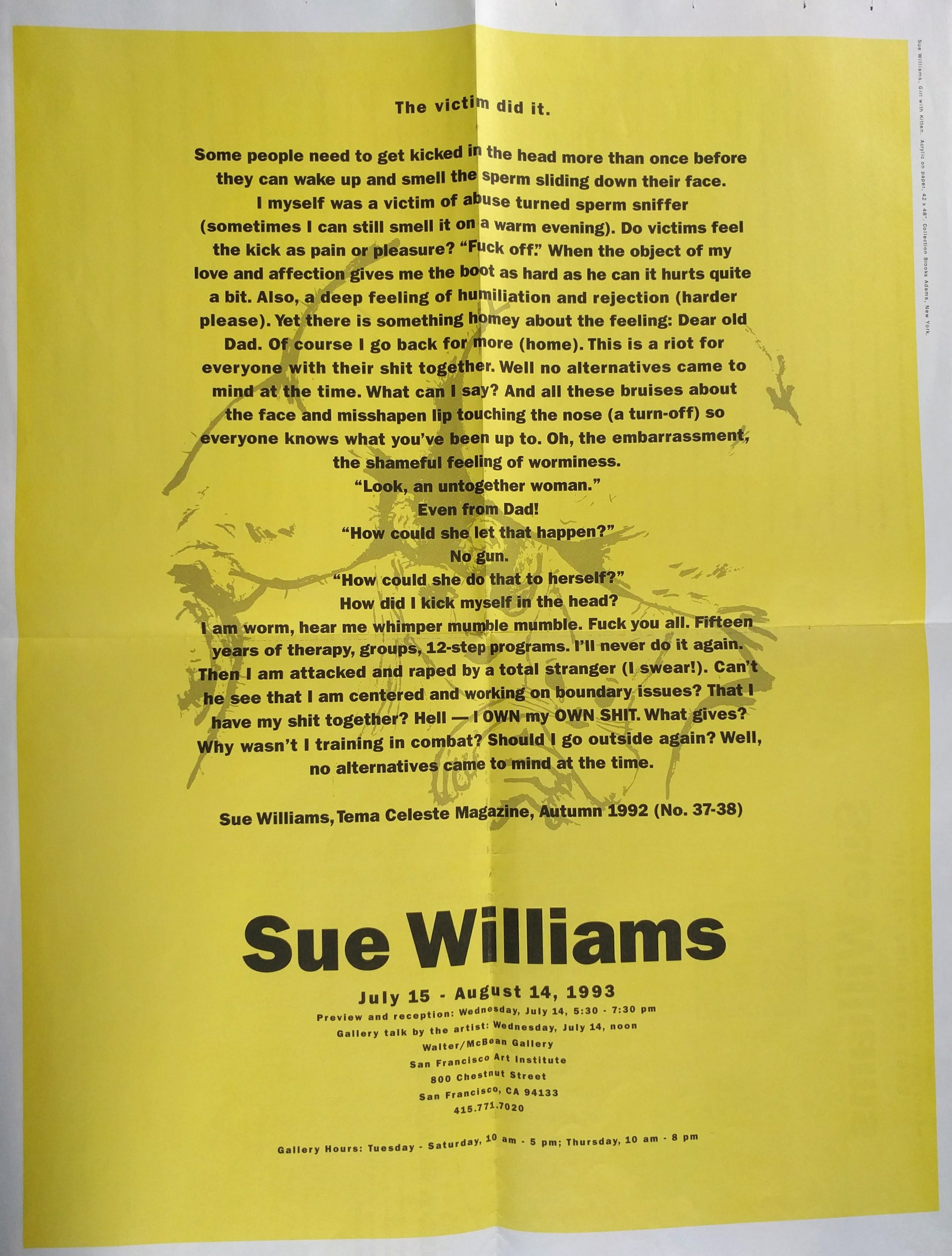 Williams, Sue. The victim did it. Poster for an exhibition held at the San Francisco Art Institute, July 15 – August 14, 1993. San Francisco: San Francisco Art Institute, 1993. Single sheet mailing unfolds to poster, 22-1/2 x 17-1/2 in.; offset color reproduction overlaid with prose by Williams, descriptive text verso, double-folded as issued, pinholes on one edge, else very good.