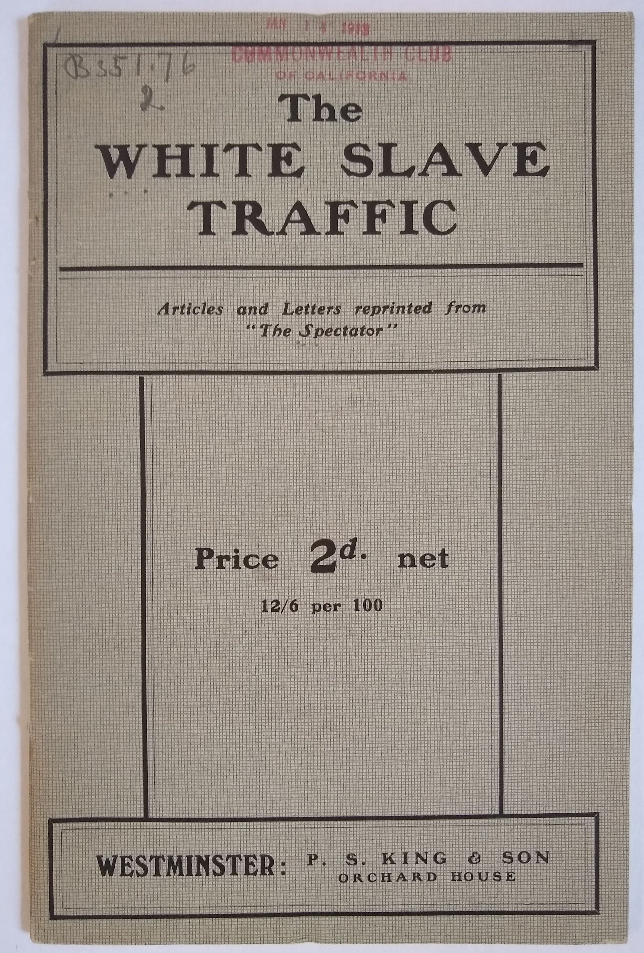 (White Slave Traffic) (Jewish) The Spectator. The White Slave Traffic: Articles and Letters Reprinted from “The Spectator.” Westminster, UK: P.S. King & Son, 1912. 8vo, 27 pp.; stapled printed wrapper, a bit worn, with ex-library stamp and penciled shelf label.