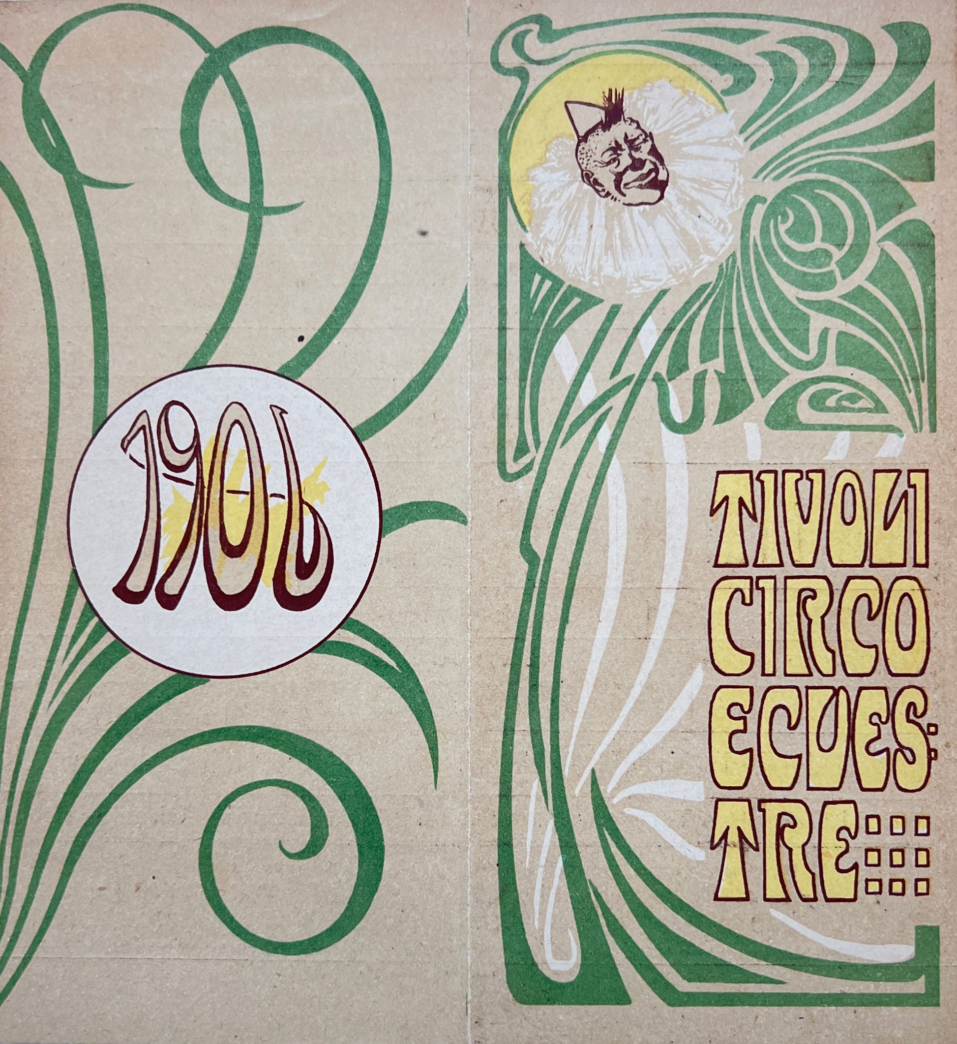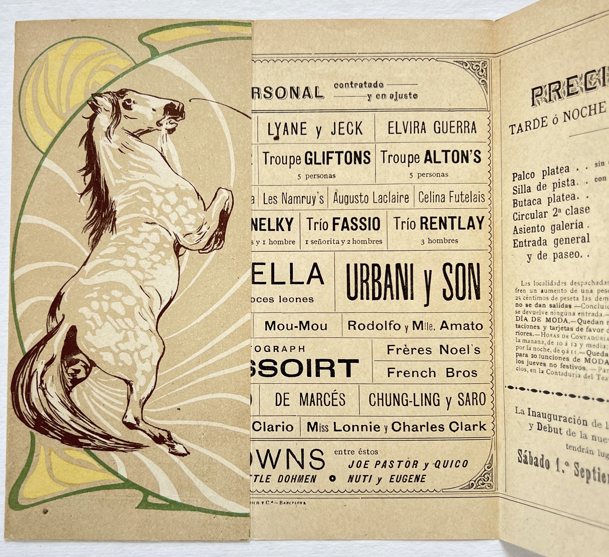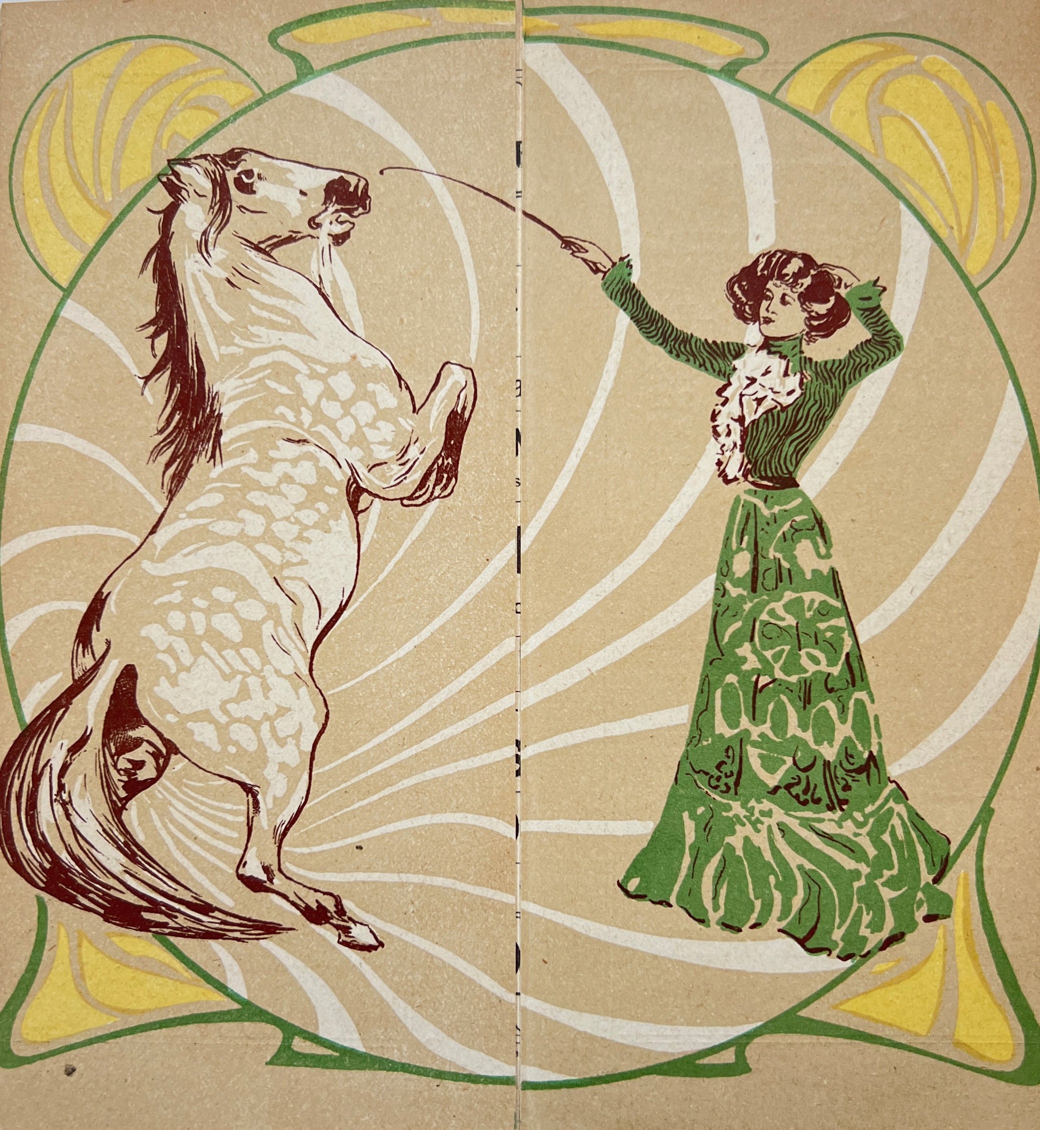 Vibrant Art Nouveau program advertising the 1906 circus season at the Tivoli theater in Barcelona. That season the company featured the likely subject of this illustration: one of the first female Olympians, equestrian Elvira Guerra (Italian, competed in Paris, 1900). Other items of note on the playbill: magician Chung-Ling Soo (aka William Ellsworth Robinson); and the incorporation of a cinema projection (Vitagraph).