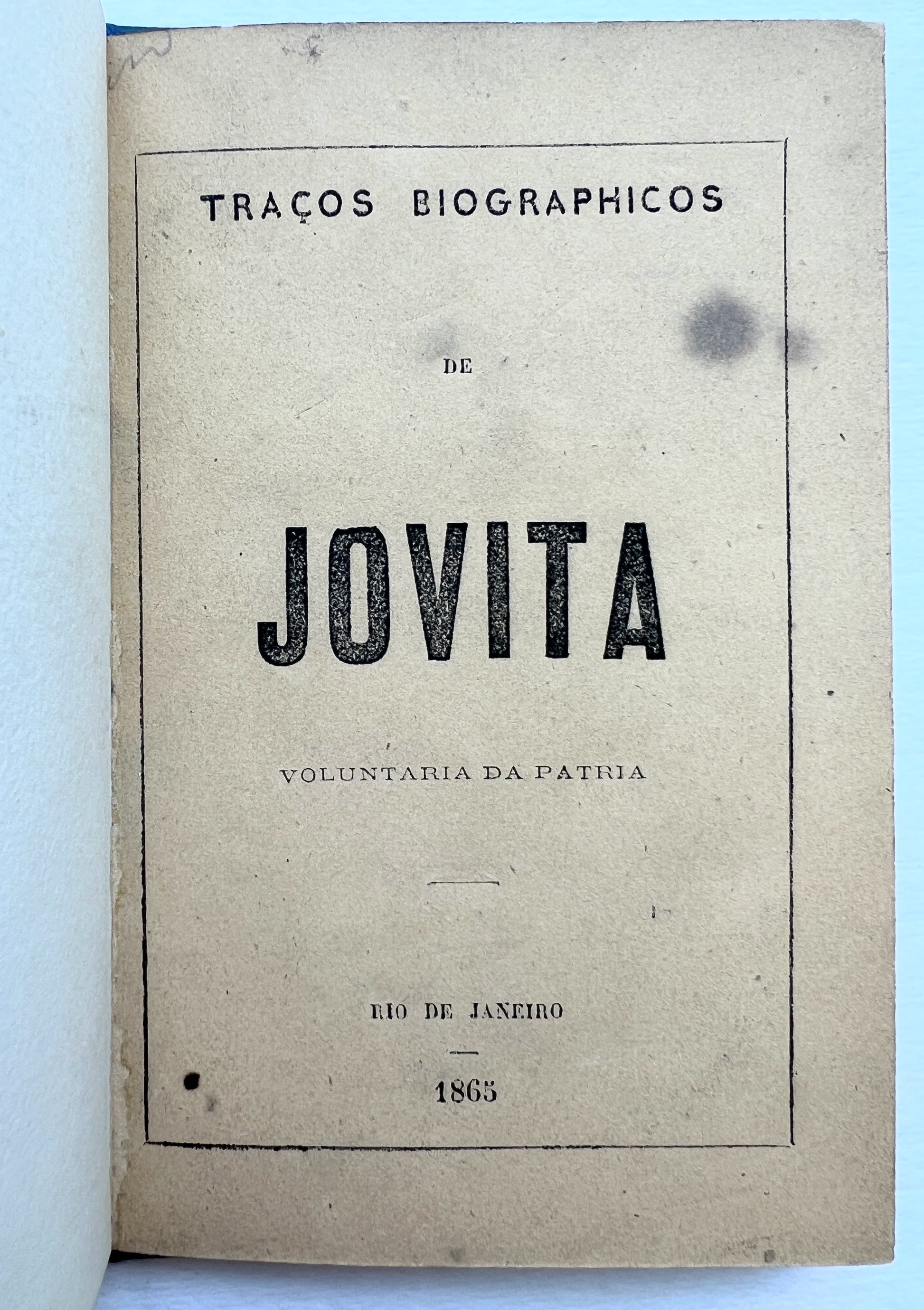 This volume was published shortly after her arrival to Rio in September 1865 and includes a long poem celebrating her honor and bravery. It is the first biography of the national war heroine known today as simply “Jovita.” Two North American holdings recorded in OCLC: Stony Brook and UCLA. SOLD