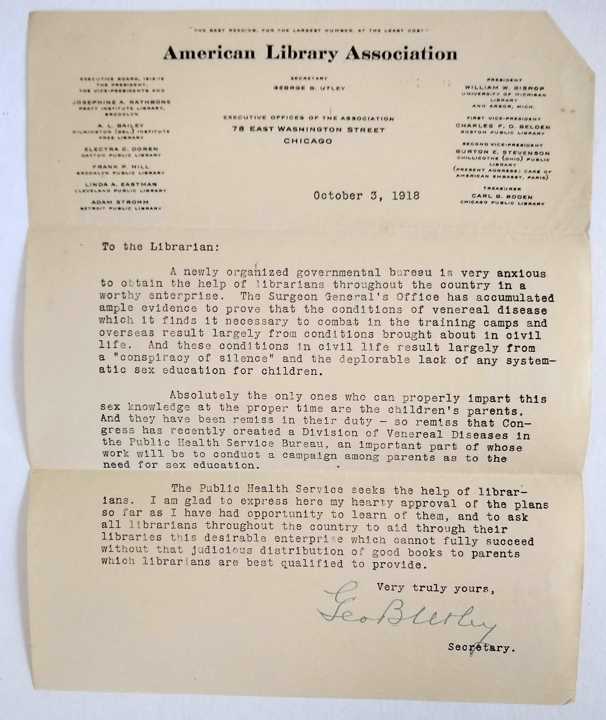 Comprising: Office of the Surgeon General, US Public Health Service, 1918. Letter from Surgeon General Rupert Blue to Librarians of the United States, October 3, 1918. Single sheet, typed, with Blue's duplicated signature, lower right hand corner folded, two creases from original mailing. Together with: American Library Association. Letter from Secretary George Utley to Librarians, October 3, 1918. Single sheet, typed, with Utley's duplicated signature, creased, upper corner folded.