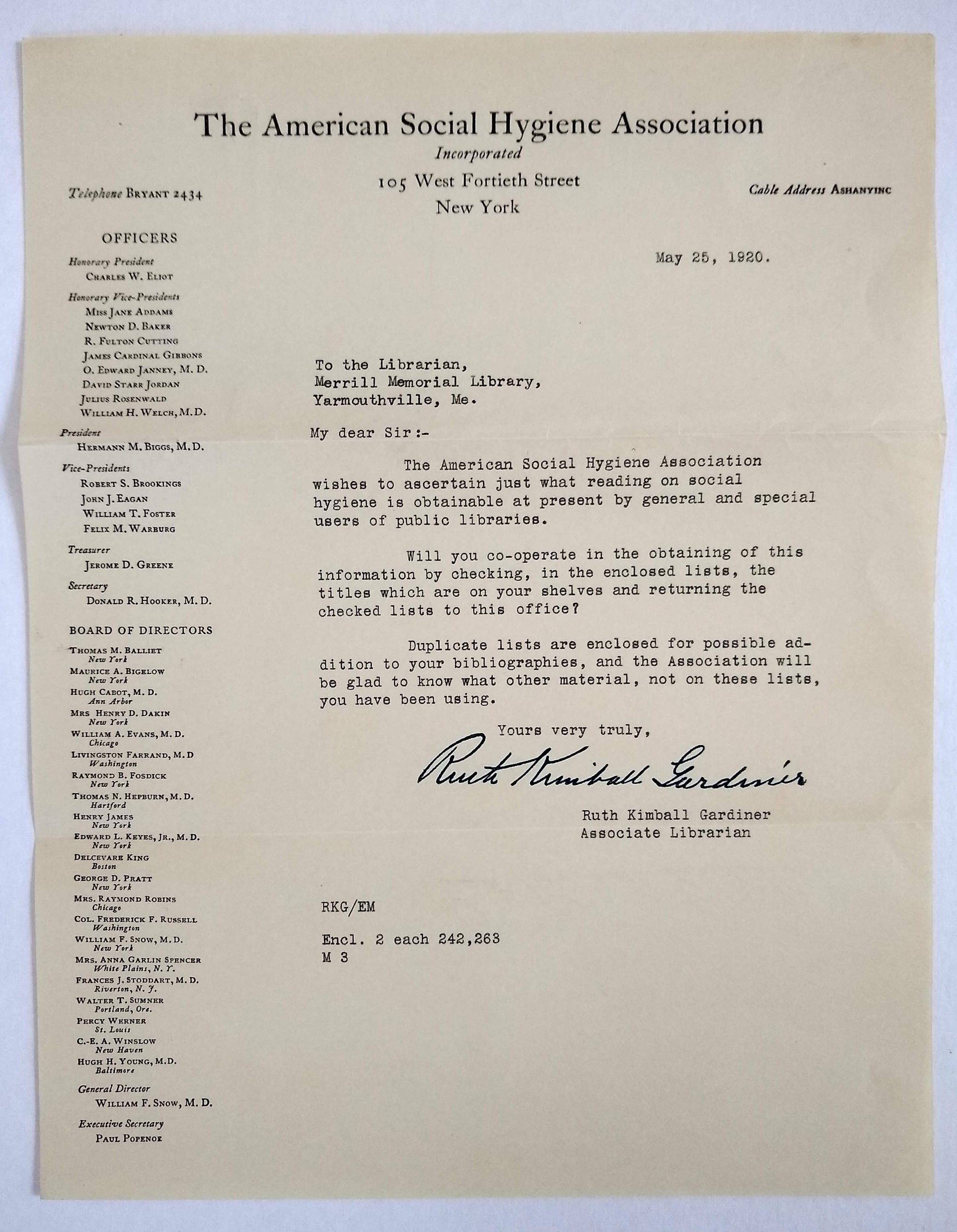 The first letter requests support of librarians in the civic fight against venereal disease. The Surgeon General's office will be preparing “an accredited list of books of instruction [for young men and women]” to be distributed in libraries “in such a way that their interest will be aroused.” The second, from the American Library Association, expresses approval of the Surgeon General's plan to ask librarians to aid their enterprise in the “judicious distribution of good books.” Together with a TLS from the American Social Hygiene Association to a library in Maine requesting information on what social hygiene reading is available at their location.