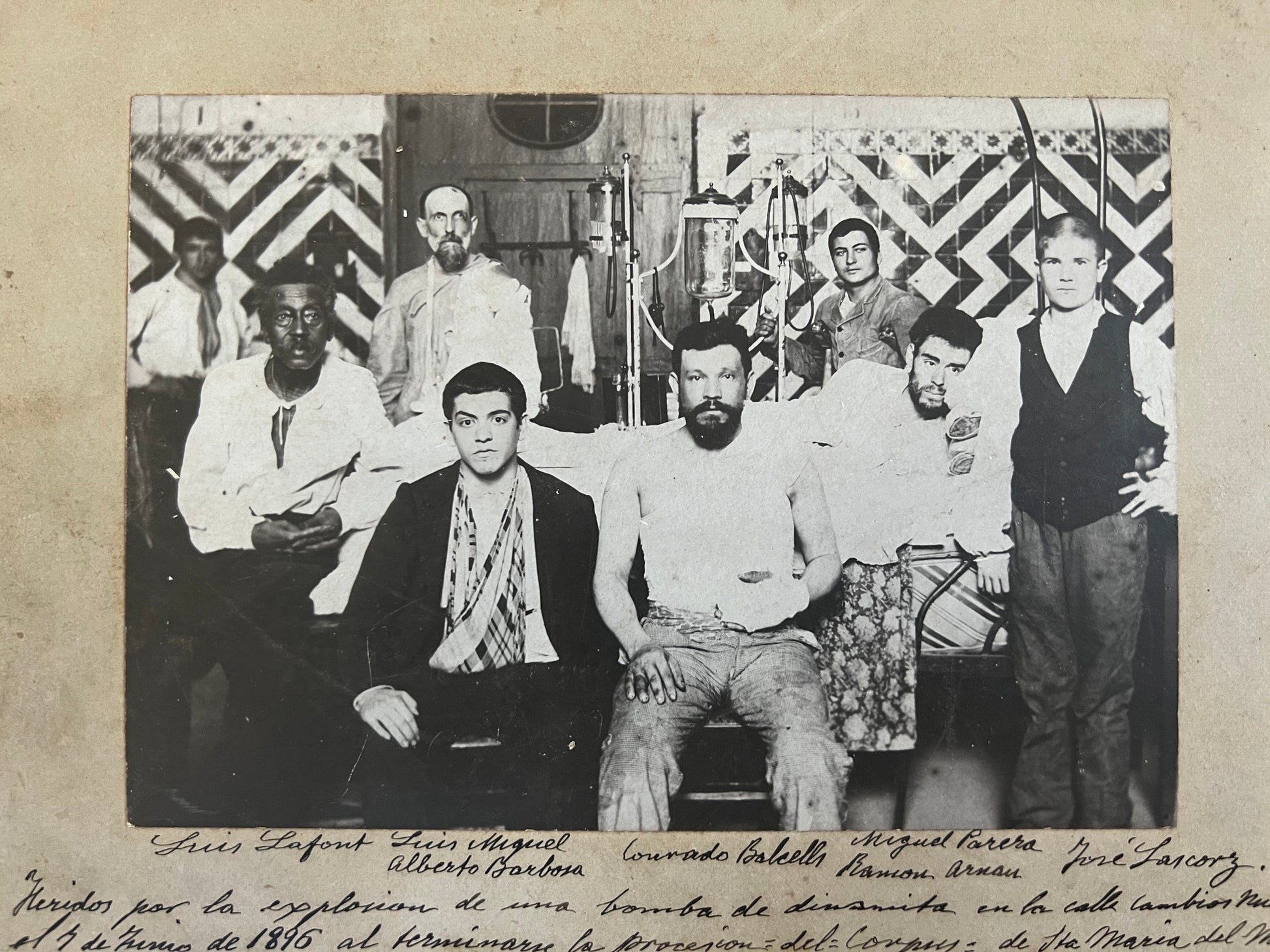Scarce primary source documentation of early anarchist actions in Barcelona, a period of violent engagement that radicalized many Europeans. The earlier photograph documents 8 of the approx. 64 people wounded by the bombing of a Corpus Christi procession in Barcelona on June 7, 1896. Although no one claimed responsibility, municipal authorities and the police blamed militant anarchists and used the violence as a pretext to arrest and torture hundreds of anarchists and labor organizers, eventually sentencing five men to death at Montjuic. The real perpetrators were never found, and circumstantial evidence has led many to believe it was a false flag operation, since the bomb went off among the working-class crowd, rather than amongst the high-ranking politicians and church officials in the parade itself.