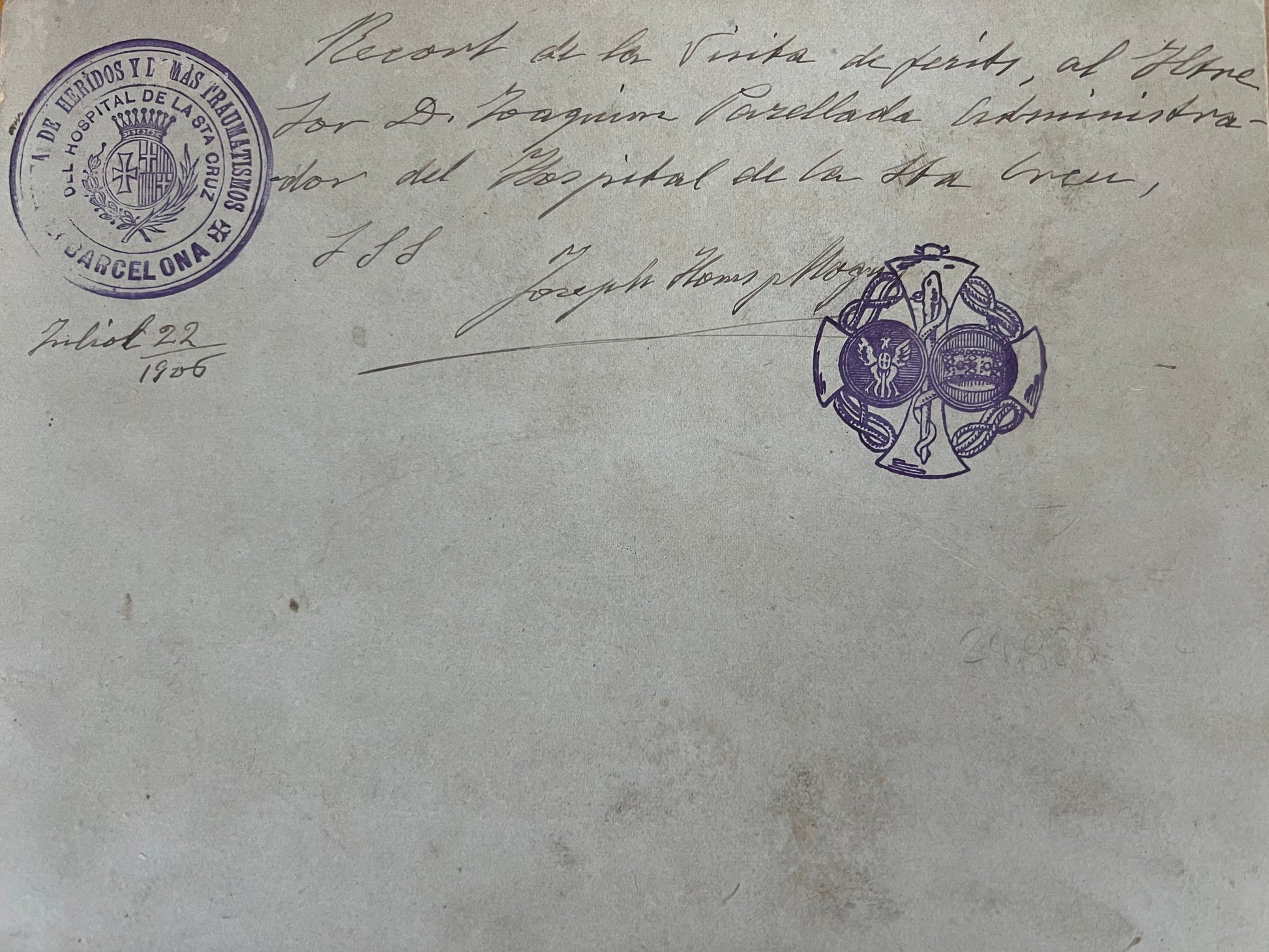 Both mounted to heavier tan card, with substantial manuscript annotations recto, one stamped “Vista de Heridos y Demas Traumatismos Del Hospital de la Sta. Cruz Barcelona”. Verso with additional stamps and later annotations and signatures (by an administrator?) dated July 1906. Photos a bit worn, card on latter with some flaking and splitting, not affecting the image.