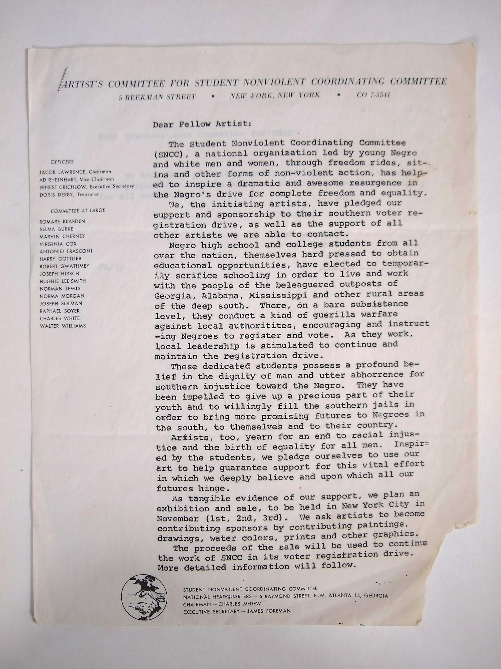 Jacob Lawrence was the Chairman of the artist's fundraising committee for the iconic civil rights organization, the Student Nonviolent Coordinating Committee. Here is a form letter from Lawrence to other artists on behalf of SNCC's artist committee, describing a forthcoming exhibition and sale in support of the SNCC's southern voter registration drive. “Artists, too, yearn for an end to racial injustice and the birth of equality for all men. Inspired by the students, we pledge ourselves to use our art to help guarantee support for this vital effort in which we deeply believe and upon which all our futures hinge.”