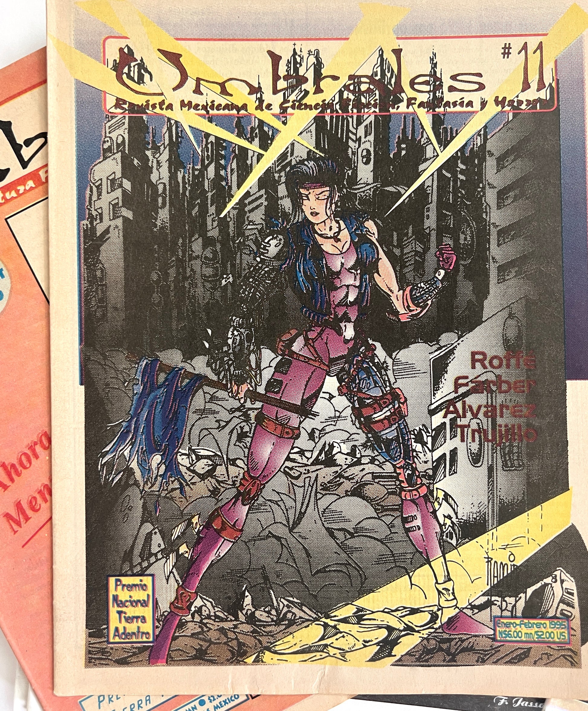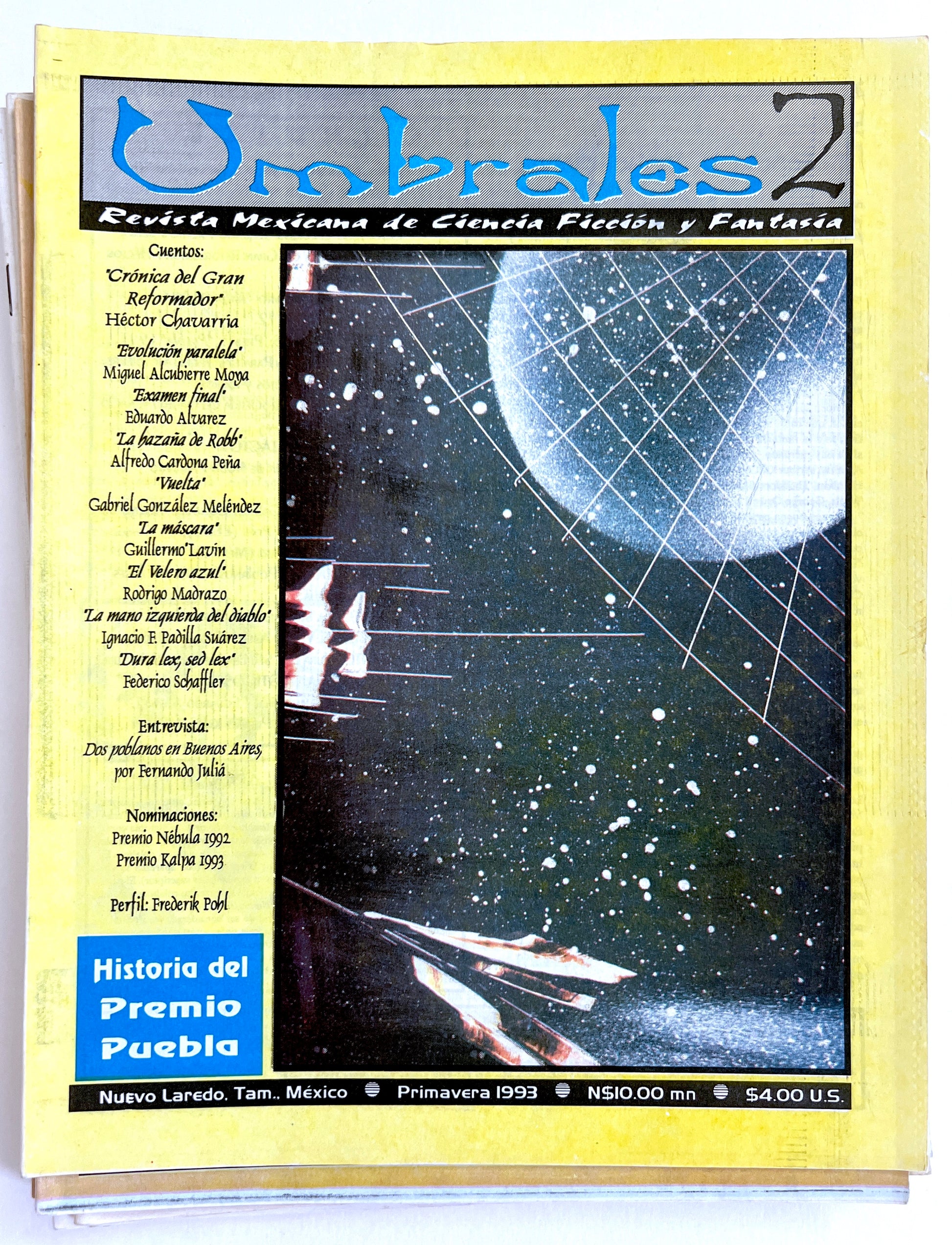 Nine issues of one the most oft cited and long-lasting Mexican sf publications of the 1990s, the first issue appearing in late 1992 and the last (no. 49) in 2000. Despite its reputation, OCLC lists no holdings of the magazine in North American libraries. The editor, Federico Schaffer, was the first president and cofounder of the AMCyF [Asociación Mexicana de Ciencia Ficción y Fantasía]. The magazine appeared just after the AMCyF’s founding in CDMX and was dedicated to promoting Mexican speculative fiction in the absence of other publishing opportunities and provided space for original writing as well as analysis and historiography of Mexican sf. Its large format and professional printing distinguished it from other sf serials and fanzines including ¡Nahual! and fractal. A few erotic stories feature include content that violated anti-gay Mexican legal content standards (not repealed until 1998/1999).