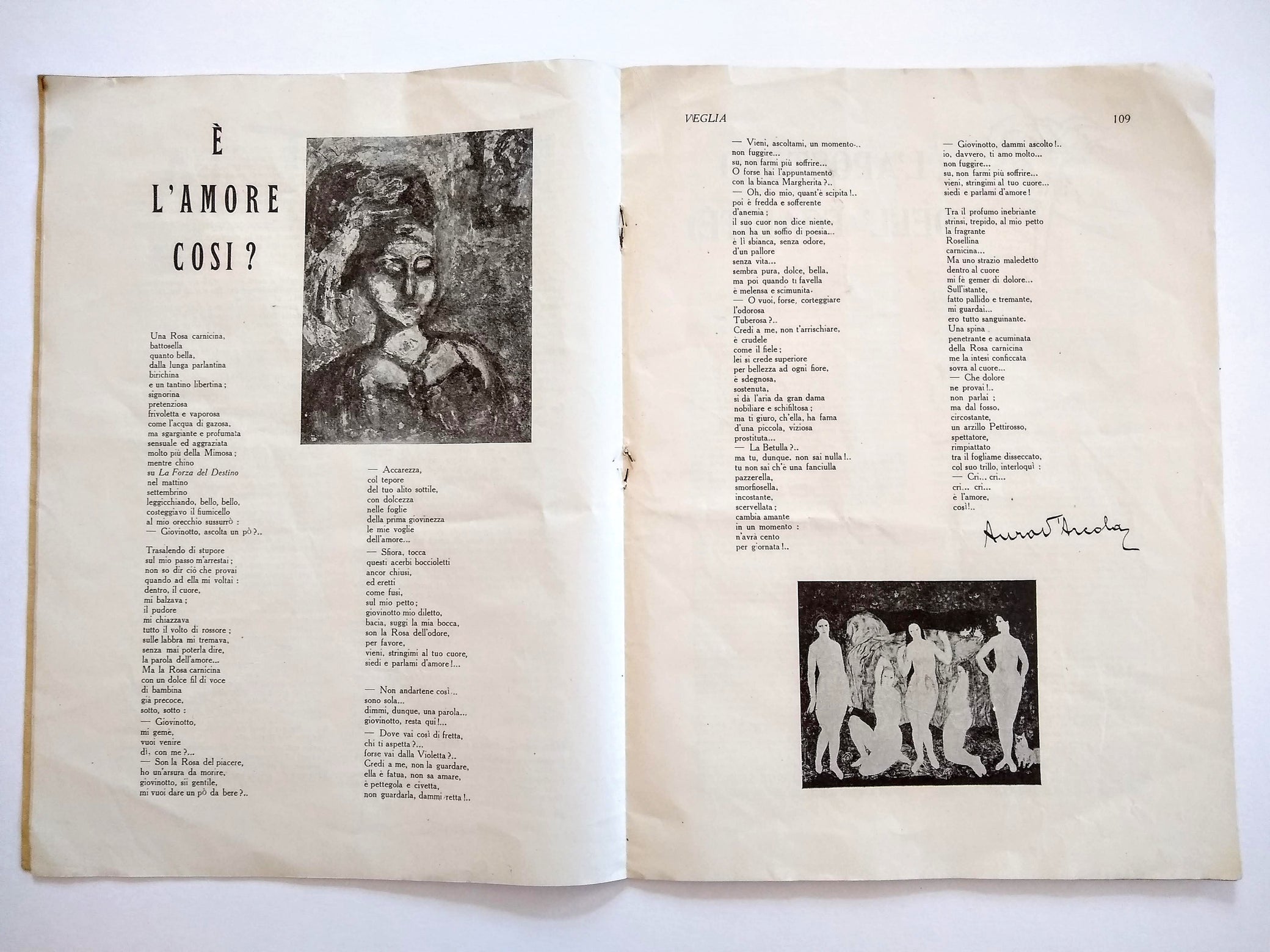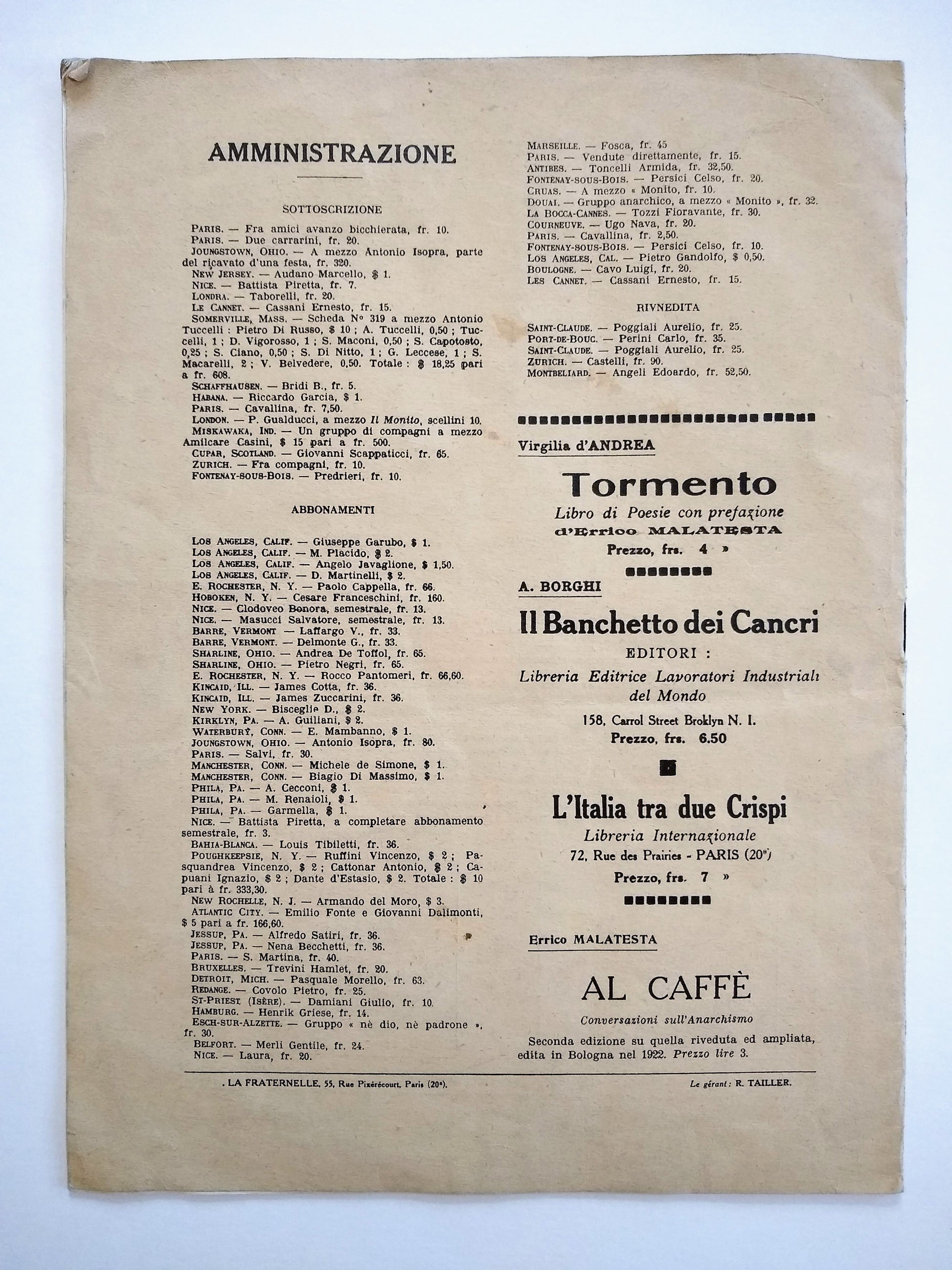 D'Andrea, Virgilia, Ed. Veglia: Anarchica Mensile. Anno 1, No. 5 (Oct.-Nov. 1926) through Anno 2, No. 7 (Apr.-May 1927). Paris: Imp. La Fraternelle, 1926-1927. Three issues, 4to, numbered continuously [97]-168 pp.; with bw reproductions of various artworks and graphics throughout, toned and worn, with warping near staples; in stapled illus. wrpprs., with wear at corners and spine, No. 6 with lower fore-corner separated but present. Virgilia D'Andrea (1888-1933) was a poet and leader of the Italian anarcho-syndicalist movement, Unione Sindacale Italiana, from 1919-1920, during the so-called “red years.” Along with Errico Malatesta and her lover Amando Borghi, she was imprisoned in 1921 as part of the government's repression of their revolutionary working-class movement. In 1923, following Mussolin's consolidation of power, she and Borghi fled into exile. Settling in Paris, she continued organizing and writing. She published eight issues of Veglia, an irregular bi-monthly antifascist cultural magazine, to raise money for the anarchist community in exile and the Sacco and Vanzetti defense. In addition to her own impassioned introductory essays and poems, literary and artistic contributions to Veglia included those by well-known anarchists Felice Vezzani, Luigi Fabbri, and Albert Daenens, among others. No. 7 reproduces a letter written to D'Andrea by Nicola Sacco. Each issue ends with a summary of new subscribers and their locations in the United States and Europe, offering an unexpected geographic survey of Italian anarchist immigration. The end of Veglia's run coincided with D'Andrea's move to the US, where she became a prominent antifascist and labor organizer until her death from cancer, in 1933. Scarce. Scattered issues in five European libraries; OCLC records the only North American holding at Northwestern, incomplete. SOLD